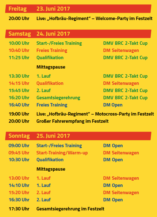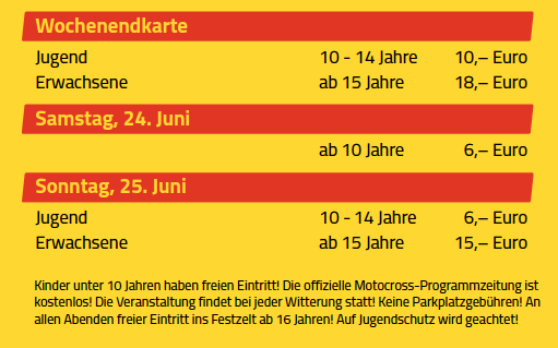 Musik und ausgelassene Stimmung in „Deutschlands schönstem Motocross-Festzelt“ direkt an der Rennstrecke • Stars hautnah und ohne Helm beim großen Fahrerempfang am Samstag im Festzelt • Einkaufsmeile an der Rennstrecke • Souvenirs für die ganze Familie beim MSC-Verkaufsstand • Kreissparkassen-Kinderhüpfburg • Kinder-Motorradbahn • Frei zugängiges Fahrerlager • große MSC-Gartenwirtschaft direkt an der Rennstrecke • atemberaubende Aussicht vom 58-Meter-Steiger • internationale und schwäbische Spezialitäten • große Rennbar • große Pils- und Weizenbierbar mit frisch gezapften Bieren • erlesene Weine • kulinarische Genüsse rund um die Motocross-Strecke
