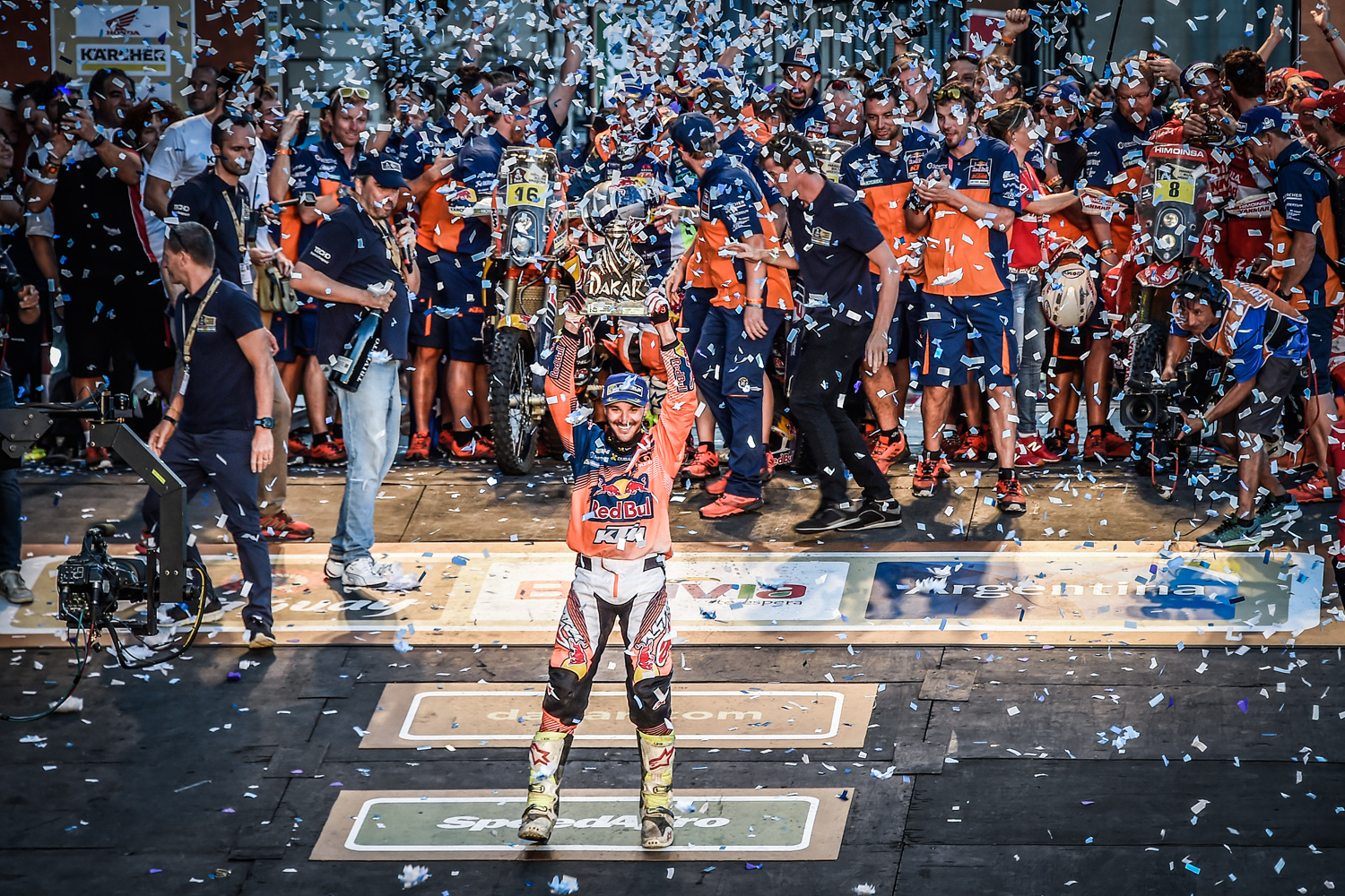 Walkner: „Das war wirklich eine anstrengende Dakar, deshalb ist es ein umso großartigeres Gefühl, in Buenos Aires auf dem Podium zu stehen. Ich hatte ein hartes letztes Jahr, jetzt hier zu stehen, ist wie ein wahrgewordener Traum. Den schwierigsten Moment hatte ich während Etappe 10, da bestand die Möglichkeit, dass sich meine Position ändert. Vor der Etappe habe ich mir das Roadbook ganz genau angeschaut, um mir hoffentlich einen Vorteil zu erarbeiten. Das hat sich glücklicherweise ausgezahlt und es fühlt sich gut an, so belohnt zu werden.“