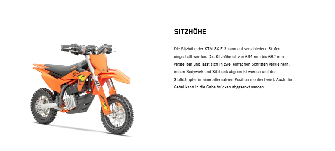 Der ideale Einstieg in den Motorradsport –und möglicherweise der Beginn einer lebenslangen Leidenschaft! Die KTM SX-E 3 ist ein hochmodernes, vollelektrisch angetriebenes Mini-Cross-Motorrad, gedacht für unsere jüngsten Rennfahrer. Eine neue Generation von Bikes, die die nächste Generation von Fahrern begeistern wird. Die KTM SX-E 3 reiht sich unterhalb der leistungsstärkeren KTM SX-E 5 ein, bietet aber ein ausgesprochen nutzerfreundliches Paket, hochwertige Bauteile und das READY TO RACE-Design. Dank einer gut zu handhabenden Leistung, einer großzügigen Akkukapazität und einer individuell anpassbaren Ergonomie ist sie die perfekte Wahl für Kinder, die vom Laufrad auf ihr erstes richtiges Bike umsteigen wollen. Geräuscharm, einfach und Fun pur! Auf die Räder, fertig, los!