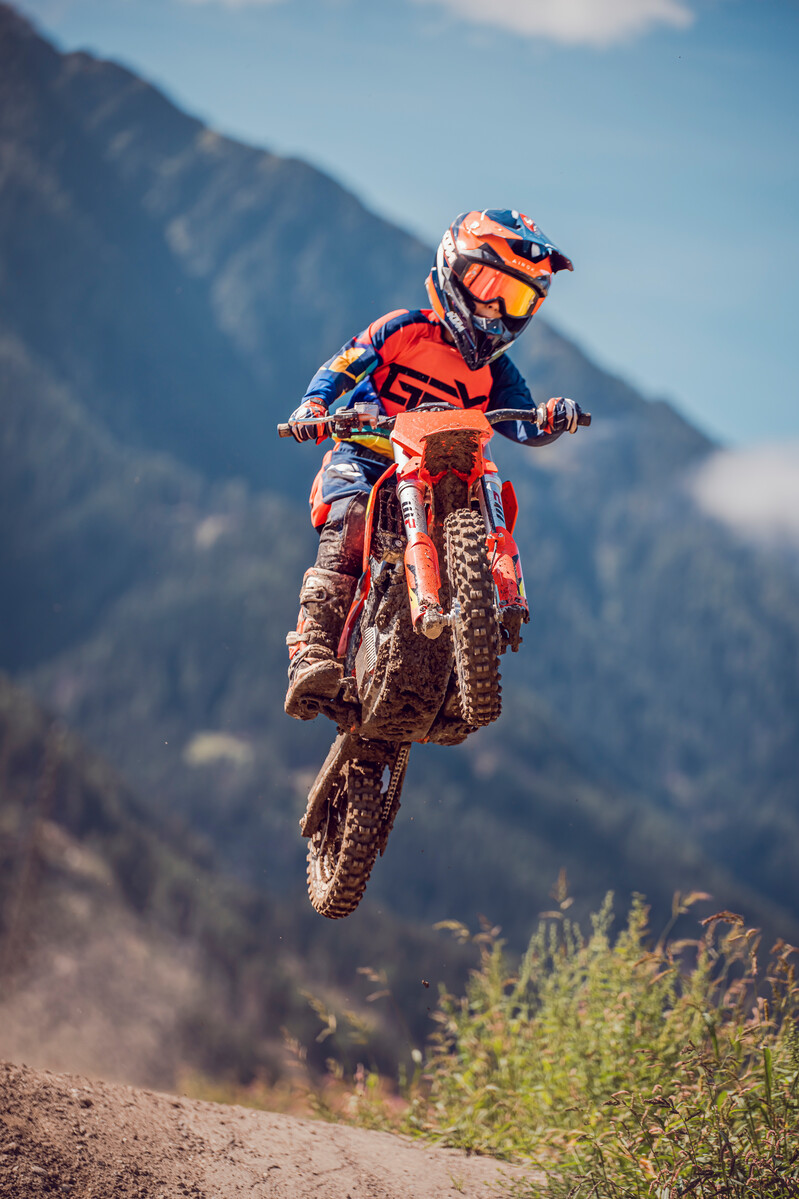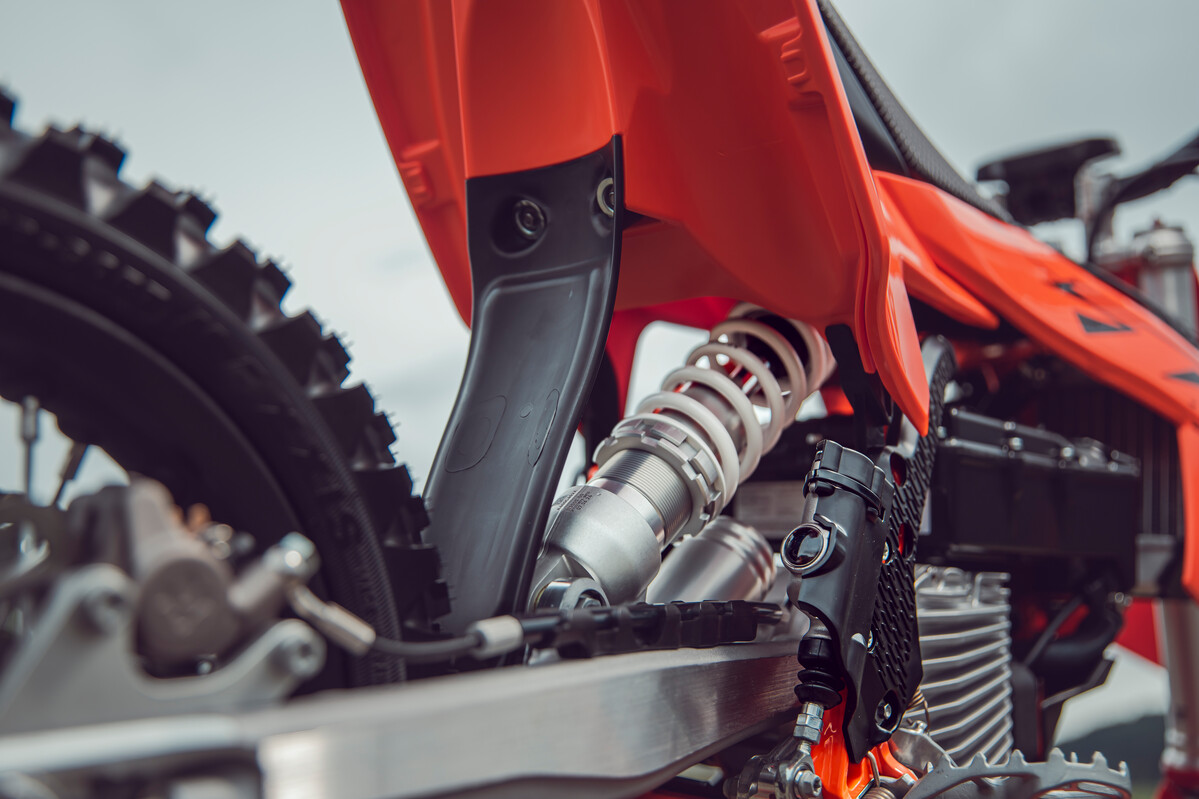 Einer der größten Vorzüge der KTM SX-E-Modelle ist die verstellbare Größe der Bikes. Der Ausleger aus leichten, glasfaserverstärkten Kunststoffelementen kann in verschiedenen Positionen montiert werden und sich so an das Wachstum des Juniorfahrers anpassen. Die Sitzhöhe kann zwischen 634 und 682 mm eingestellt werden. Dazu lassen sich Sitzbank und Bodywork einfach nach oben oder unten verschieben. Eine noch niedrigere Sitzhöhe kann erreicht werden, indem die Gabel in der Gabelbrücke nach unten abgesenkt und die Montageposition des Federbeins geändert wird. Der Rahmen ist aus leichtem, hochfestem Chrom-Molybdän-Stahl geschmiedet, um präzise Beweglichkeit und Stabilität zu gewährleisten. Eine neue Modifikation am Modell 2025 sorgt jedoch für noch mehr Robustheit, ein noch besseres Handling und einen stabileren Befestigungspunkt für das Federbein.