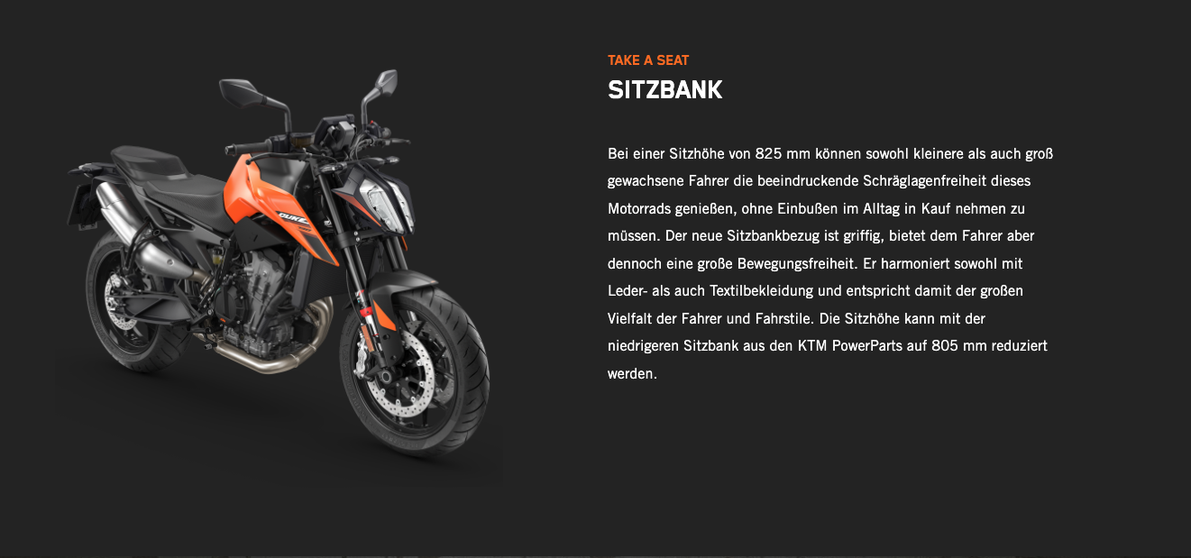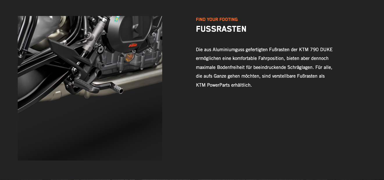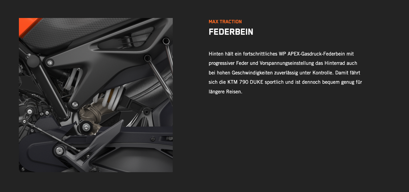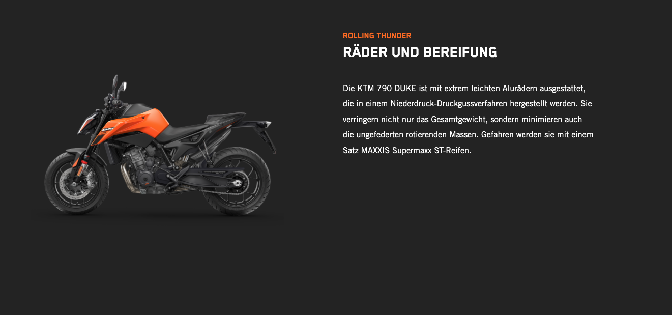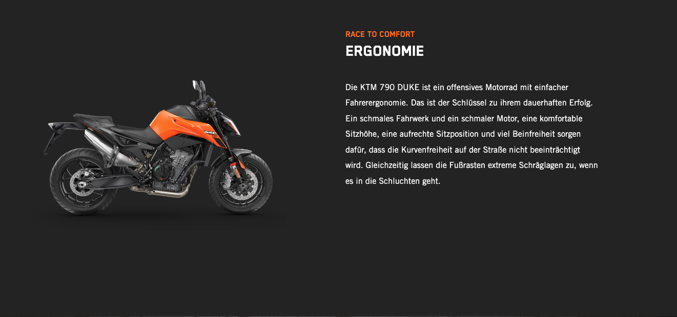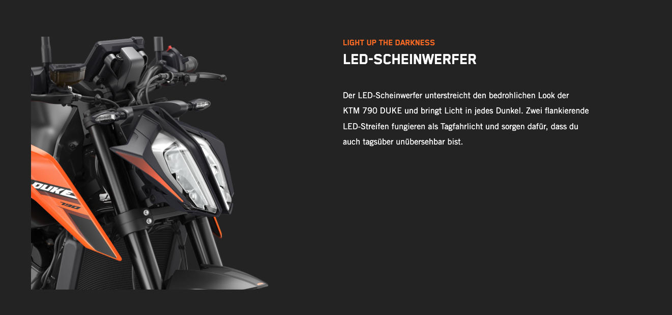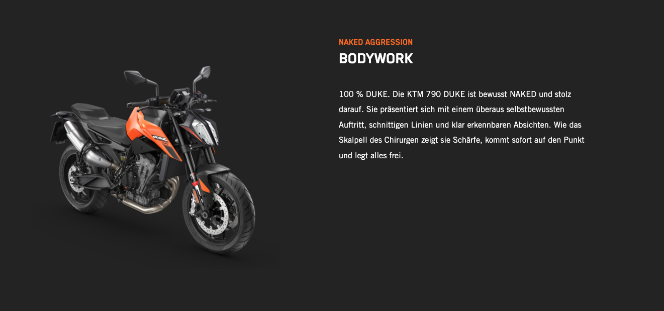Die KTM 790 DUKE genießt einen erstklassigen Ruf. Bekannt ist sie nicht nur für ihre skalpellgleiche Präzision und die unübertroffene Agilität, die man von einem Einzylinder erwartet, der den kräftigen Punch eines Zweizylinders bietet, sondern auch dafür, dass sie ein knallharter Straßenkämpfer ist. Mit ihrem kompromisslosen 799-cm³-2-Zylinder-Reihenmotor LC8c, der in einem der leichtesten und kompaktesten Fahrwerke steckt, die der Markt bietet, ist die KTM 790 DUKE vor allem dort schnell, wo es darauf ankommt: in den Kurven.