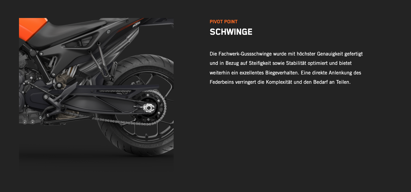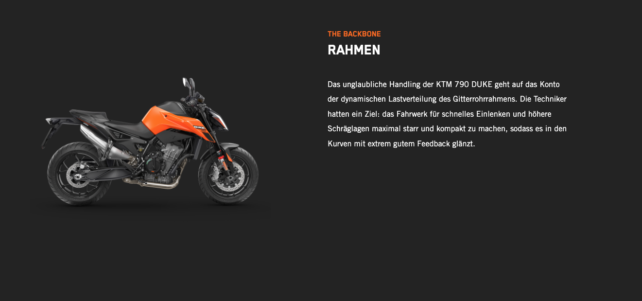| Rahmenbauart | Chrom-Molybdän-Stahlrahmen, Motor als mittragendes Element, pulverbeschichtet |