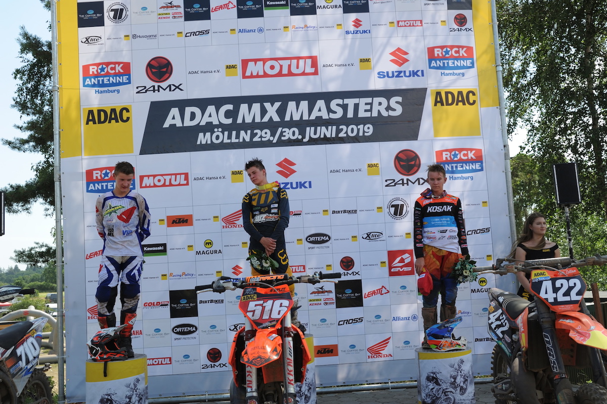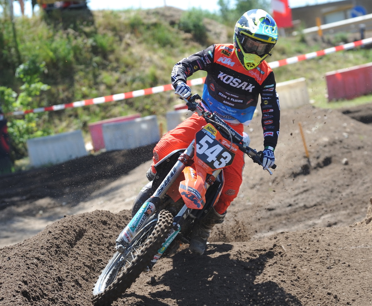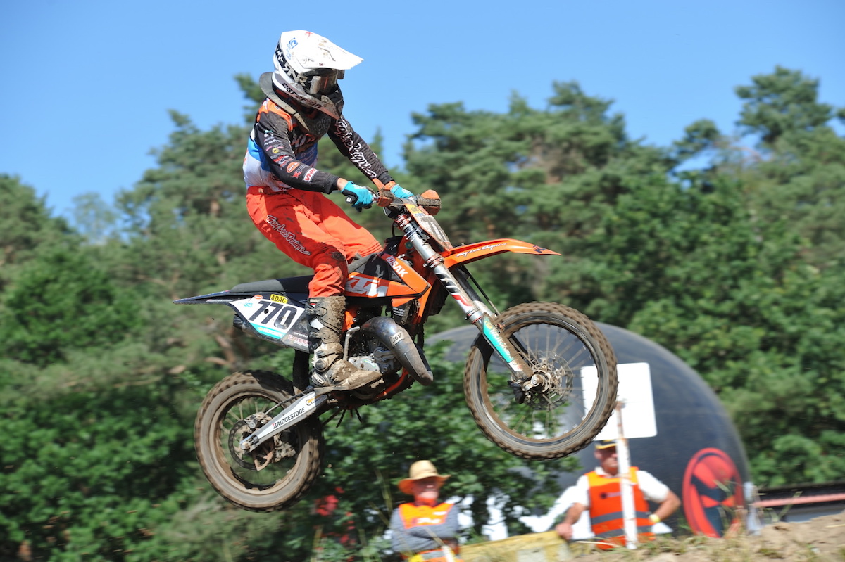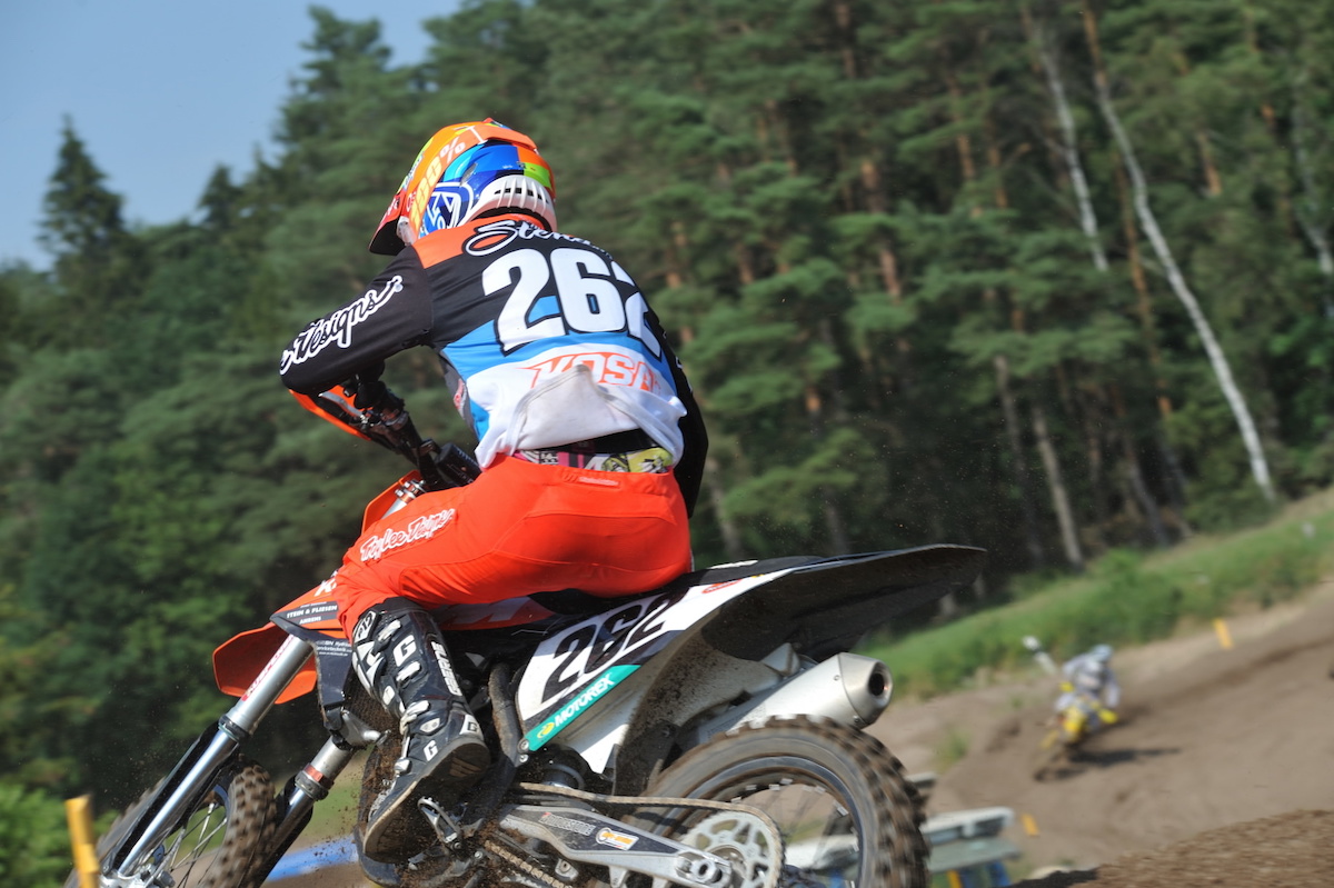 In der MX Masters Klasse richtete sich das Interesse auf die Rückkehr von Mike Stender aus seiner verletzungsbedingten Pause. Neben dem noch nicht ganz ausgeheilten Bruch des Mittelhandknochens, musste der Eutiner noch mit der Bürde des Lokalmatadors klar kommen. In der Qualifikation haute er gleich mal eine Runde heraus, die ihn auf den dritten Platz in seiner Gruppe und auf den sechsten Platz aller Fahrer brachte. Wie er anschließend sagte, fühlte er sich ohne Schmerzmittel wohl, war aber skeptisch, ob er sein Tempo auch über eine Renndistanz durchhalten wird. Die Frage konnte, zumindest im ersten Lauf nicht beantwortet werden. Noch im Getümmel der ersten Runde traf ein Kontrahent das Hinterrad. Stender musste zu Boden und zog sich eine Schnittwunde am Ellenbogen zu. Bei dieser Aktion ging auch die Bremsanlage zu Bruch. Daher musste er die Box ansteuern und das Rennen aufgeben. Dann ging es gleich weiter zu den Sanitätern. Dort wurde die Wunde geklebt und da Mike unbedingt im zweiten Lauf fahren wollte, mit einem Tapeverband fixiert. Im zweiten Durchgang kam Mike Stender sehr gut in das Rennen und war nach der ersten Runde bereits sechster. Bis zur zehnten Runde hatte er sich auf den vielumjubelten vierten Platz nach vorne gefahren. Doch dann wurde er zusehends langsamer und gab nach der vierzehnten Runde das Rennen auf. Das Tape an der Ellenbogenverletzung war wohl etwas zu fest, dadurch ist die Hand eingeschlafen und das Gefühl für die Hebel war weg. Stender will nun alles tun um in zwei Wochen bei der DM Open in Schweighausen wieder 100% fit zu sein. Hier liegt er aktuell auf dem dritten Platz in der Meisterschaft. Und den möchte er verbessern.