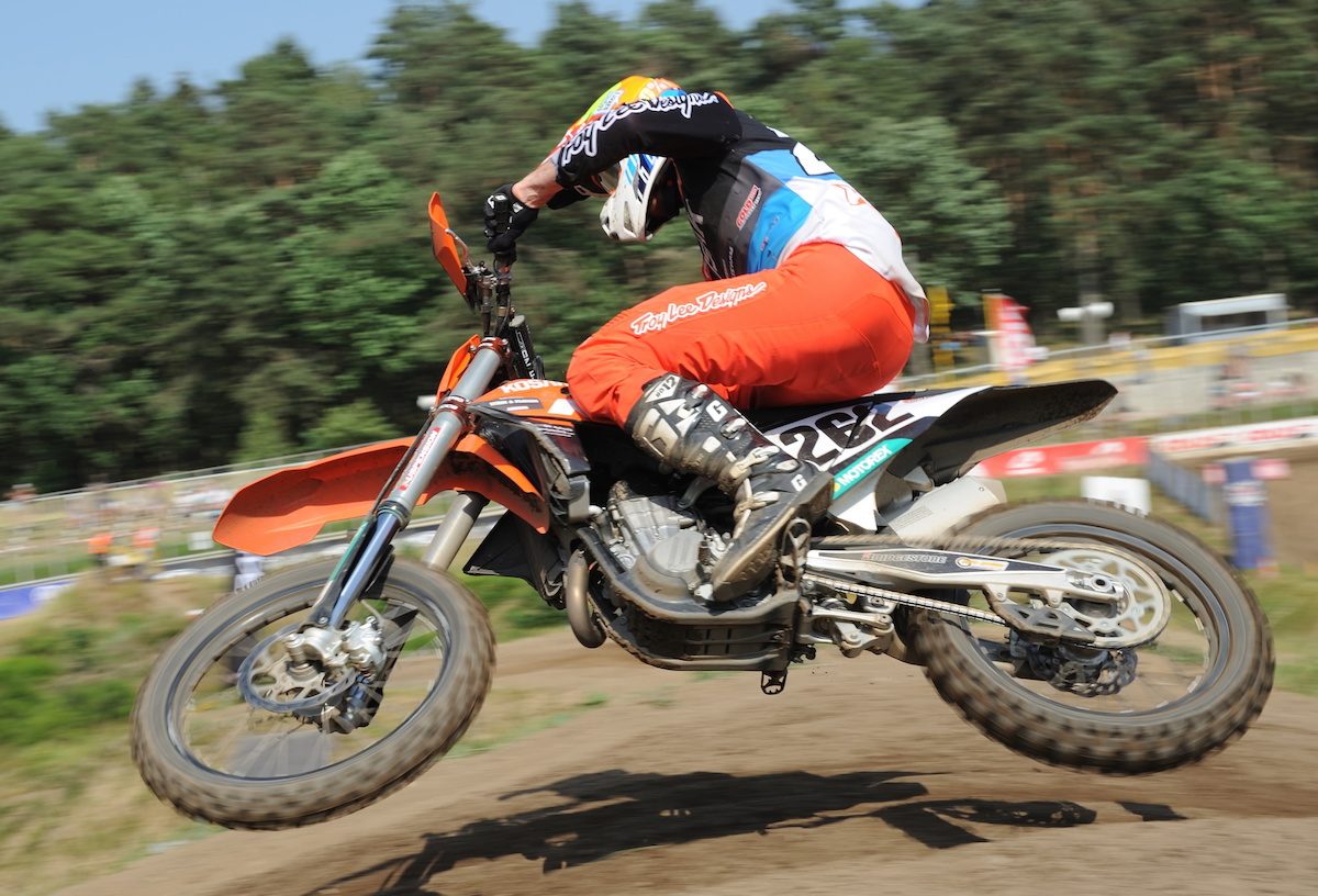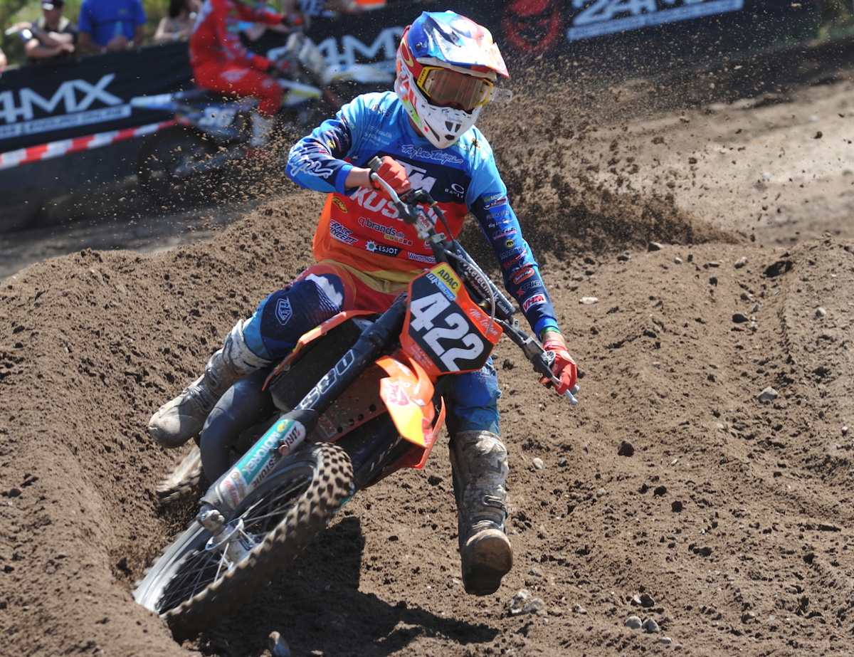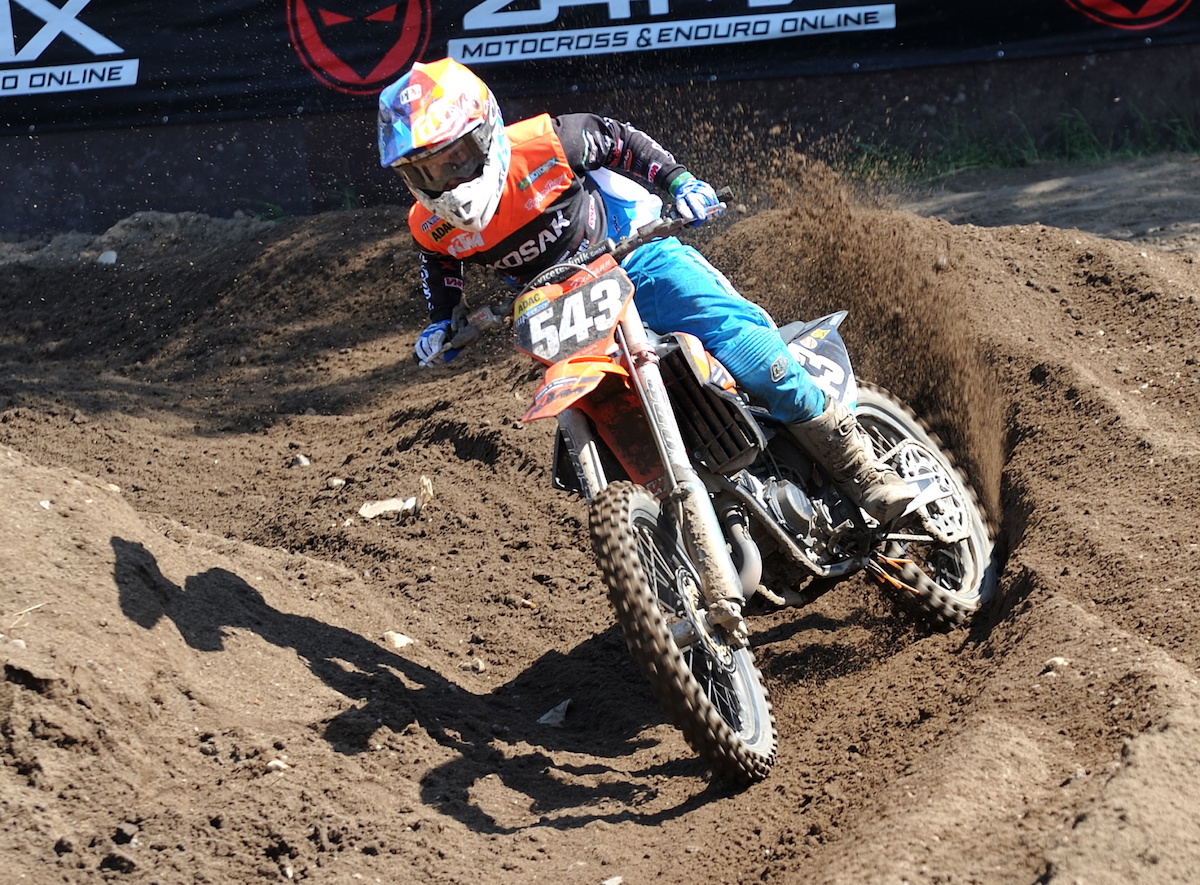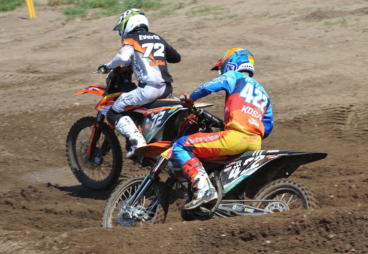 Camden Mc Lellan pflügte bei den 125 ccm Juniorenmit nur 0,5 Sekunden Abstand die zweitbeste Zeit in den heißen Sand, während Nick Doman noch nach den richtigen Spuren suchte, sich aber als 24. qualifizieren konnte. Im ersten Rennen am Sonntag sah es dann ganz anders aus. Doman kam besser zurecht als in der Qualifikation. Er fuhr gleich nach dem Start in den Top Ten mit, hielt sein Tempo durch und beendete das Rennen als Neunter. Mc Lellan kam noch als Zehnter aus der Startrunde zurück. Doch dann rutschte er mit dem Vorderrad auf einem der schon erwähnten Steine weg und ging zu Boden. Das Motorrad lag so ungünstig im Sand, dass er das ganze Feld vorbei lassen musste, ehe er wieder durchstarten konnte. Mit großem Einsatz und schnellen Rundenzeiten kämpfte er sich wieder nach vorne und schaffte nach 25 Minuten Renndistanz noch den fünfzehnten Platz. Auch im zweiten Lauf war der Start der Kosak Junioren ähnlich dem ersten. Mc Lellan fuhr als Neunter durch den Sandkasten. Doman wurde als Vierzehnter notiert. Camden machte mächtig Druck und hatte schnell bis an die fünfte Stelle aufgeschlossen. Nach rundenlangen Duellen um die Plätze konnte er in der letzten Runde mit einem konsequenten Manöver zwei Fahrer überholen und als Dritter auf das Podest steigen. Er zeigte sich erfreut über seinen Podestplatz in dieser stark besetzten Klasse. Doman hatte zur Halbzeit einen kleinen Durchhänger und fiel etwas zurück.