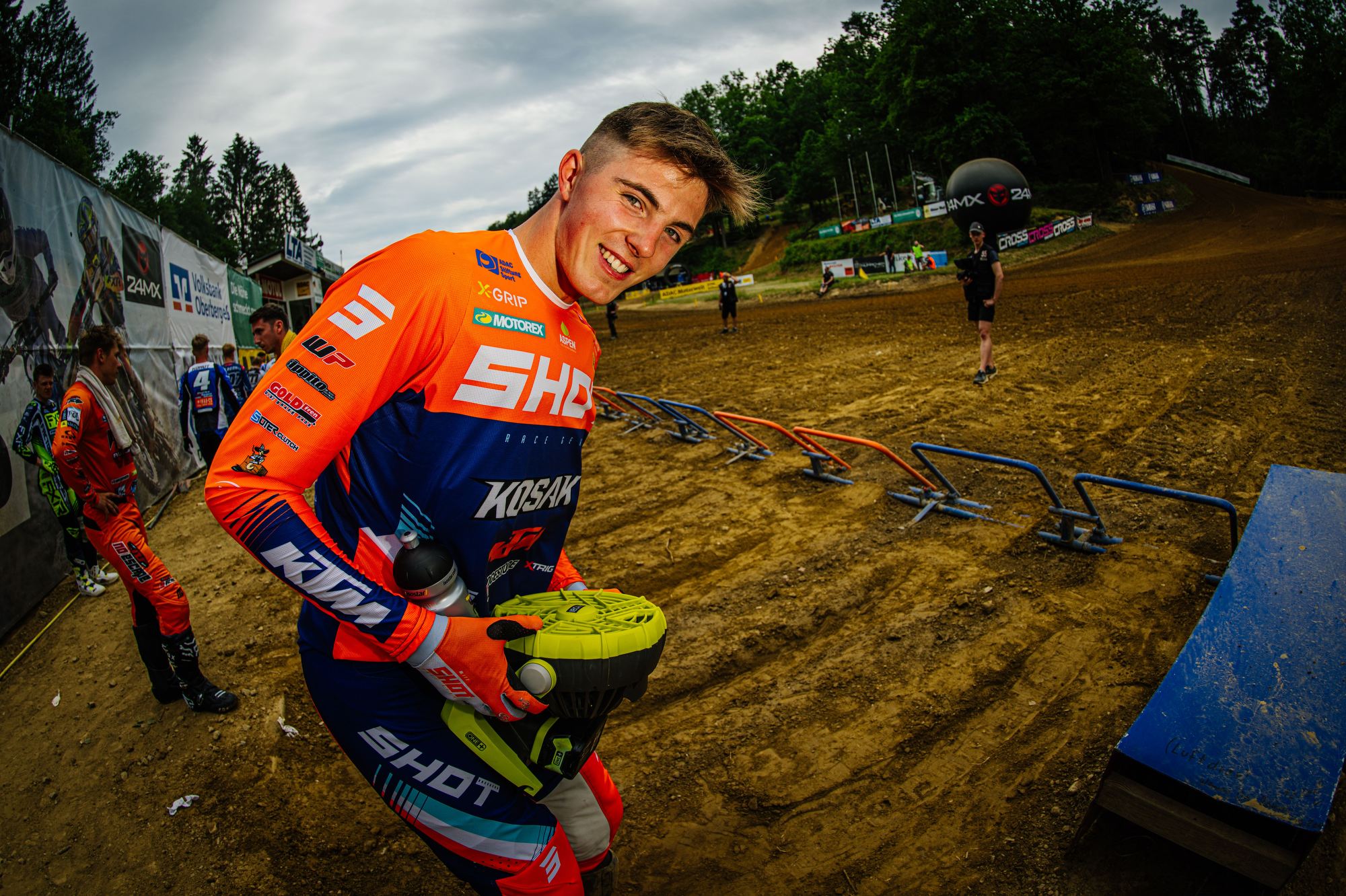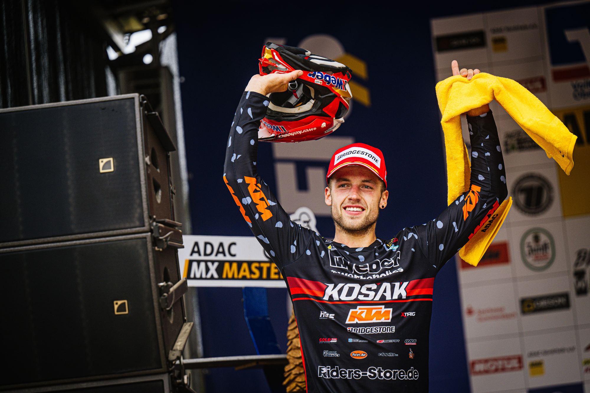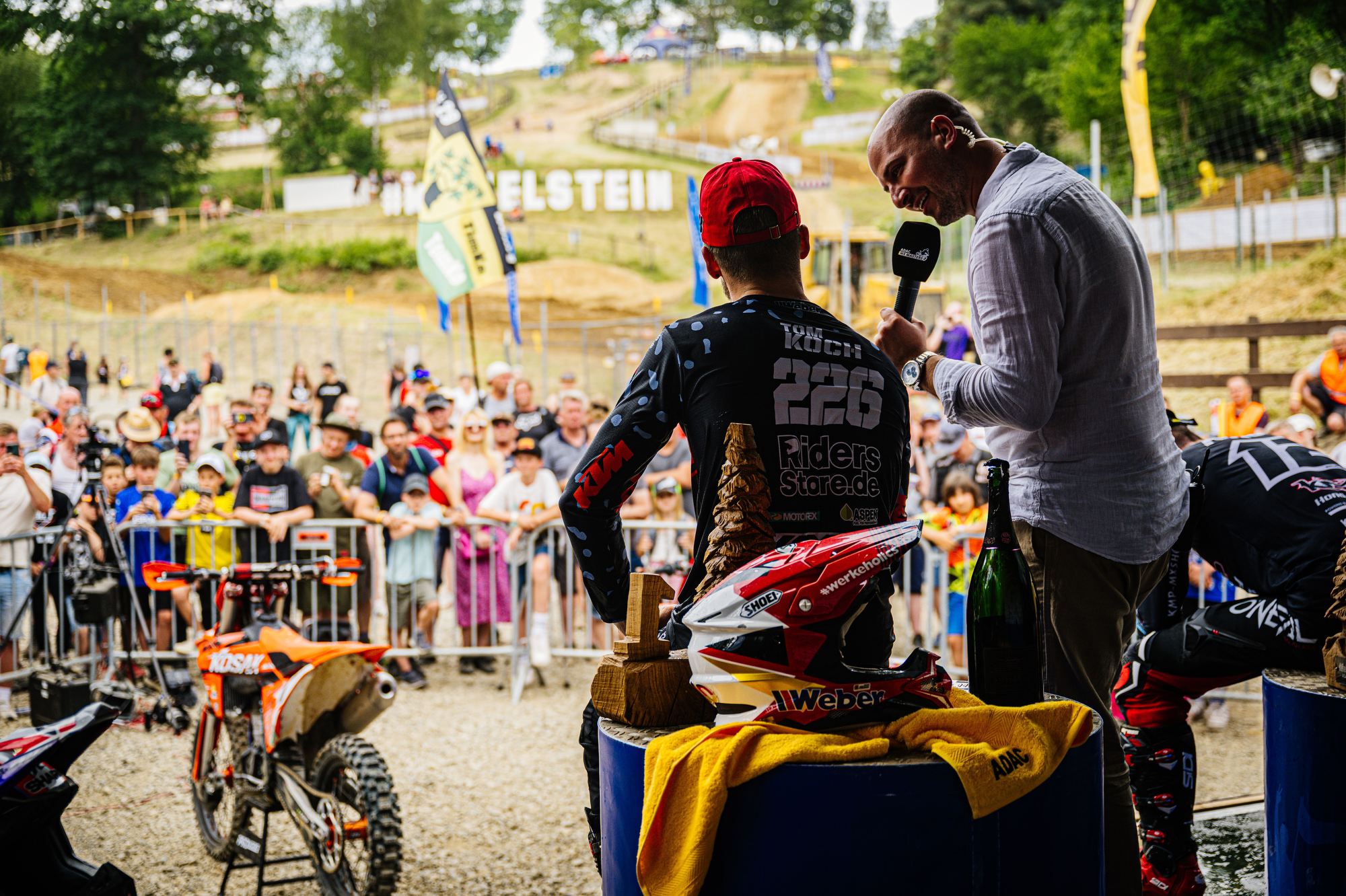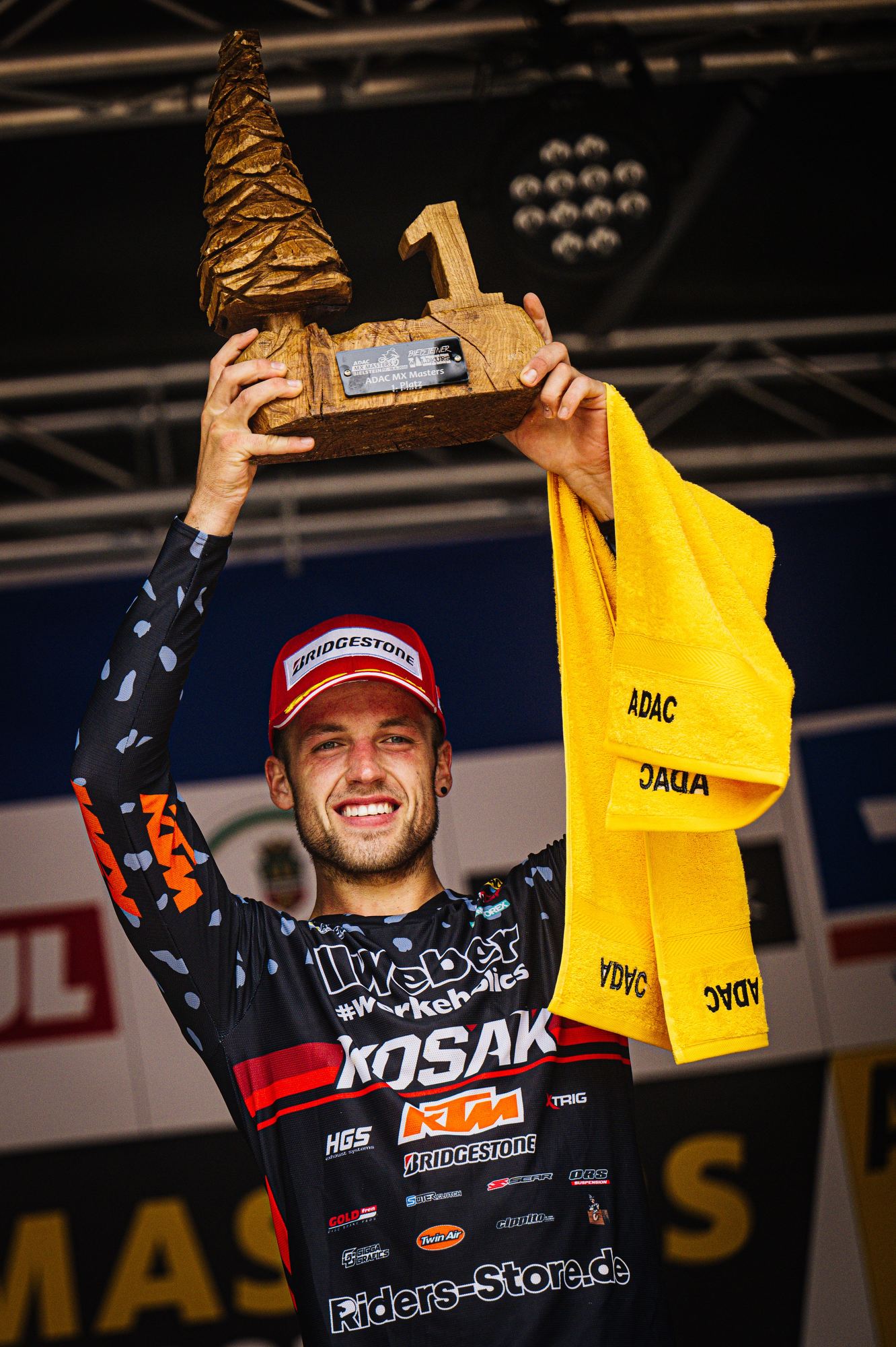Auch der Start in das dritte Rennen gelang Tom Koch wieder super. Sofort fuhr er auf der anspruchsvollen Strecke wieder auf dem zweiten Platz und konnte dem Führenden einige Runden folgen, kam aber für einen Überholversuch nicht nahe genug heran. In der Box wurde gerechnet, dass bei diesem Rennverlauf der zweite Platz für den Gesamtsieg reicht. Tom begnügte sich damit den zweiten Platz zu halten und sicher ins Ziel zu bringen. Die Rechnung ging auf und er wurde mit einem Punkt Vorsprung Tagessieger. Sichtlich zufrieden zeigte er sich nach der Siegerehrung „Der zweite Gesamtsieg bei einem ADAC MX Masters innerhalb von zwei Wochen ist schon der Hammer, so kann es weiter gehen. Es zeigt mir, dass ich auf dem richtigen Weg bin. Vor unserem Zeittraining wurde die Strecke gut gewässert, da war es stellenweise sehr rutschig. Daher ist mein zweiter Platz in der Quali ok. Die nächsten Masters Rennen sind erst Anfang August in Gaildorf. Vorher stehen noch im Juli WM Rennen in Tschechien, Belgien, Finnland und gleich nach Gaildorf Schweden in meinem Kalender. Aber nun freue ich mich auf einen Gaststart bei den DM Open in Aichwald.“ Bei der Halbzeitmeisterschaft liegt Tom Koch nun auf dem Zweiten Platz.