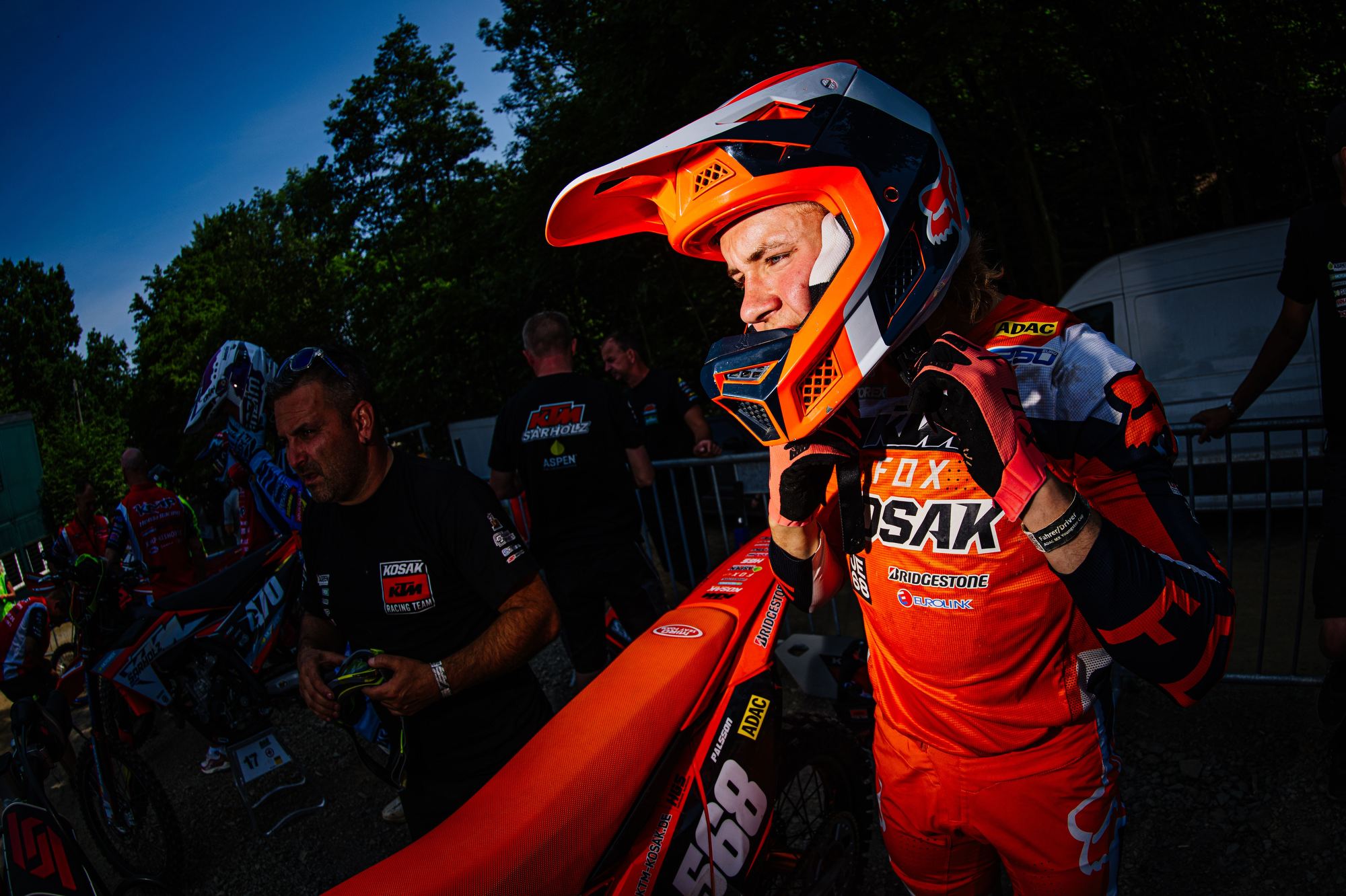Auf dem Bielsteiner Waldkurs, der Traditionsstrecke im Bergischen Land, mit steilen Wiesenteilen und den Waldpassagen mit wechselnden Lichtverhältnissen, verlangt der mit Steinen durchzogene Hartboden von den Fahrern höchste Konzentration und Können. Der Veranstalter hatte die Strecke an einigen Teilen gewässert um die Staubentwicklung zu unterbinden, was aber an diesen Stellen erhöhte Aufmerksamkeit verlangte. In der Qualifikation am Samstag fuhr Tom Koch im Feld der fast achtzig Fahrer in seiner Gruppe die zweitbeste Rundenzeit. Maximilian Spies, der mit der 450–er Maschine seinen ersten Auftritt in Bielstein hatte, folgte direkt dahinter als Dritter.