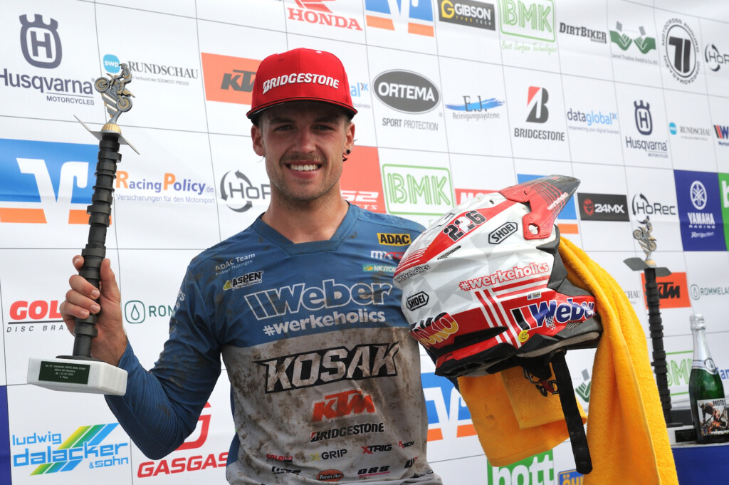 Über Nacht hatte der Veranstalter den Kurs mit schwerem Gerät und viel Wasser bearbeitet und in einen guten Zustand gebracht. In das zweite Rennen, das am Sonntag um 14 Uhr gestartet wurde, kam Tom Koch erneut gut aus dem Startgatter. Schon in der zweiten Runde eroberte er sich den dritten Platz und brachte diesen sicher ins Ziel. Als am späten Nachmittag vor riesiger Zuschauerkulisse das dritte Rennen gestartet wurde, lagen die Temperaturen noch bei 28 Grad. Der Start in diesen Lauf erwischte Tom Koch nicht ganz optimal. Als Fünfter wurde er nach der ersten Runde notiert. Schnell fand er seinen Rhythmus und überholte den Tabellenführer, Max Nagl, und setzte bald den Titelverteidiger, Jordie Tixier, unter Druck. In der dreizehnten Runde konnte er einen Fehler des Franzosen ausnutzen, den zweiten Platz übernehmen und sicher vor Nagl ins Ziel bringen. In der Tageswertung kam der Wormstedter damit auf den zweiten Platz und ist als Dritter in der Meisterschaftswertung ein paar Punkte an die Vorderleute heran gekommen.