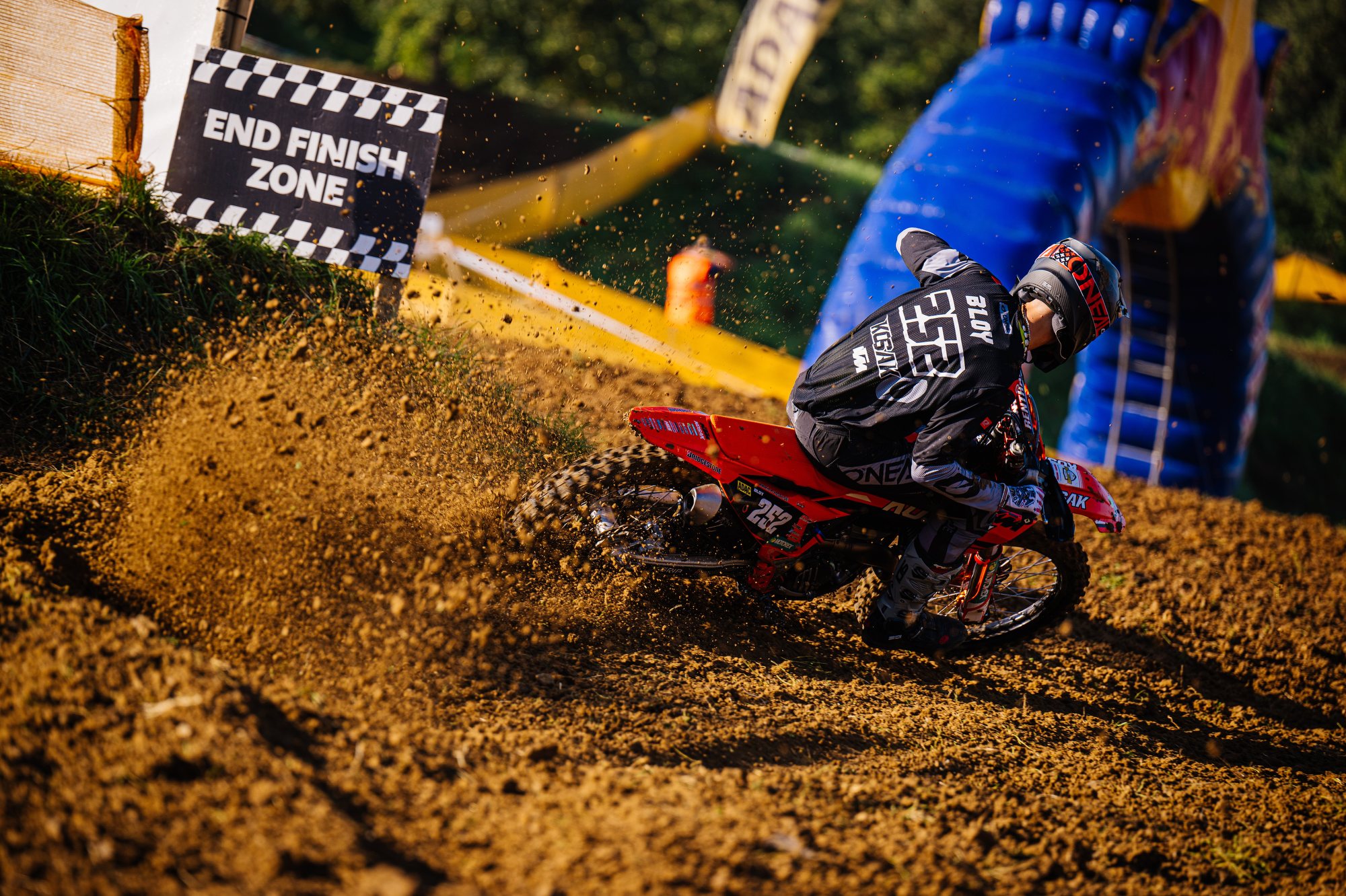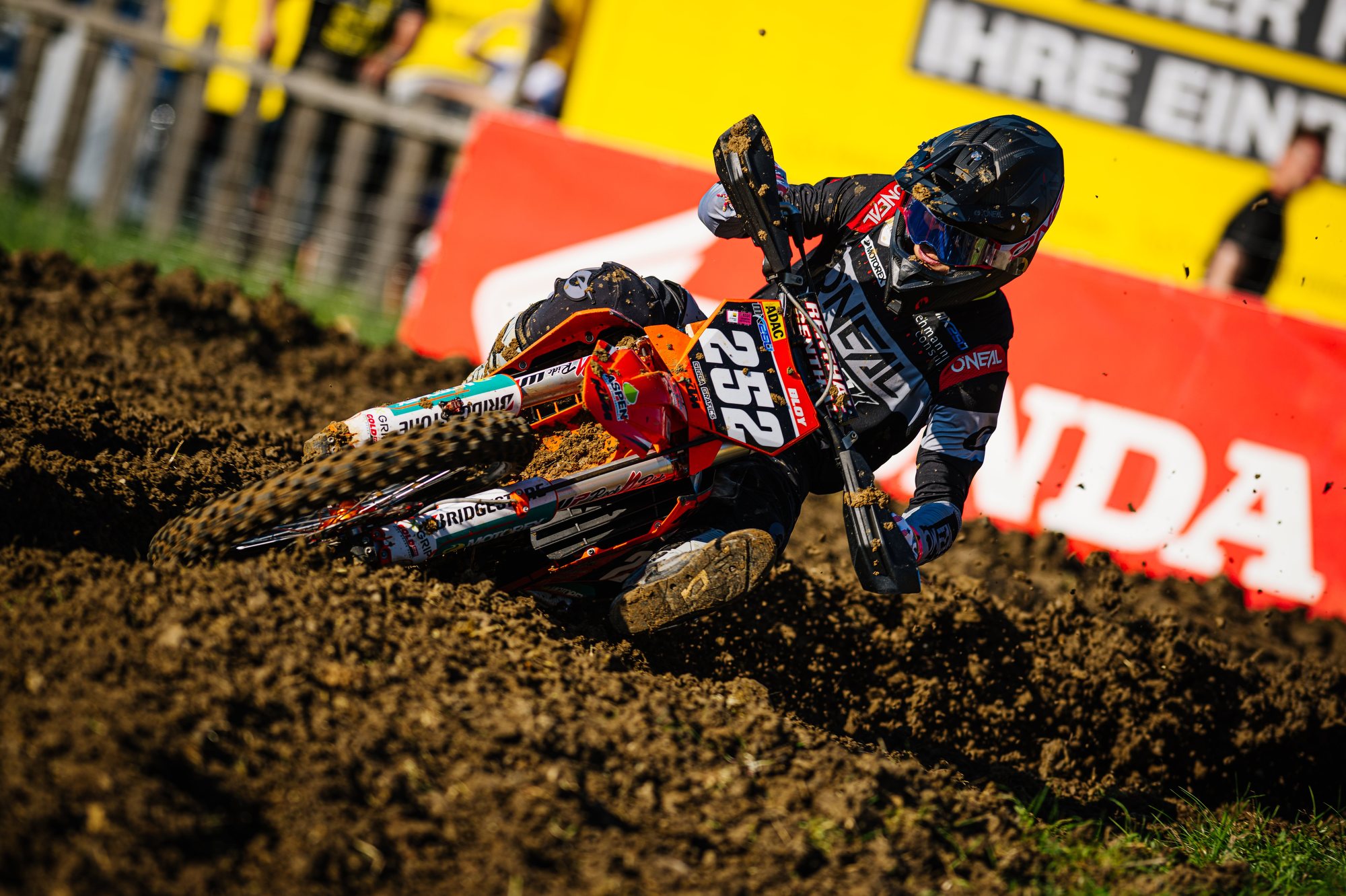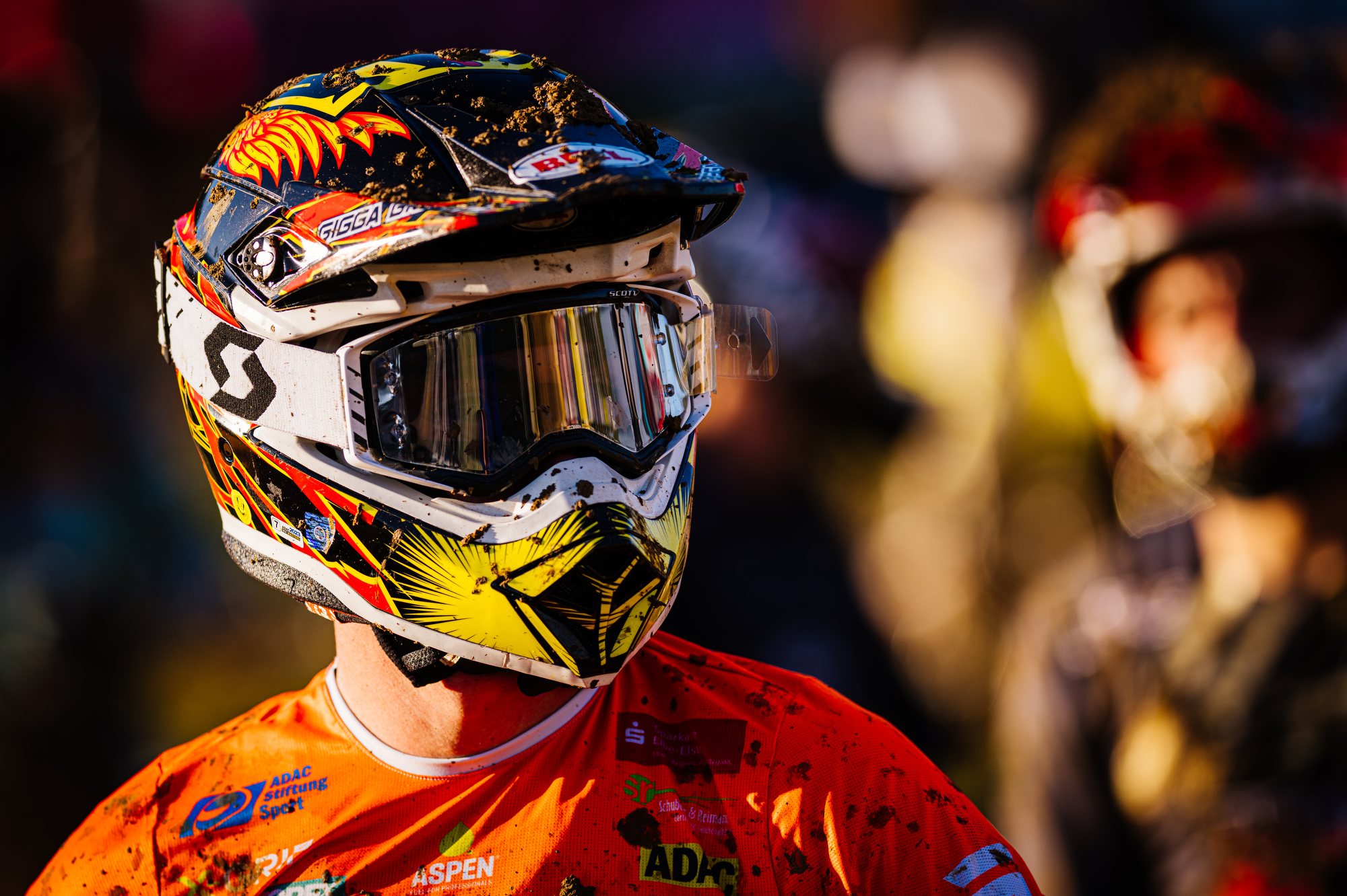 Mit der zweitschnellsten Zeit in seiner Gruppe und der zweitschnellsten Rundenzeit aller sechzig Fahrer konnte sich Maximilian Spies als Dritter an die Startanlage stellen. Im ersten Rennen konnte er kein Kapital aus dieser Position schlagen. Als Zehnter kam er aus der ersten Runde, machte aber mächtig Druck und fuhr in der vierten Runde auf die sechste Position. Diesen Platz konnte er sicher ins Ziel bringen. Der Start in das zweite Rennen war etwas besser, aber noch nicht wie gewünscht. Wieder brauchte er ein paar Runden bis er die Lücke zur Spitze geschlossen hatte. Zur Rennmitte konnte er sich nach einem rundenlangen Duell der Rookies um den Vierten Platz durchsetzen. Der Auftakt zum dritten Wertungslauf verlief analog zum ersten. Wieder kam er als Zehnter aus der Startrunde und brauchte etwas um seinen Rhythmus zu finden. Er hatte sich schon wieder den vierten Platz erobert, eher er zu Boden musste. Das warf ihn auf den sechsten Platz zurück, den er trotz höchstem Einsatz nicht mehr verbessern konnte. In der Tageswertung kam er auf den fünften Platz und kann in der Meisterschaftswertung diese Position sichern. Spies, der für die MXoN in Frankreich als Reservefahrer nominiert ist, zeigte sich nach dem Rennen nicht ganz zufrieden. „ Es war ein solides Wochenende, nicht ganz so wie ich es haben wollte, da ich mir einen Podestplatz vorgenommen habe. Aber der fünfte Platz gesamt ist ok. In der Quali lief es sehr gut. Die zweitschnellste Zeit und bester deutscher Fahrer, das ist ok. Beim Start in den dritten Lauf ist mir das Hinterrad durchgedreht und ich musste hinterherfahren. Ich bin aber schnell nach vorne gekommen, musste aber bei einem Überholversuch zu Boden und habe Plätze verloren. Aber nun ist es vorbei und ich muss nach vorne schauen und mich auf die WM Rennen in Italien und England konzentrieren“ und fügt lächelnd hinzu “und bei den letzten ADAC MX Masters in Dreetz gibt es eine Sandstrecke“.