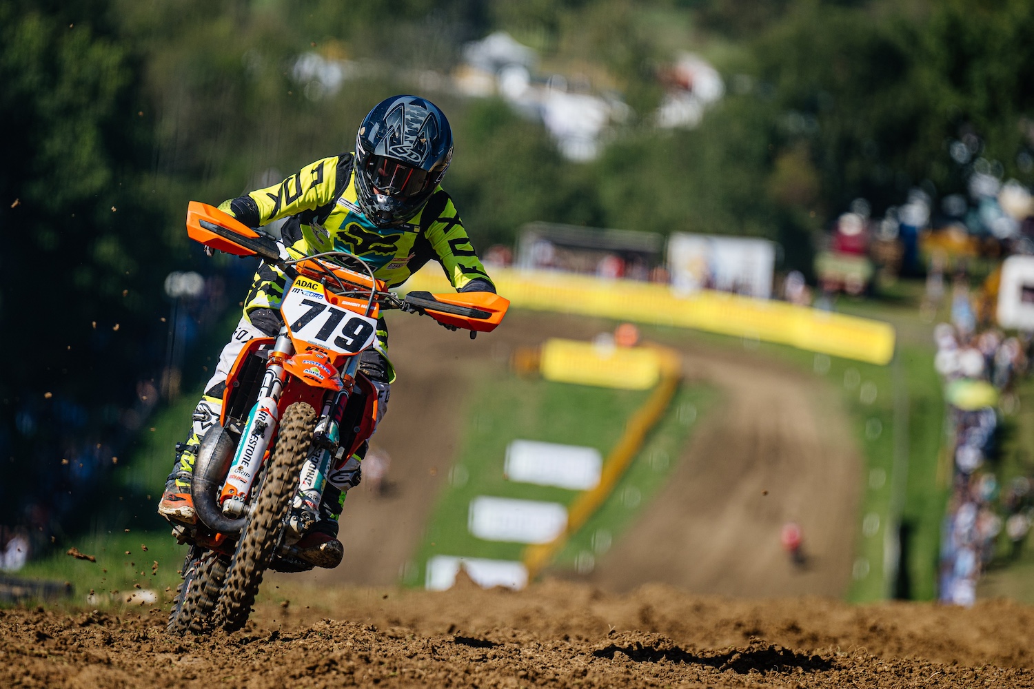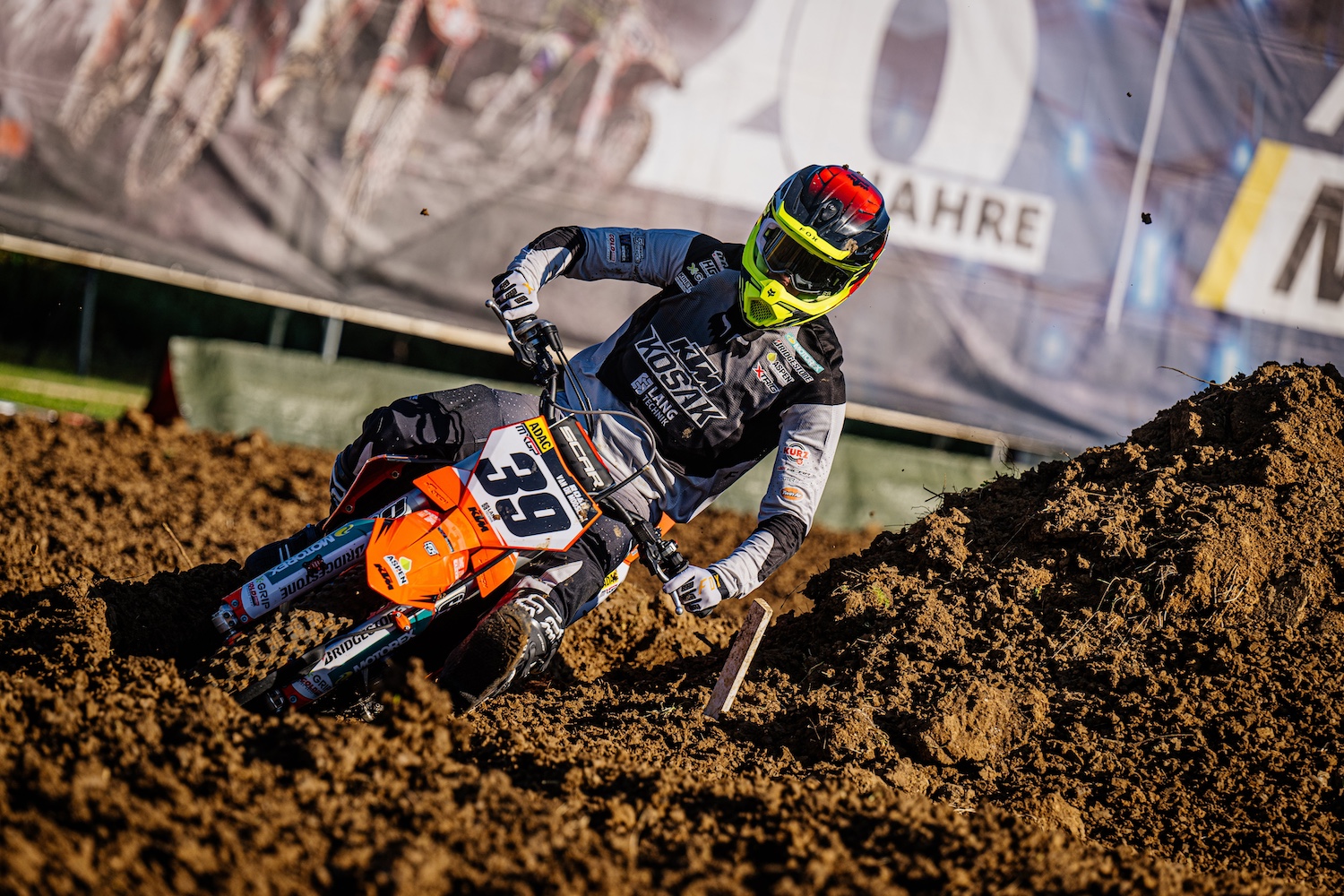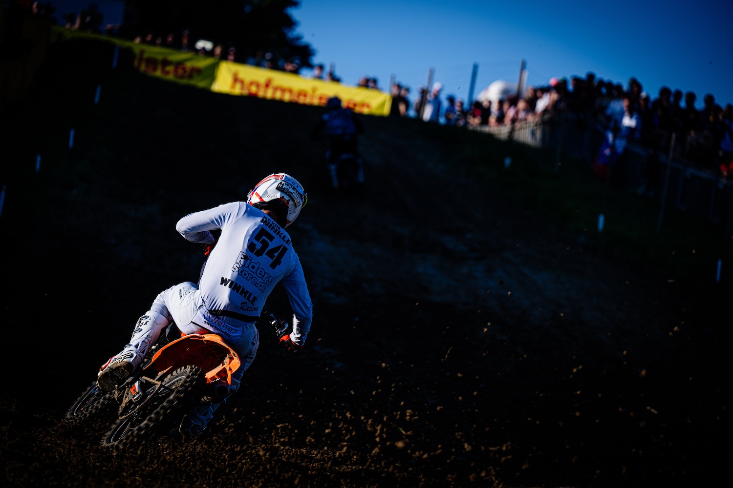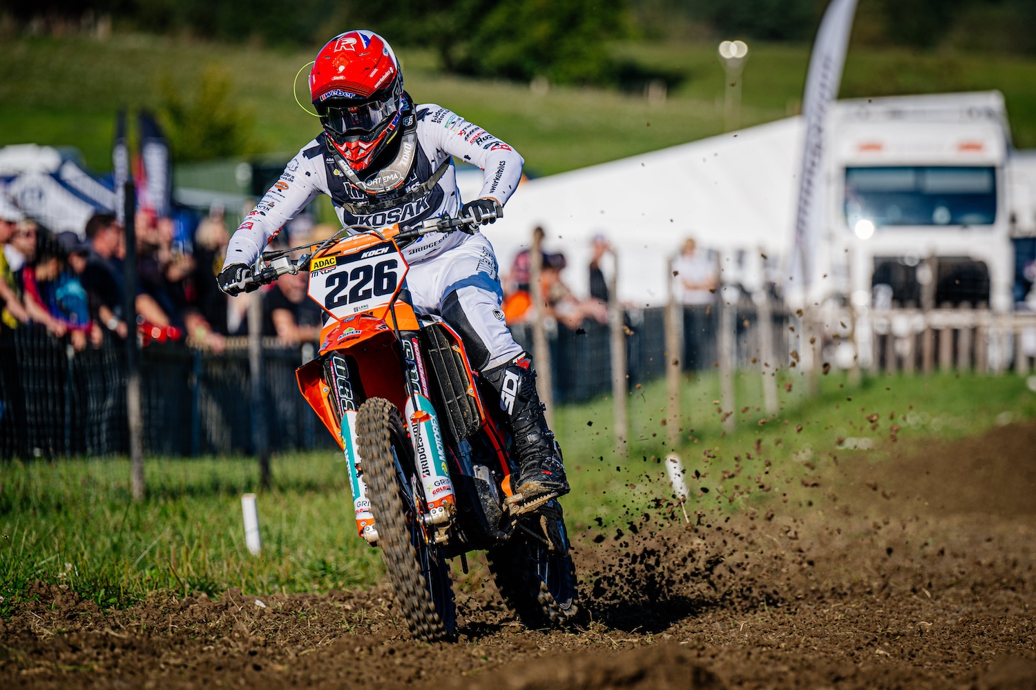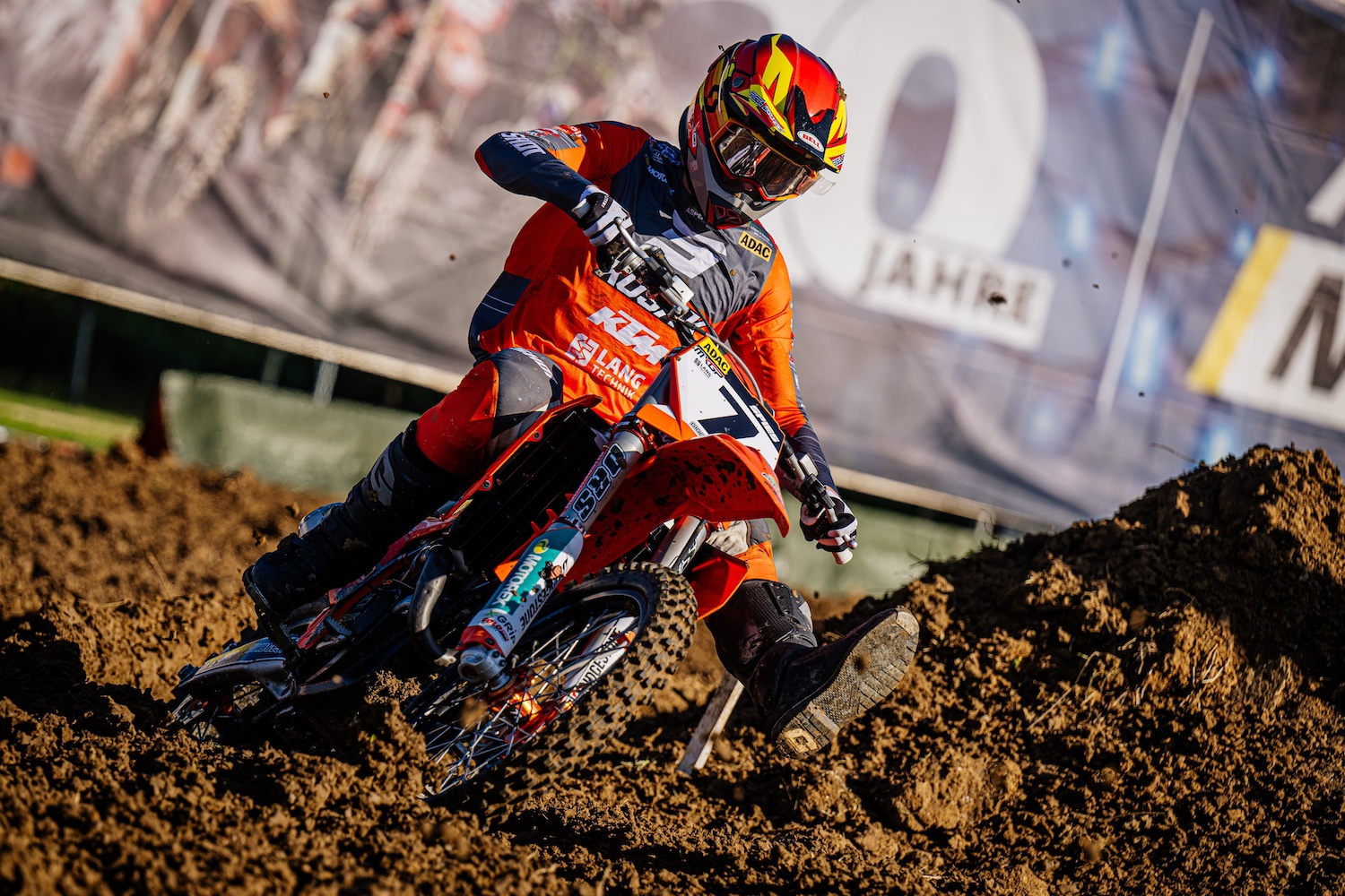 Tom Koch reiste mit zehn Punkten Vorsprung um den Vizetitel an und wollte diese Platzierung verteidigen. In der Qualifikation am Samstag schaffte er die insgesamt fünftbeste Rundenzeit und hatte so eine gute Position in der Startaufstellung. Mit seinem ersten Holeshot des Jahres setzte sich Tom Koch sofort an die Spitze und baute einen kleinen Vorsprung auf. Zur Rennmitte hatte sich der nächste Verfolger herangearbeitet und setzte den KTM Fahrer unter Druck. Koch konnte immer parieren, bis in einer tiefen Spur der Schalthebel hängen blieb und der Gang heraus sprang. Zwar konnte er schnell die Fahrt fortsetzen, hatte aber keine Möglichkeit mehr in dem Kampf um den Sieg einzugreifen. Im zweiten Durchgang kam Tom Koch als Fünfter aus der Startrunde zurück und verbesserte sich bis zum Rennende auf den dritten Platz .Da sein Mitstreiter um den Vizetitel wieder vor ihm ins Ziel kam, war für das dritte Rennen rechnen und taktieren angesagt. Mit einem guten Start begann er das letzte Rennen des Jahres. Ohne Risiko, immer den Gegner im Blick, fuhr er zunächst als Siebter seine Runden und nahm auch einen Überholvorgang hin. Im letzten Renndrittel überholte er den direkten Mitstreiter, hatte so sein Ziel erreicht und wurde in der Tageswertung Dritter. Nach allen Ehrungen freute sich Tom Koch: „Es war wieder eine sehr gelungene Veranstaltung. Und es macht einfach Spaß bei so herrlichem Wetter vor so einer begeisterten Zuschauerkulisse zu fahren. Am Anfang war ich noch ein bisschen zu verkrampft und steif. Trotz gesundheitlicher Probleme in den letzten Wochen habe ich alles gegeben, um den Vizetitel zu holen. Obwohl ein Platz besser auch nicht schlecht wäre. Es war eine Saison mit vielen Höhen und Tiefen, und ohne die Unterstützung meines Teams hätte ich es nicht geschafft, mich zurück zu kämpfen. Ich bin froh und stolz, dass es am Ende für den zweiten Platz gereicht hat“, freute er sich.