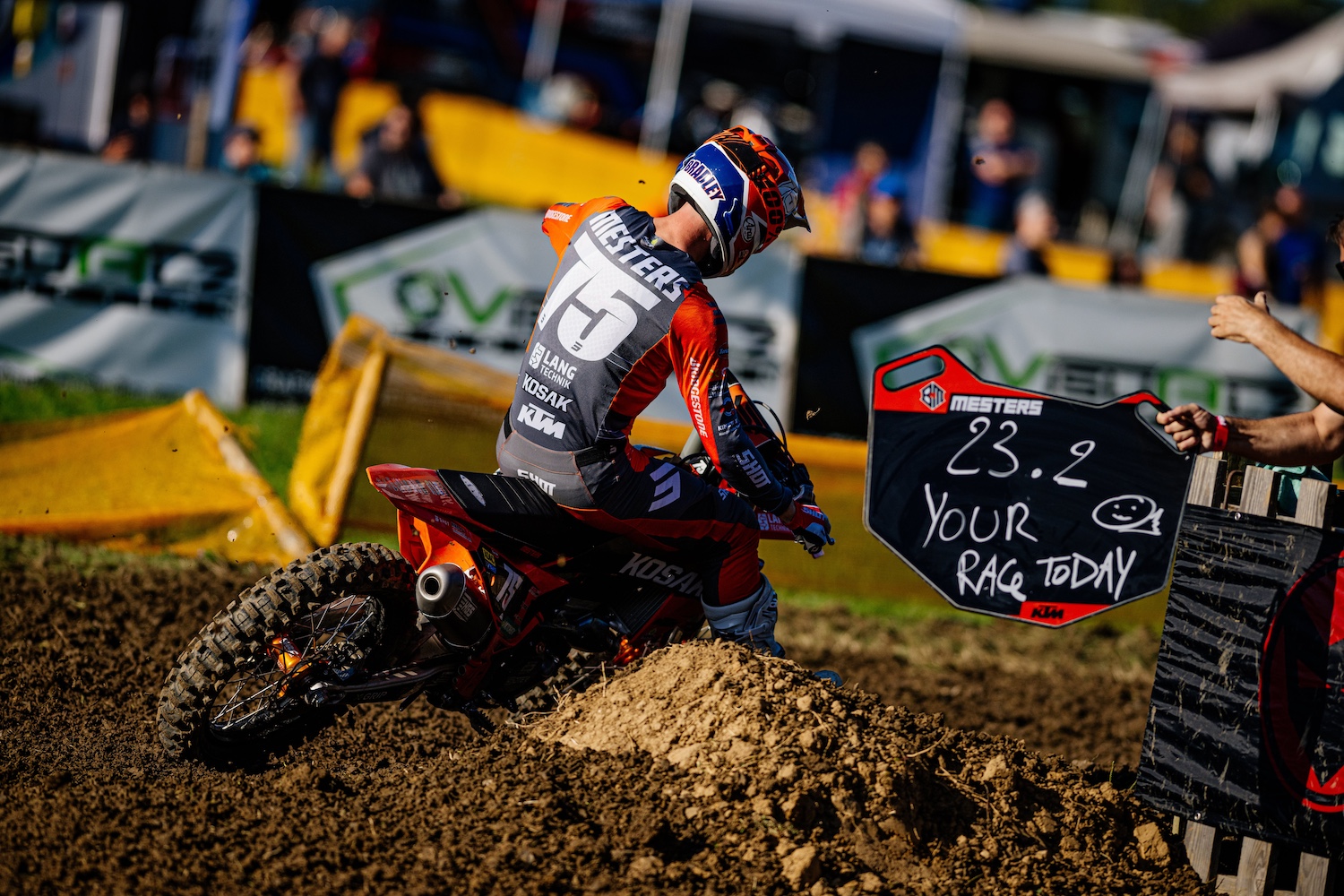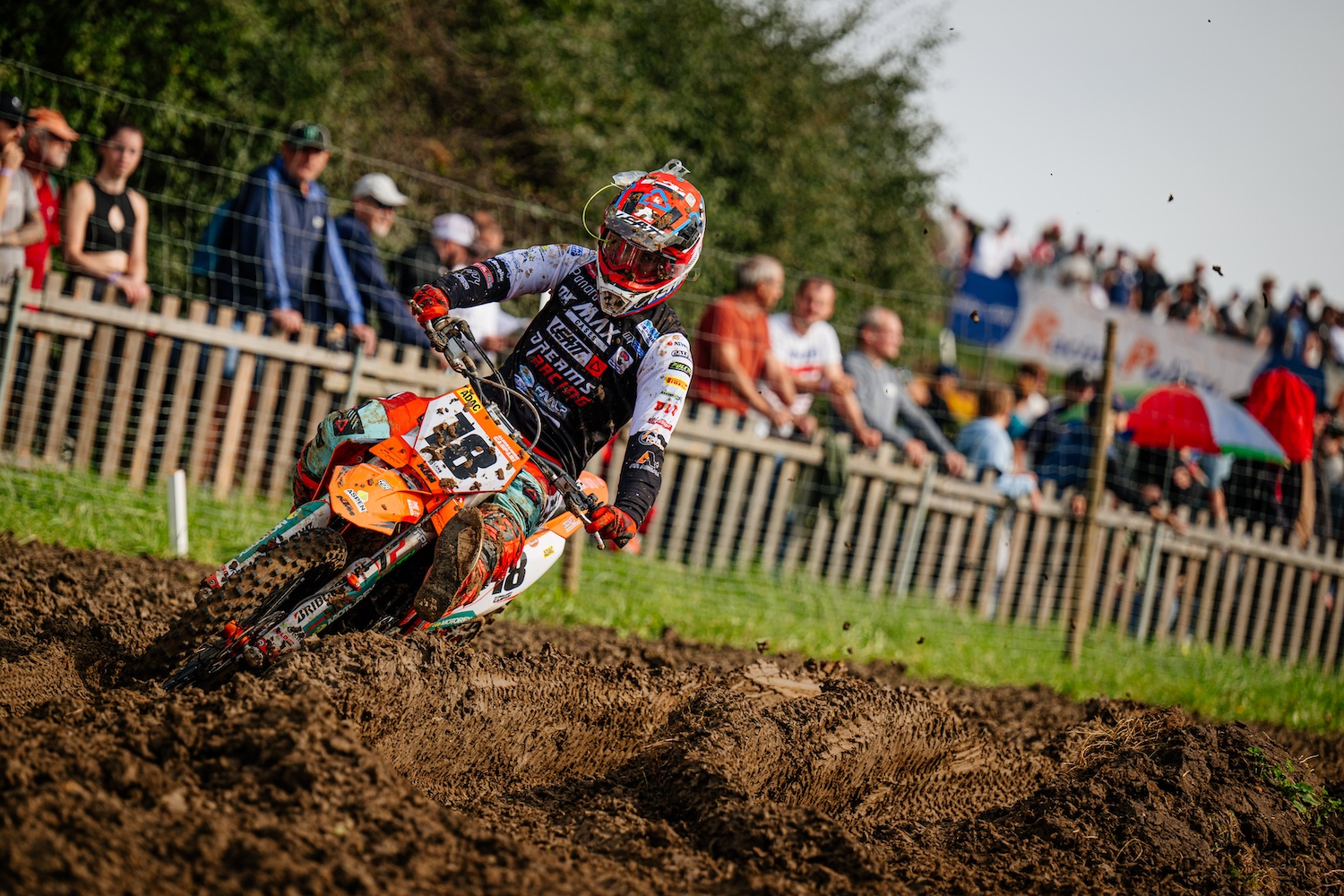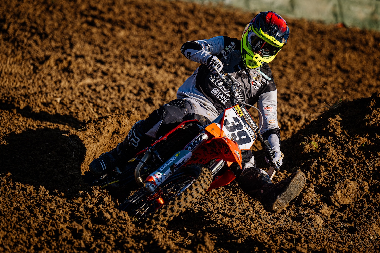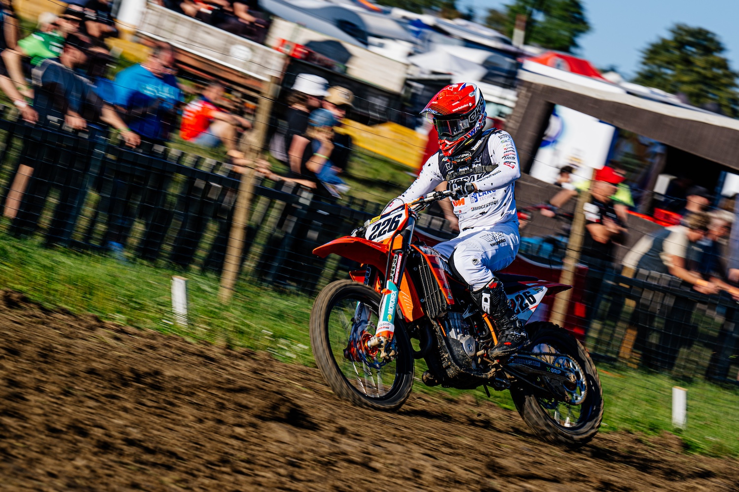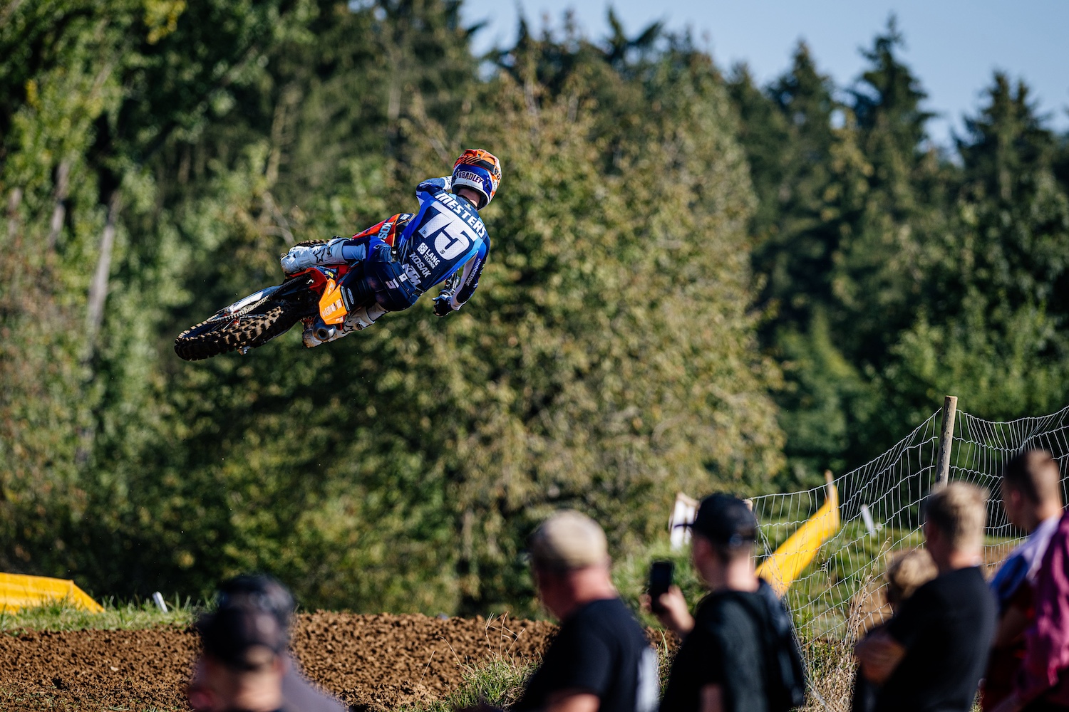 Bradley Meesters war als Tabellendritter nach Holzgerlingen angereist und wollte diesen Platz auf alle Fälle verteidigen oder wieder verbessern. In der Qualifikation musste er sich an die besonderen Bedingungen der Naturstrecke gewöhnen und platzierte sich als Neunter. Doch schon im ersten Rennen untermauerte er sein Vorhaben, als er nach gutem Start in der vierten Runde die Spitze übernahm und das Feld bis zwei Runden anführte. Dann wurde er von einen Angriff vom sicheren Meister überrascht, hielt sich aber dicht dahinter auf dem zweiten Platz, bis in der vorletzten Runde die Defekthexe zuschlug. In einer sehr tiefen Spurrille verbog es die Kettenführung und bei der Anfahrt zum Zielsprung blieb die Maschine stehen, weil die Kette abgesprungen war. Bradley reagierte blitzschnell, brachte die Kette wieder in Position und nahm die letzte Runde in Angriff. Durch den großen Vorsprung kostete die Aktion nur zwei Plätze. Als Vierter fuhr er wieder auf den Zielsprung zu, als ihm noch einmal das gleiche Schicksal ereilte. Diesmal versuchte er nicht die Kette wieder in die Führung zu bringen, sondern probierte das Motorrad auf den steilen Zielsprung zu schieben. Als er etwa die Hälfte oben war gab er auf, nicht wissend, dass er mit der Schiebeaktion den Transponder über die Zeitmessung gebracht hatte und als Fünfer gewertet wurde. Im zweiten Rennen kam Bradley erneut gut aus dem Startgatter. Mit schnellen Zeiten setzte er sich in der zweiten Runde an die Spitze und hielt die Position für mehrere Runden, bis er in einem Duell um die Führung ins straucheln kam und zu Boden musste. Als Sechster erreiche er das Ziel und war dem Vizetitel ein Stück näher gekommen. Der Start in das dritte Rennen war eher mittelmäßig. Mit einer starken Leistung fuhr er noch bis auf den vierten Platz nach vorne. In der Tageswertung wurde er Vierter und hat sich mit einer starken Leistung den Vizetitel gesichert.