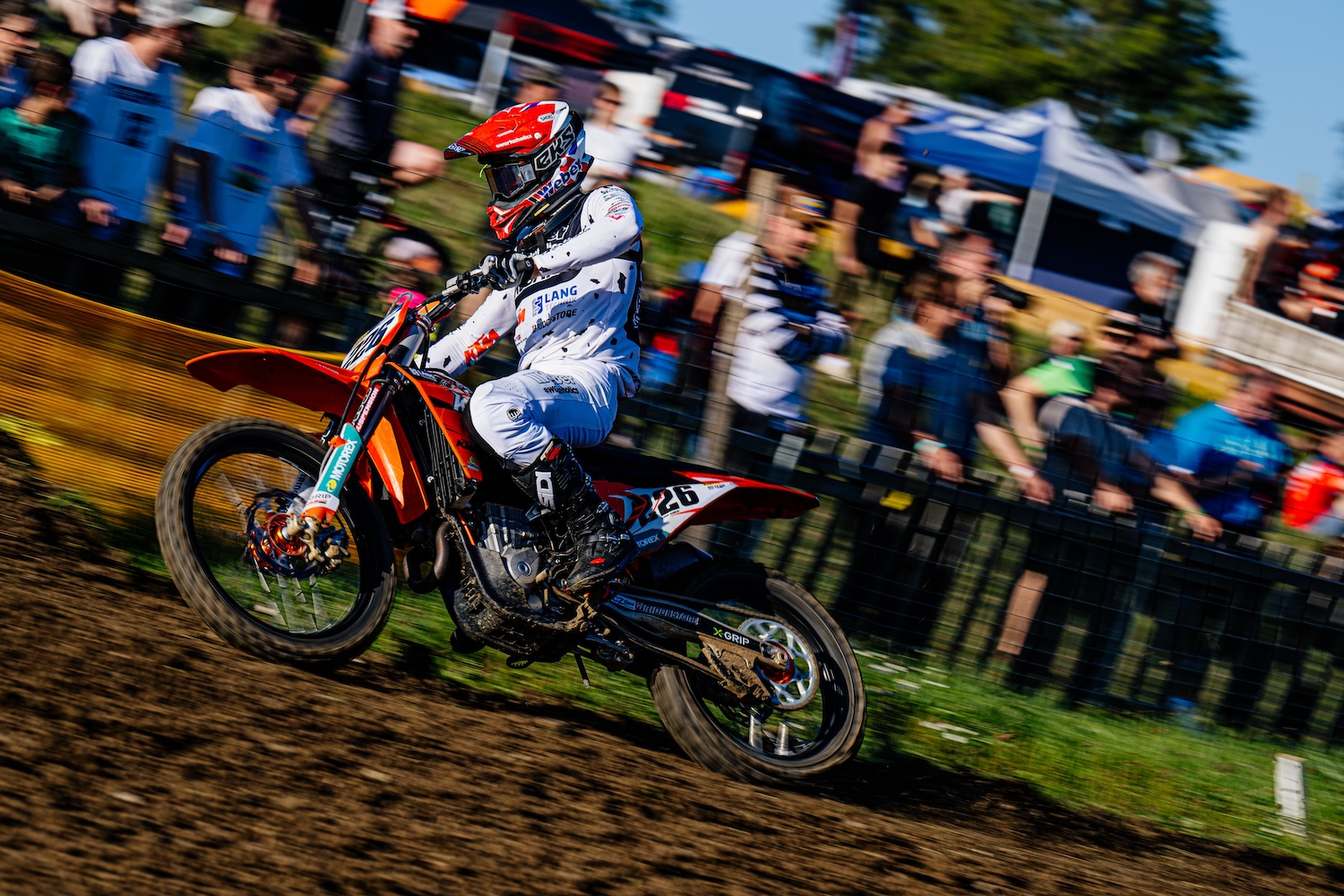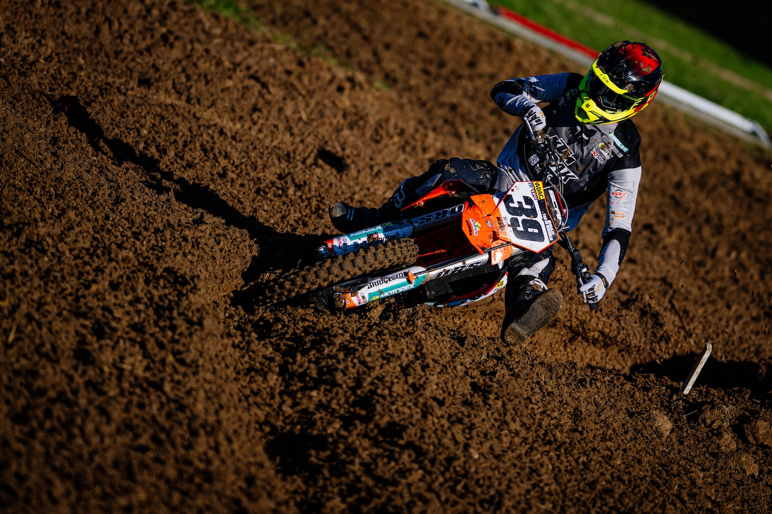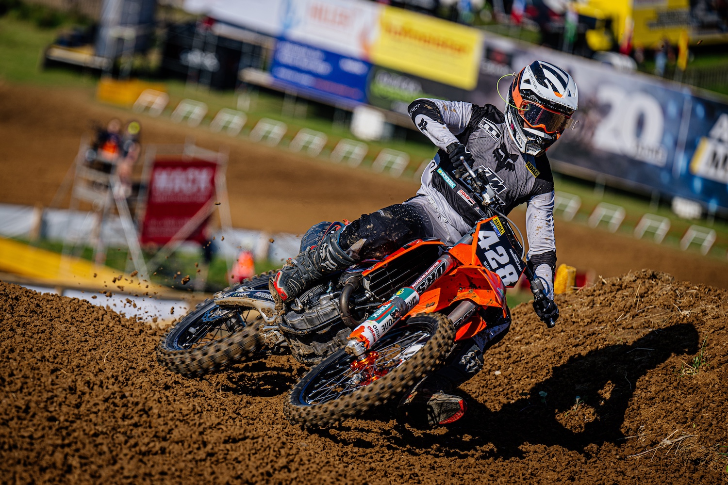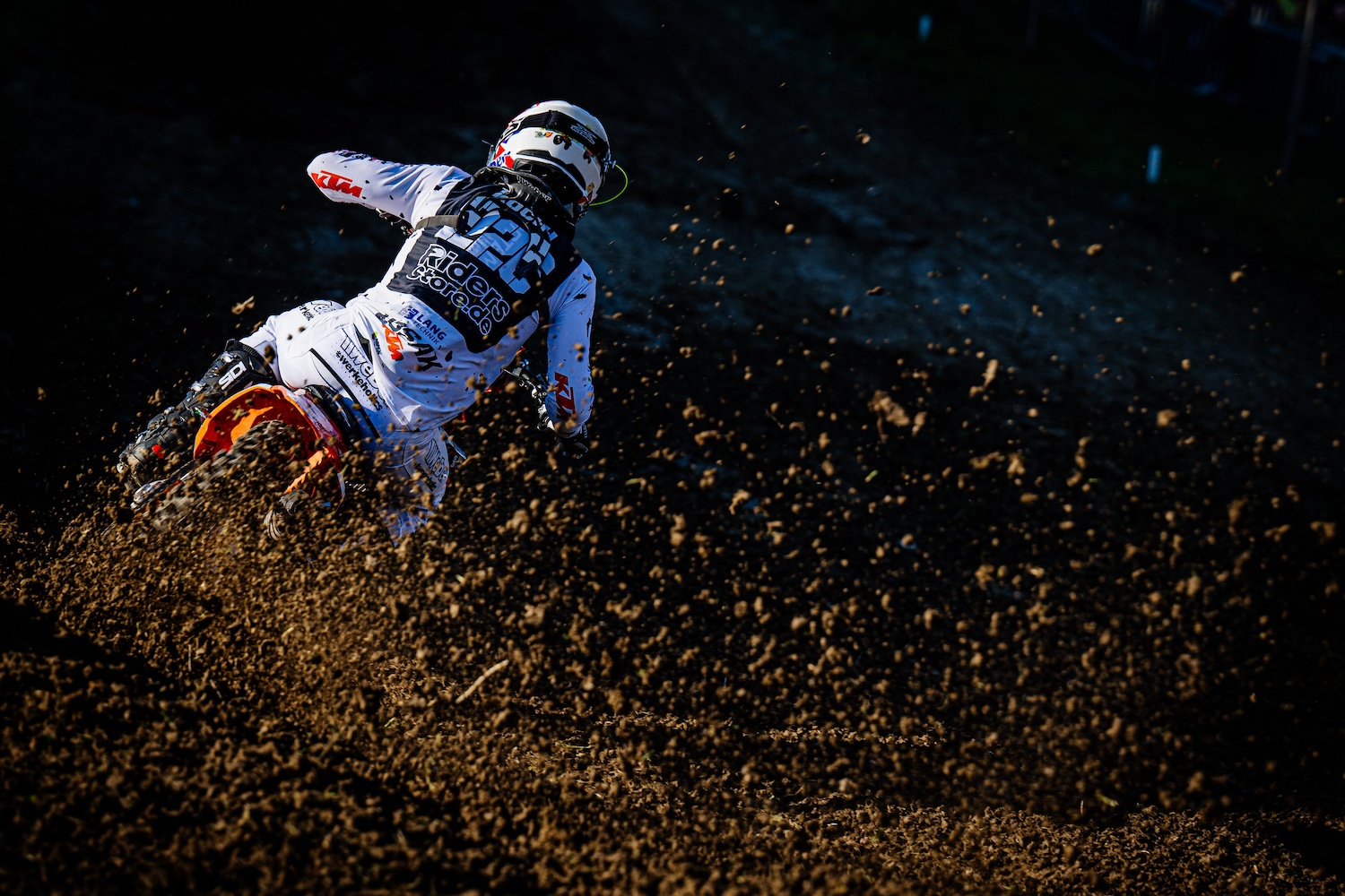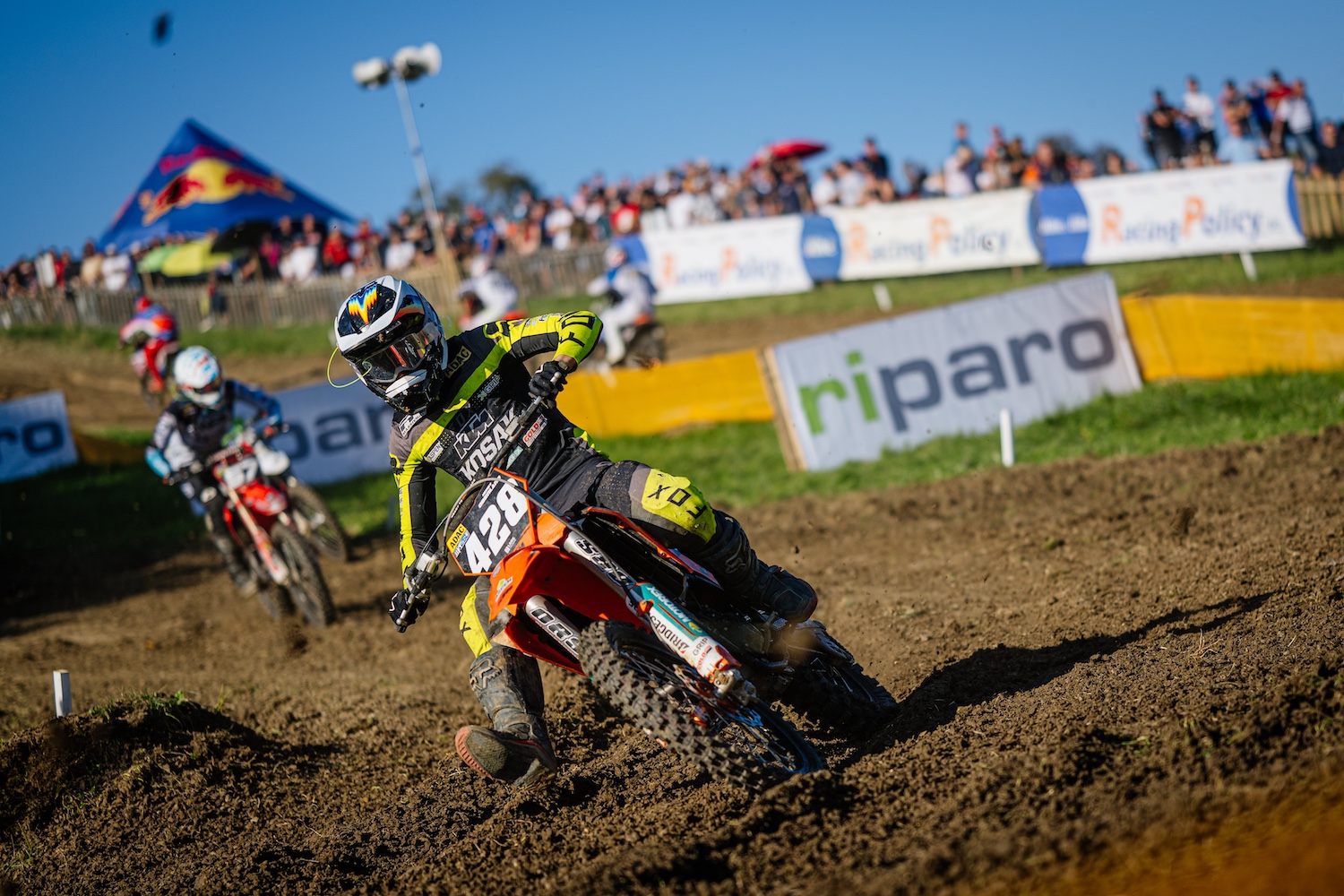 Bradley Meesters war als Tabellendritter nach Holzgerlingen angereist und wollte diesen Platz auf alle Fälle verteidigen oder wieder verbessern. In der Qualifikation musste er sich an die besonderen Bedingungen der Naturstrecke gewöhnen und platzierte sich als Neunter. Doch schon im ersten Rennen untermauerte er sein Vorhaben, als er nach gutem Start in der vierten Runde die Spitze übernahm und das Feld bis zwei Runden anführte. Dann wurde er von einen Angriff vom sicheren Meister überrascht, hielt sich aber dicht dahinter auf dem zweiten Platz, bis in der vorletzten Runde die Defekthexe zuschlug. In einer sehr tiefen Spurrille verbog es die Kettenführung und bei der Anfahrt zum Zielsprung blieb die Maschine stehen, weil die Kette abgesprungen war. Bradley reagierte blitzschnell, brachte die Kette wieder in Position und nahm die letzte Runde in Angriff. Durch den großen Vorsprung kostete die Aktion nur zwei Plätze. Als Vierter fuhr er wieder auf den Zielsprung zu, als ihm noch einmal das gleiche Schicksal ereilte. Diesmal versuchte er nicht die Kette wieder in die Führung zu bringen, sondern probierte das Motorrad auf den steilen Zielsprung zu schieben. Als er etwa die Hälfte oben war gab er auf, nicht wissend, dass er mit der Schiebeaktion den Transponder über die Zeitmessung gebracht hatte und als Fünfer gewertet wurde. Im zweiten Rennen kam Bradley erneut gut aus dem Startgatter. Mit schnellen Zeiten setzte er sich in der zweiten Runde an die Spitze und hielt die Position für mehrere Runden, bis er in einem Duell um die Führung ins straucheln kam und zu Boden musste. Als Sechster erreiche er das Ziel und war dem Vizetitel ein Stück näher gekommen. Der Start in das dritte Rennen war eher mittelmäßig. Mit einer starken Leistung fuhr er noch bis auf den vierten Platz nach vorne. In der Tageswertung wurde er Vierter und hat sich mit einer starken Leistung den Vizetitel gesichert.