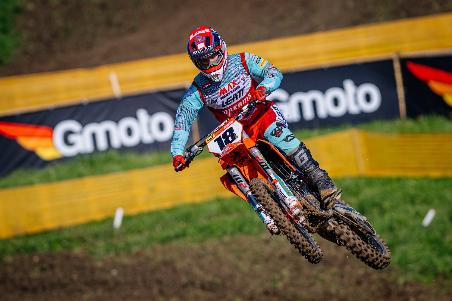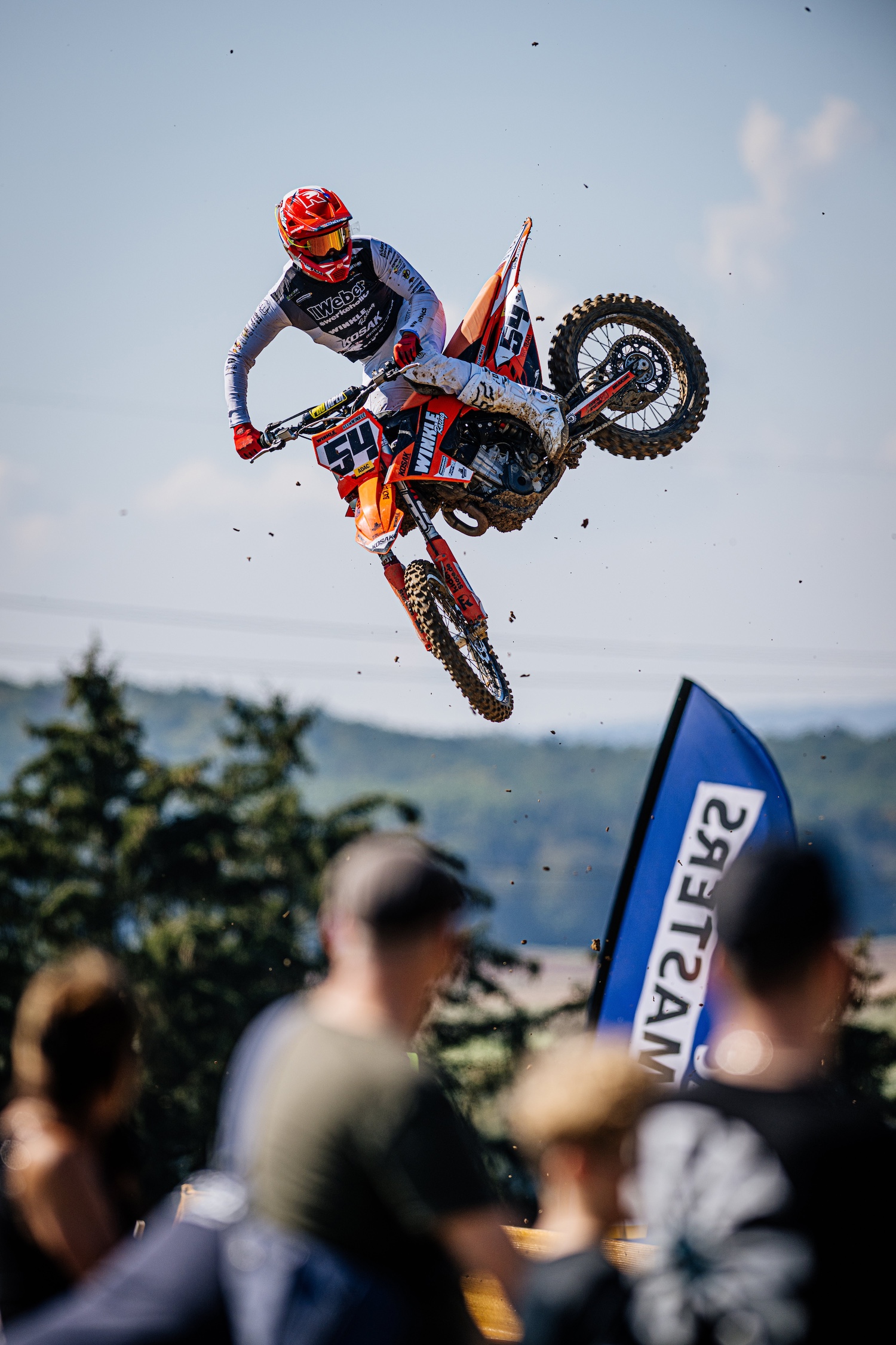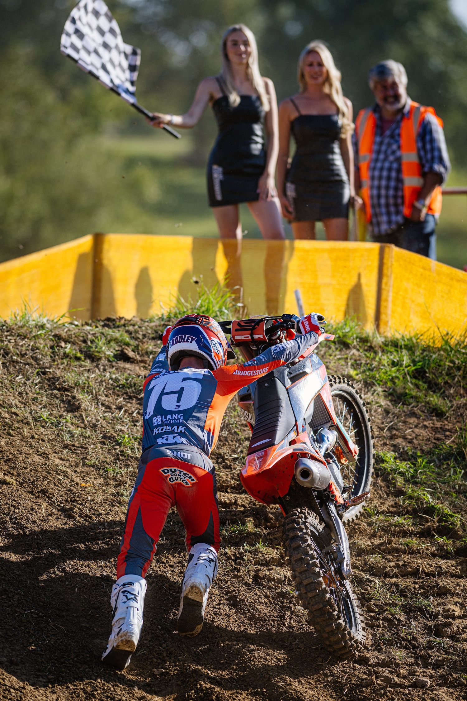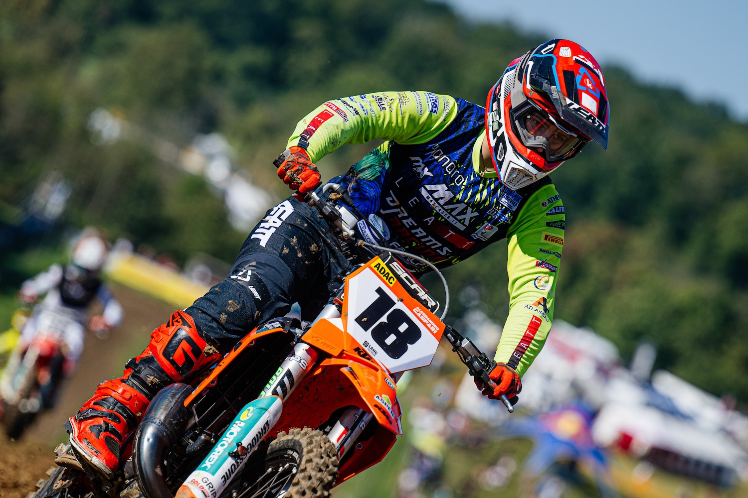 Bradley Meesters war als Tabellendritter nach Holzgerlingen angereist und wollte diesen Platz auf alle Fälle verteidigen oder wieder verbessern. In der Qualifikation musste er sich an die besonderen Bedingungen der Naturstrecke gewöhnen und platzierte sich als Neunter. Doch schon im ersten Rennen untermauerte er sein Vorhaben, als er nach gutem Start in der vierten Runde die Spitze übernahm und das Feld bis zwei Runden anführte. Dann wurde er von einen Angriff vom sicheren Meister überrascht, hielt sich aber dicht dahinter auf dem zweiten Platz, bis in der vorletzten Runde die Defekthexe zuschlug. In einer sehr tiefen Spurrille verbog es die Kettenführung und bei der Anfahrt zum Zielsprung blieb die Maschine stehen, weil die Kette abgesprungen war. Bradley reagierte blitzschnell, brachte die Kette wieder in Position und nahm die letzte Runde in Angriff. Durch den großen Vorsprung kostete die Aktion nur zwei Plätze. Als Vierter fuhr er wieder auf den Zielsprung zu, als ihm noch einmal das gleiche Schicksal ereilte. Diesmal versuchte er nicht die Kette wieder in die Führung zu bringen, sondern probierte das Motorrad auf den steilen Zielsprung zu schieben. Als er etwa die Hälfte oben war gab er auf, nicht wissend, dass er mit der Schiebeaktion den Transponder über die Zeitmessung gebracht hatte und als Fünfer gewertet wurde. Im zweiten Rennen kam Bradley erneut gut aus dem Startgatter. Mit schnellen Zeiten setzte er sich in der zweiten Runde an die Spitze und hielt die Position für mehrere Runden, bis er in einem Duell um die Führung ins straucheln kam und zu Boden musste. Als Sechster erreiche er das Ziel und war dem Vizetitel ein Stück näher gekommen. Der Start in das dritte Rennen war eher mittelmäßig. Mit einer starken Leistung fuhr er noch bis auf den vierten Platz nach vorne. In der Tageswertung wurde er Vierter und hat sich mit einer starken Leistung den Vizetitel gesichert.