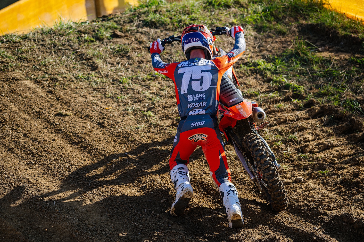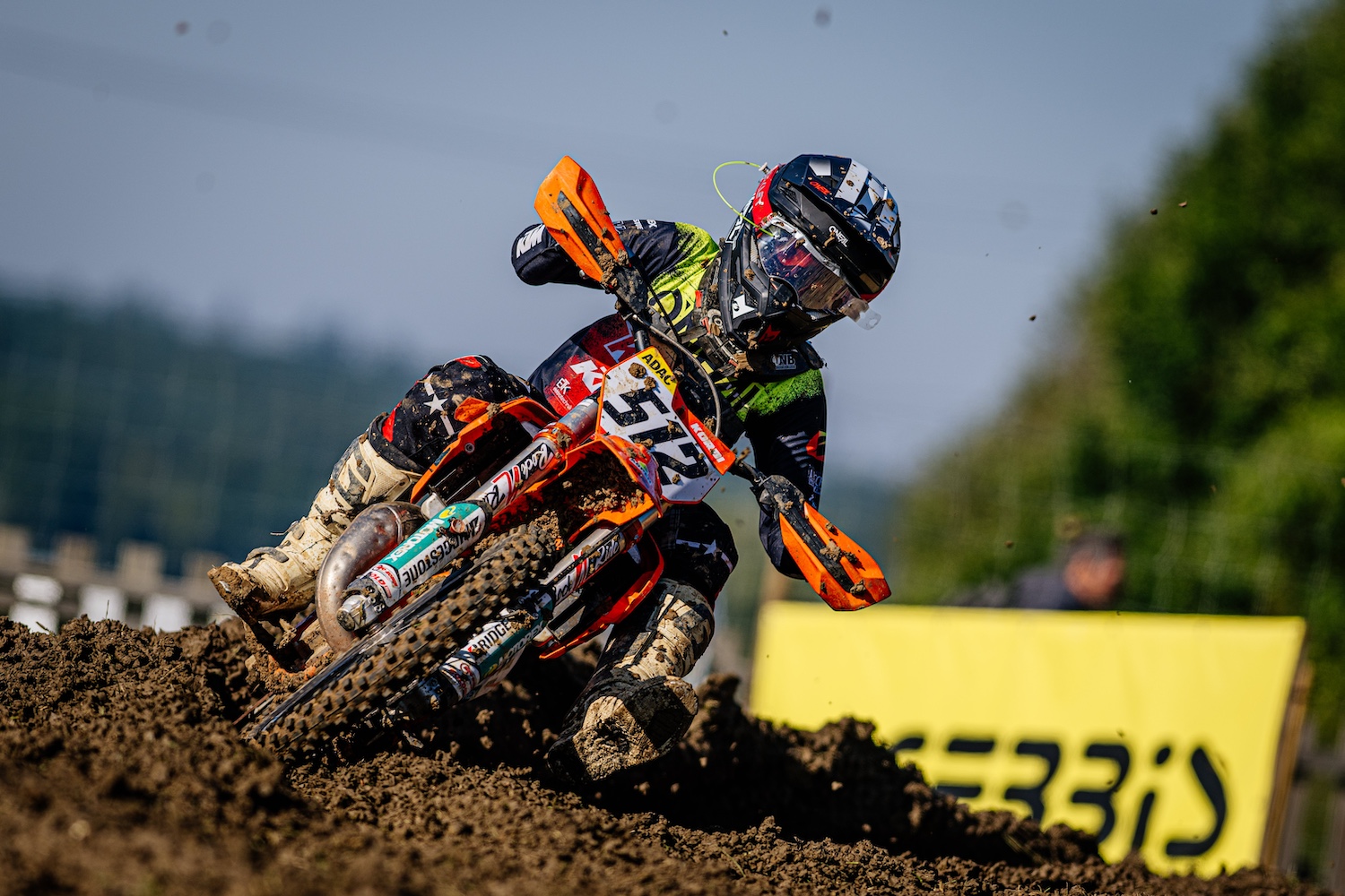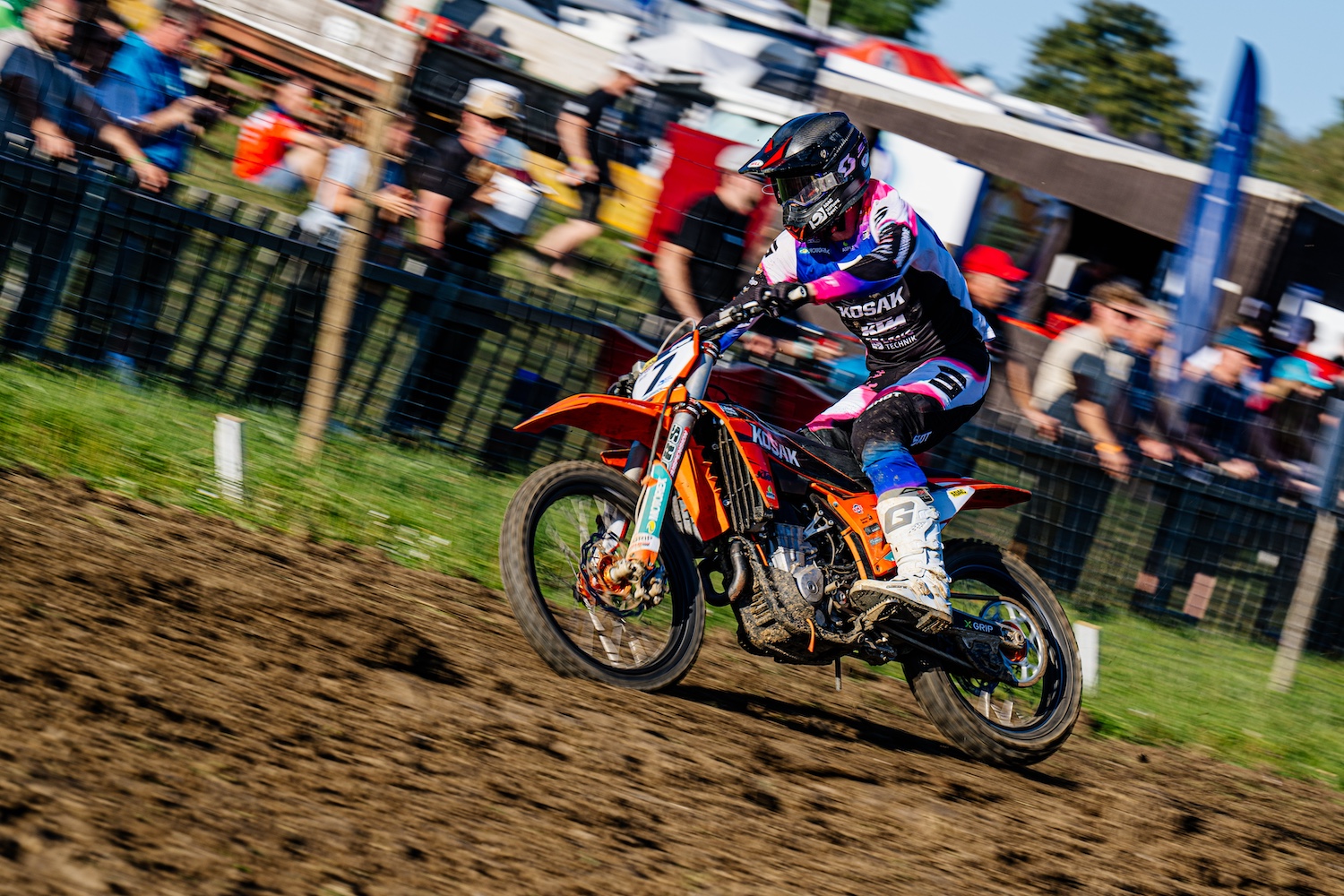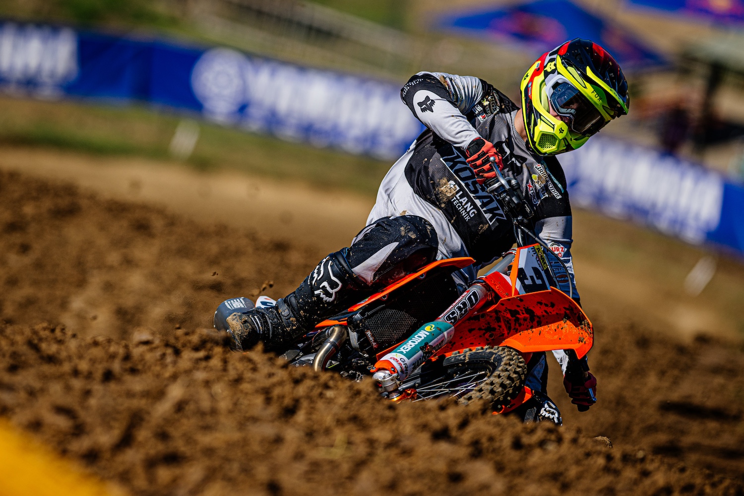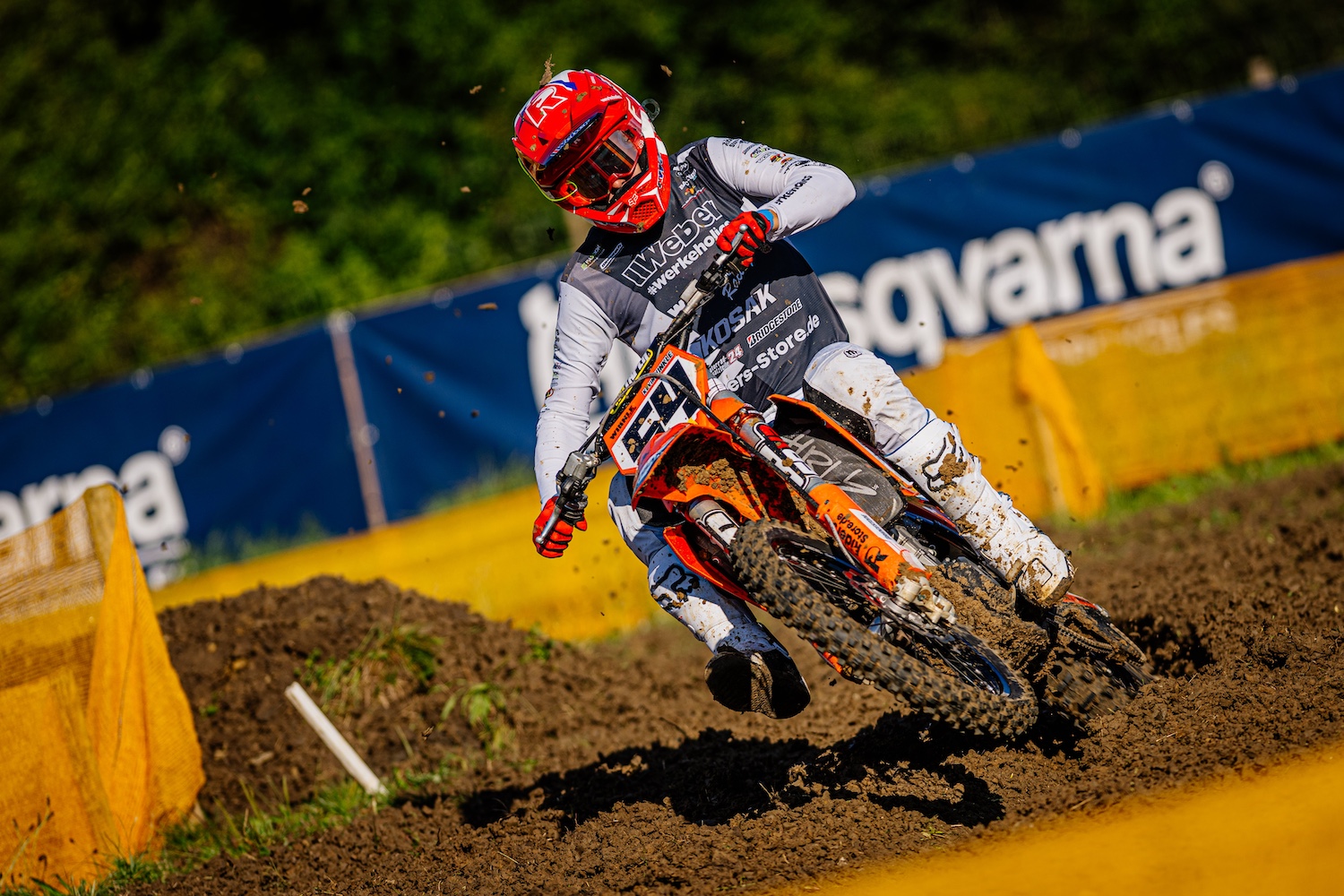 Bradley Meesters war als Tabellendritter nach Holzgerlingen angereist und wollte diesen Platz auf alle Fälle verteidigen oder wieder verbessern. In der Qualifikation musste er sich an die besonderen Bedingungen der Naturstrecke gewöhnen und platzierte sich als Neunter. Doch schon im ersten Rennen untermauerte er sein Vorhaben, als er nach gutem Start in der vierten Runde die Spitze übernahm und das Feld bis zwei Runden anführte. Dann wurde er von einen Angriff vom sicheren Meister überrascht, hielt sich aber dicht dahinter auf dem zweiten Platz, bis in der vorletzten Runde die Defekthexe zuschlug. In einer sehr tiefen Spurrille verbog es die Kettenführung und bei der Anfahrt zum Zielsprung blieb die Maschine stehen, weil die Kette abgesprungen war. Bradley reagierte blitzschnell, brachte die Kette wieder in Position und nahm die letzte Runde in Angriff. Durch den großen Vorsprung kostete die Aktion nur zwei Plätze. Als Vierter fuhr er wieder auf den Zielsprung zu, als ihm noch einmal das gleiche Schicksal ereilte. Diesmal versuchte er nicht die Kette wieder in die Führung zu bringen, sondern probierte das Motorrad auf den steilen Zielsprung zu schieben. Als er etwa die Hälfte oben war gab er auf, nicht wissend, dass er mit der Schiebeaktion den Transponder über die Zeitmessung gebracht hatte und als Fünfer gewertet wurde. Im zweiten Rennen kam Bradley erneut gut aus dem Startgatter. Mit schnellen Zeiten setzte er sich in der zweiten Runde an die Spitze und hielt die Position für mehrere Runden, bis er in einem Duell um die Führung ins straucheln kam und zu Boden musste. Als Sechster erreiche er das Ziel und war dem Vizetitel ein Stück näher gekommen. Der Start in das dritte Rennen war eher mittelmäßig. Mit einer starken Leistung fuhr er noch bis auf den vierten Platz nach vorne. In der Tageswertung wurde er Vierter und hat sich mit einer starken Leistung den Vizetitel gesichert.