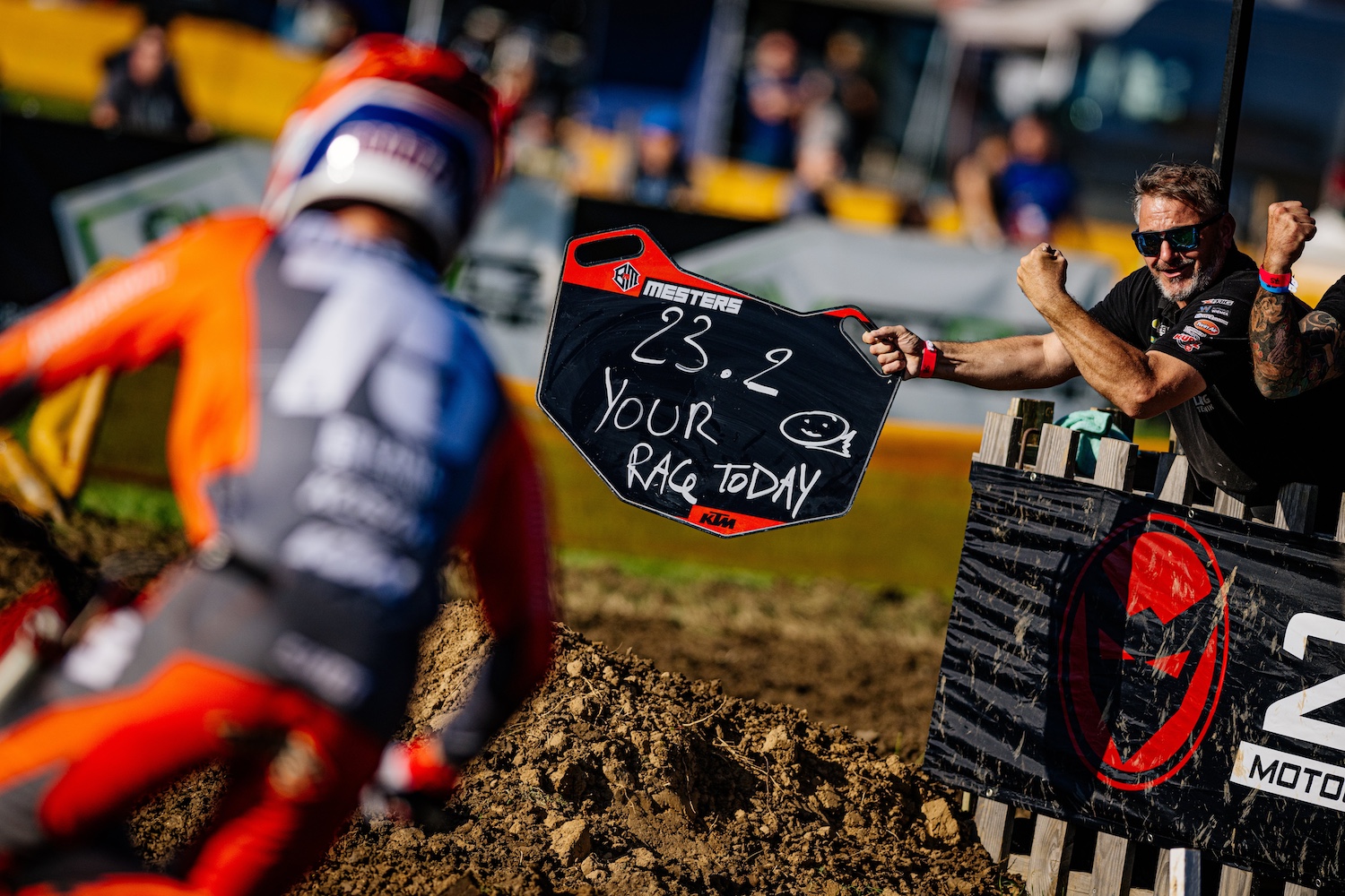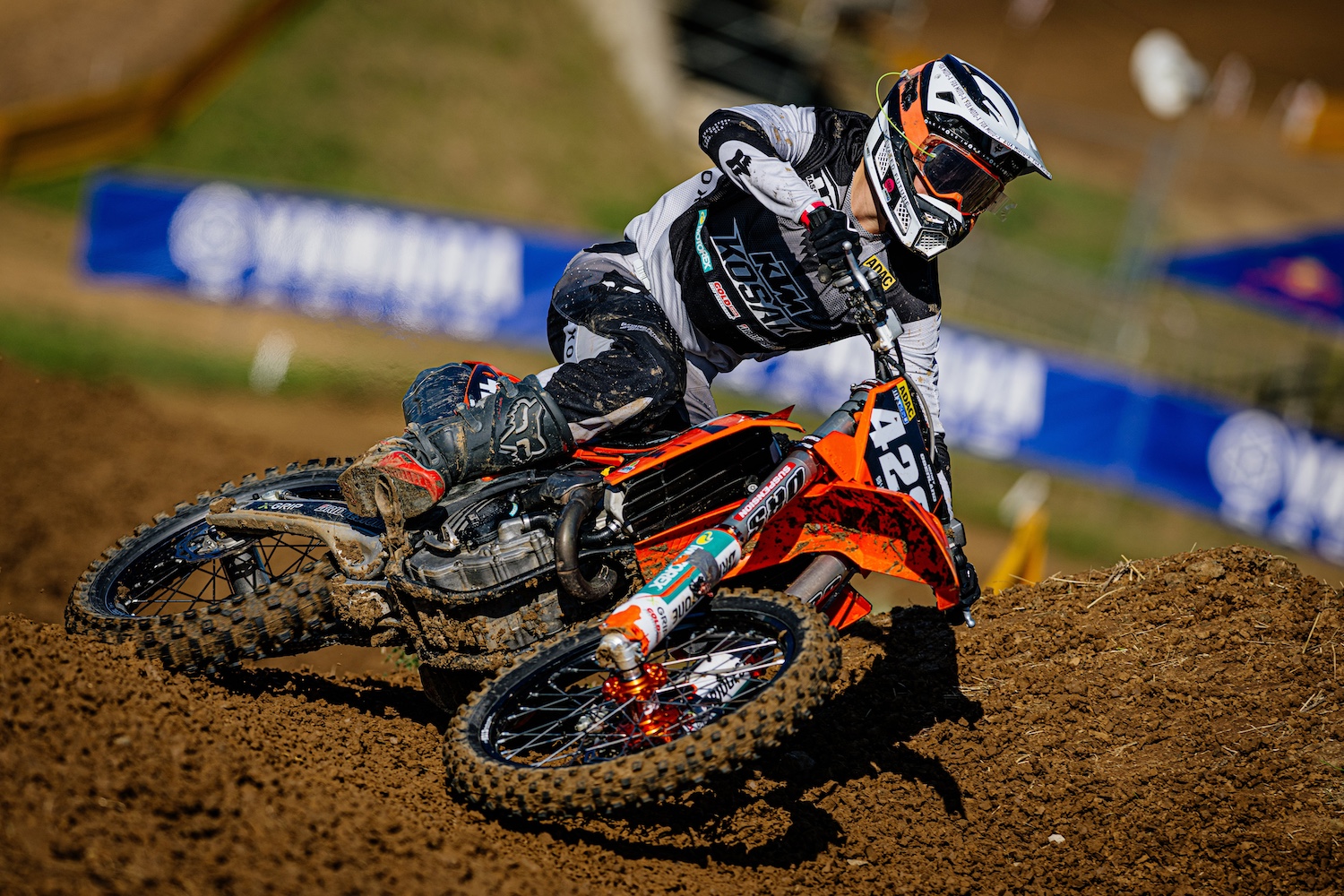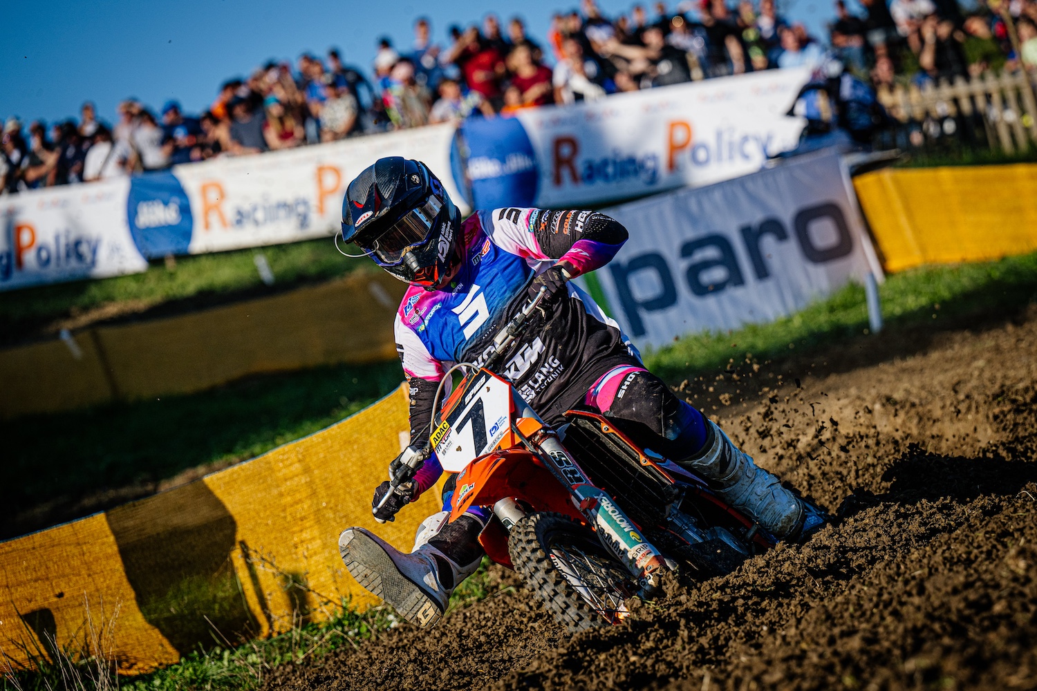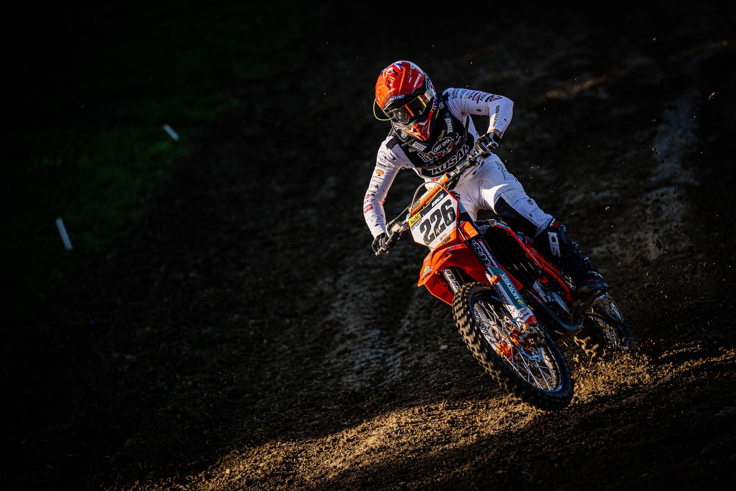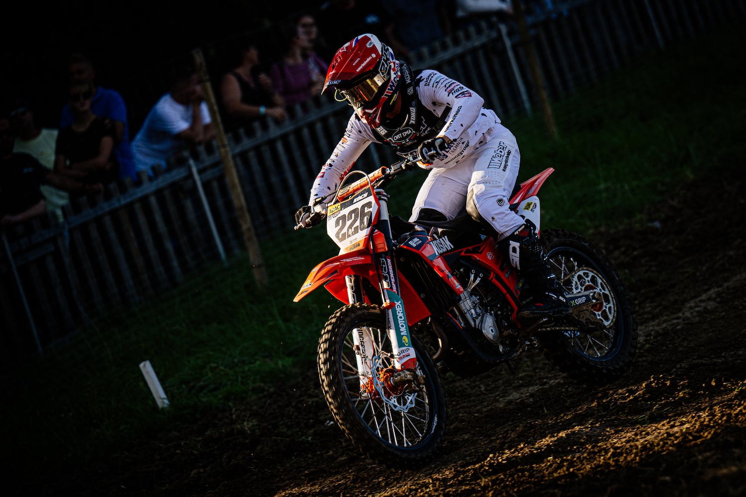 Bradley Meesters war als Tabellendritter nach Holzgerlingen angereist und wollte diesen Platz auf alle Fälle verteidigen oder wieder verbessern. In der Qualifikation musste er sich an die besonderen Bedingungen der Naturstrecke gewöhnen und platzierte sich als Neunter. Doch schon im ersten Rennen untermauerte er sein Vorhaben, als er nach gutem Start in der vierten Runde die Spitze übernahm und das Feld bis zwei Runden anführte. Dann wurde er von einen Angriff vom sicheren Meister überrascht, hielt sich aber dicht dahinter auf dem zweiten Platz, bis in der vorletzten Runde die Defekthexe zuschlug. In einer sehr tiefen Spurrille verbog es die Kettenführung und bei der Anfahrt zum Zielsprung blieb die Maschine stehen, weil die Kette abgesprungen war. Bradley reagierte blitzschnell, brachte die Kette wieder in Position und nahm die letzte Runde in Angriff. Durch den großen Vorsprung kostete die Aktion nur zwei Plätze. Als Vierter fuhr er wieder auf den Zielsprung zu, als ihm noch einmal das gleiche Schicksal ereilte. Diesmal versuchte er nicht die Kette wieder in die Führung zu bringen, sondern probierte das Motorrad auf den steilen Zielsprung zu schieben. Als er etwa die Hälfte oben war gab er auf, nicht wissend, dass er mit der Schiebeaktion den Transponder über die Zeitmessung gebracht hatte und als Fünfer gewertet wurde. Im zweiten Rennen kam Bradley erneut gut aus dem Startgatter. Mit schnellen Zeiten setzte er sich in der zweiten Runde an die Spitze und hielt die Position für mehrere Runden, bis er in einem Duell um die Führung ins straucheln kam und zu Boden musste. Als Sechster erreiche er das Ziel und war dem Vizetitel ein Stück näher gekommen. Der Start in das dritte Rennen war eher mittelmäßig. Mit einer starken Leistung fuhr er noch bis auf den vierten Platz nach vorne. In der Tageswertung wurde er Vierter und hat sich mit einer starken Leistung den Vizetitel gesichert.