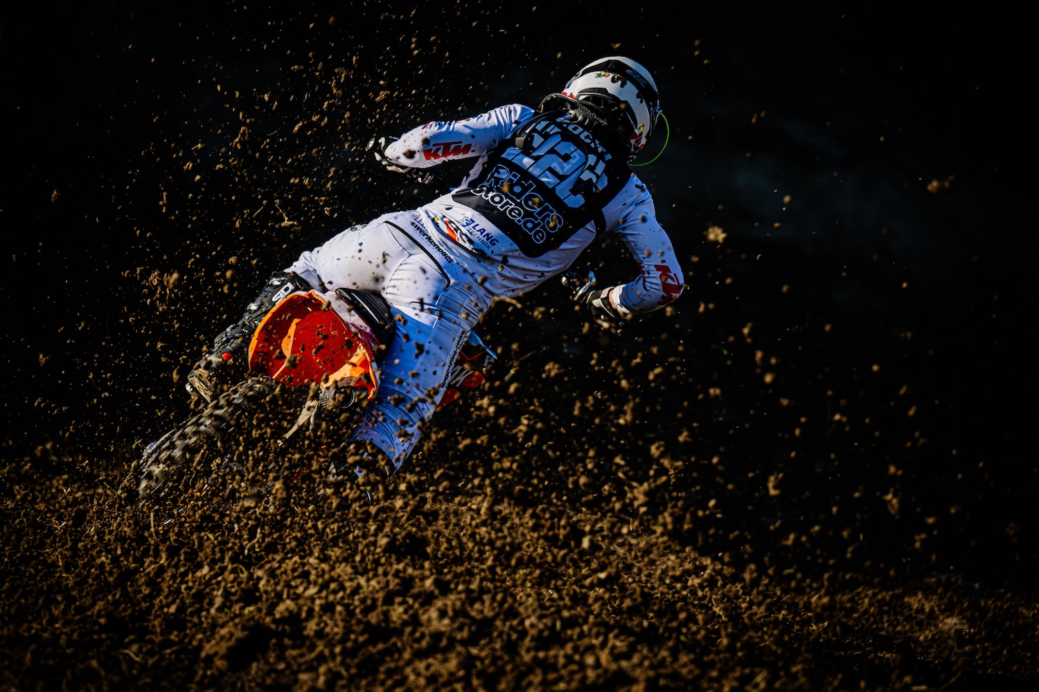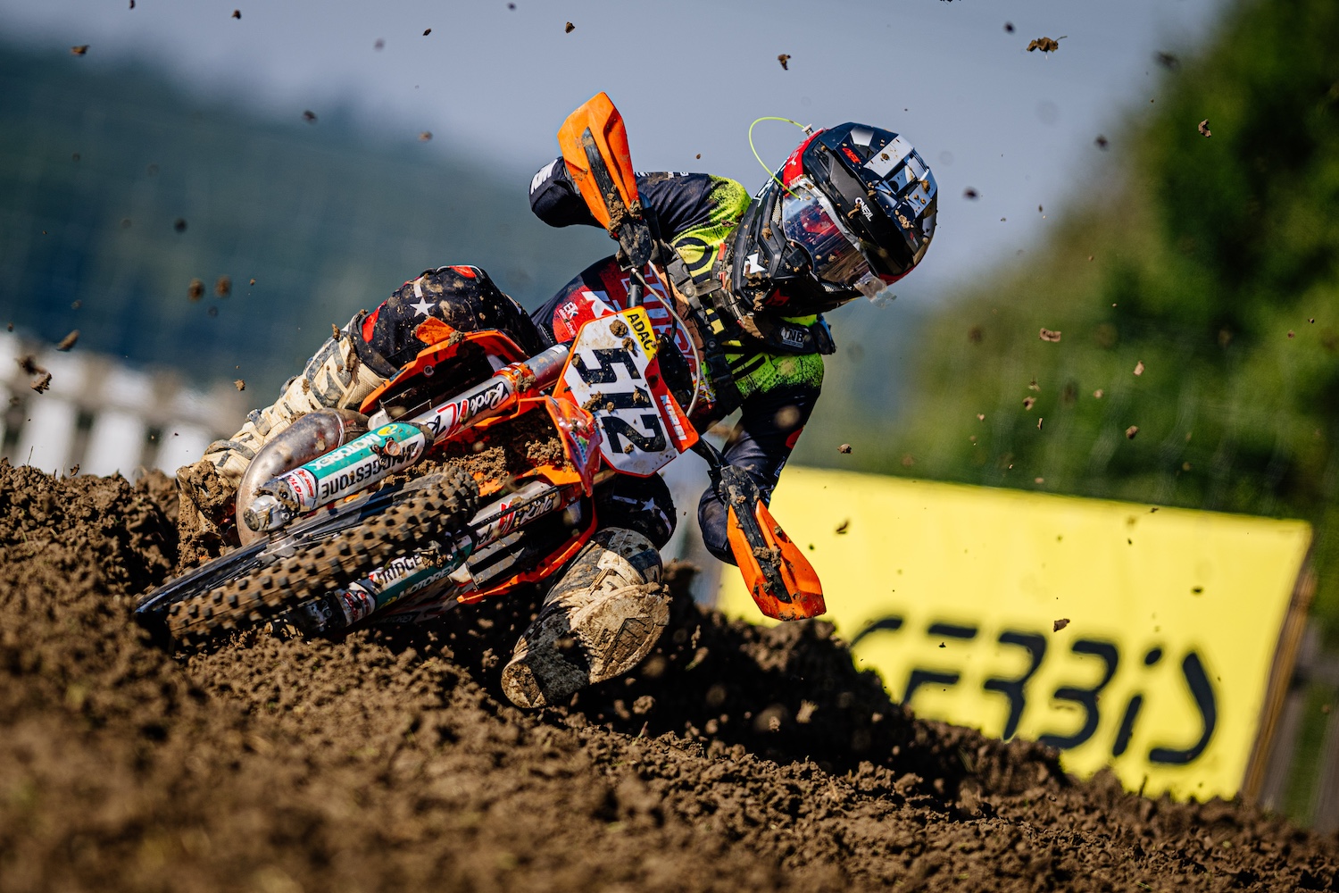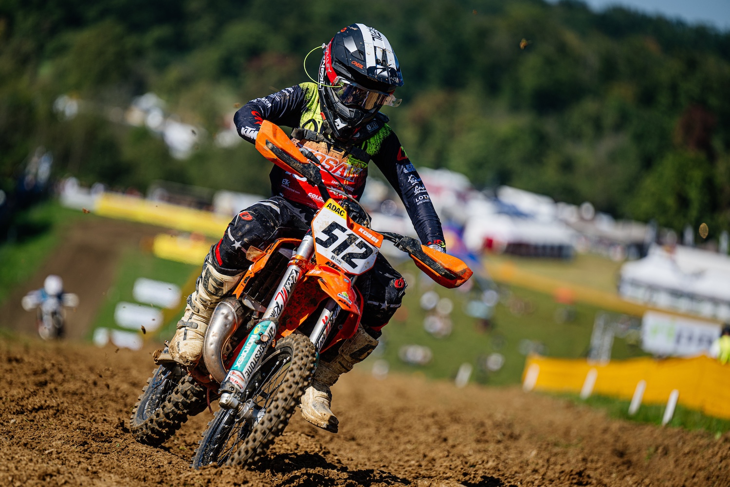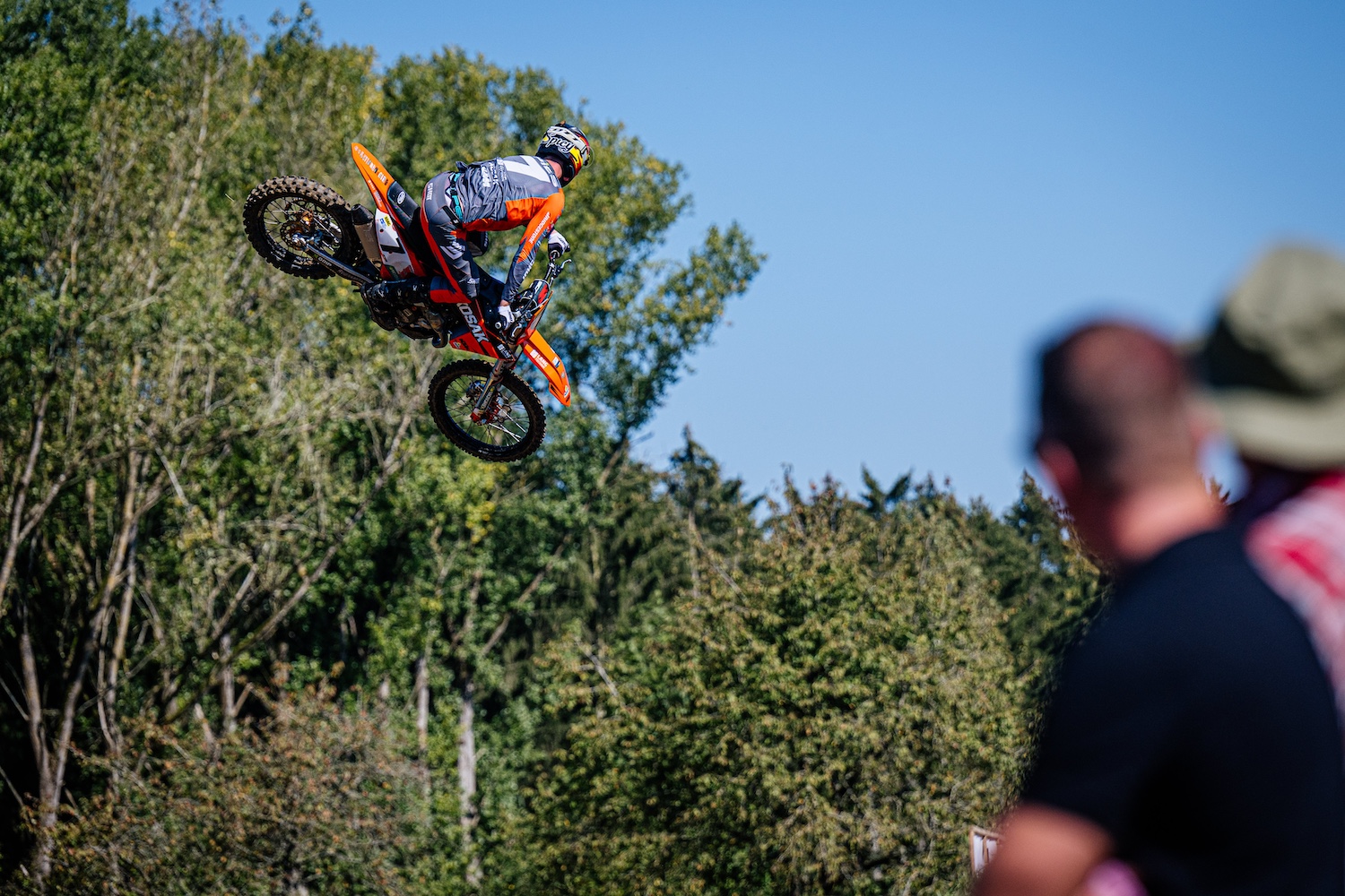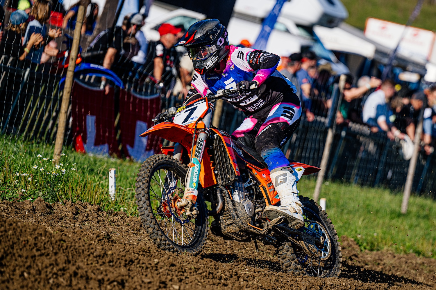 Bradley Meesters war als Tabellendritter nach Holzgerlingen angereist und wollte diesen Platz auf alle Fälle verteidigen oder wieder verbessern. In der Qualifikation musste er sich an die besonderen Bedingungen der Naturstrecke gewöhnen und platzierte sich als Neunter. Doch schon im ersten Rennen untermauerte er sein Vorhaben, als er nach gutem Start in der vierten Runde die Spitze übernahm und das Feld bis zwei Runden anführte. Dann wurde er von einen Angriff vom sicheren Meister überrascht, hielt sich aber dicht dahinter auf dem zweiten Platz, bis in der vorletzten Runde die Defekthexe zuschlug. In einer sehr tiefen Spurrille verbog es die Kettenführung und bei der Anfahrt zum Zielsprung blieb die Maschine stehen, weil die Kette abgesprungen war. Bradley reagierte blitzschnell, brachte die Kette wieder in Position und nahm die letzte Runde in Angriff. Durch den großen Vorsprung kostete die Aktion nur zwei Plätze. Als Vierter fuhr er wieder auf den Zielsprung zu, als ihm noch einmal das gleiche Schicksal ereilte. Diesmal versuchte er nicht die Kette wieder in die Führung zu bringen, sondern probierte das Motorrad auf den steilen Zielsprung zu schieben. Als er etwa die Hälfte oben war gab er auf, nicht wissend, dass er mit der Schiebeaktion den Transponder über die Zeitmessung gebracht hatte und als Fünfer gewertet wurde. Im zweiten Rennen kam Bradley erneut gut aus dem Startgatter. Mit schnellen Zeiten setzte er sich in der zweiten Runde an die Spitze und hielt die Position für mehrere Runden, bis er in einem Duell um die Führung ins straucheln kam und zu Boden musste. Als Sechster erreiche er das Ziel und war dem Vizetitel ein Stück näher gekommen. Der Start in das dritte Rennen war eher mittelmäßig. Mit einer starken Leistung fuhr er noch bis auf den vierten Platz nach vorne. In der Tageswertung wurde er Vierter und hat sich mit einer starken Leistung den Vizetitel gesichert.