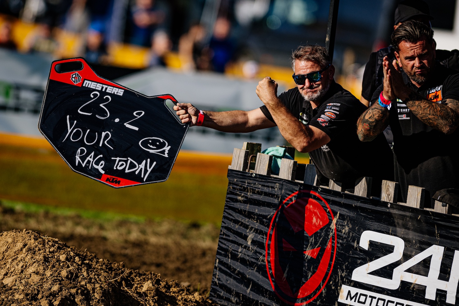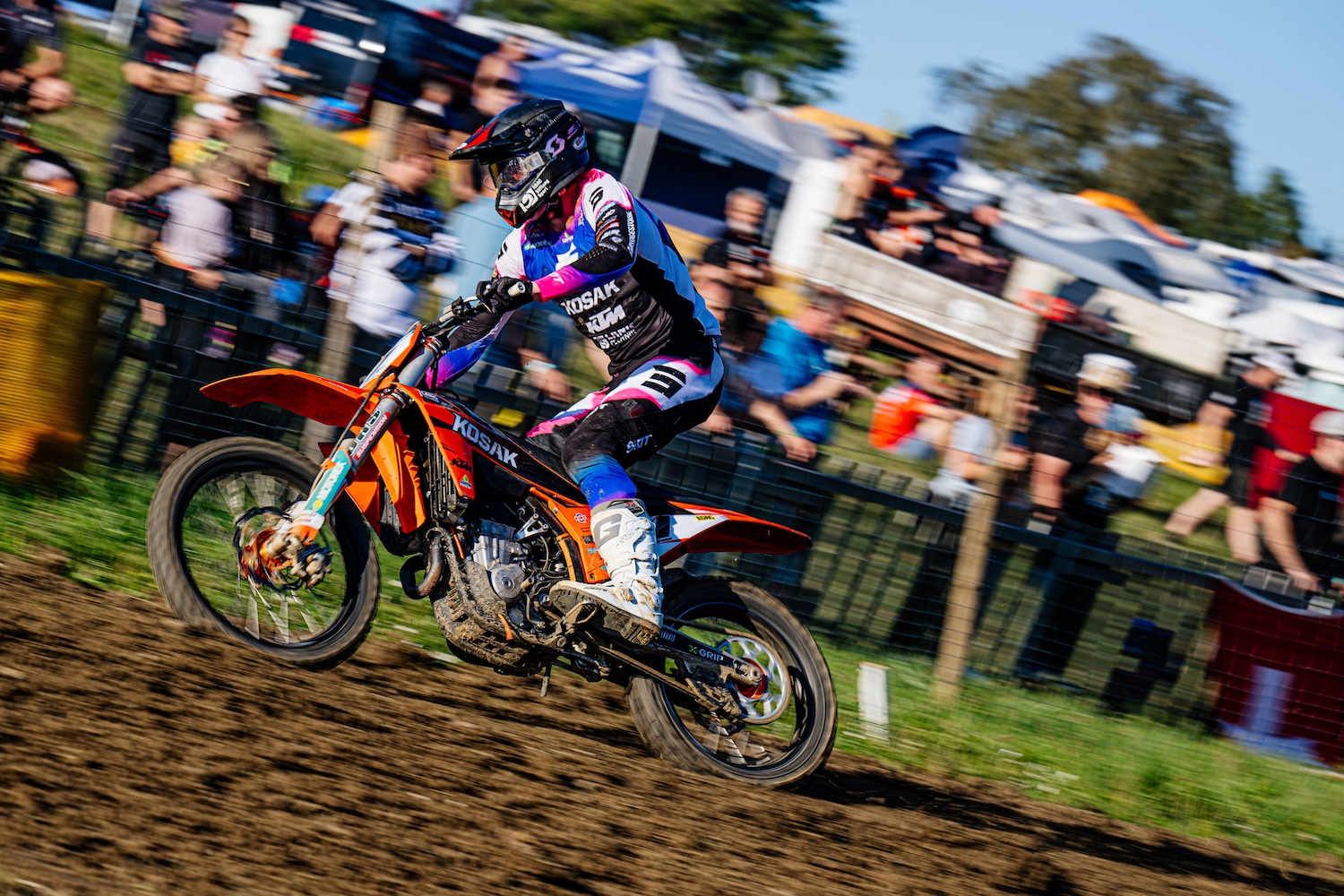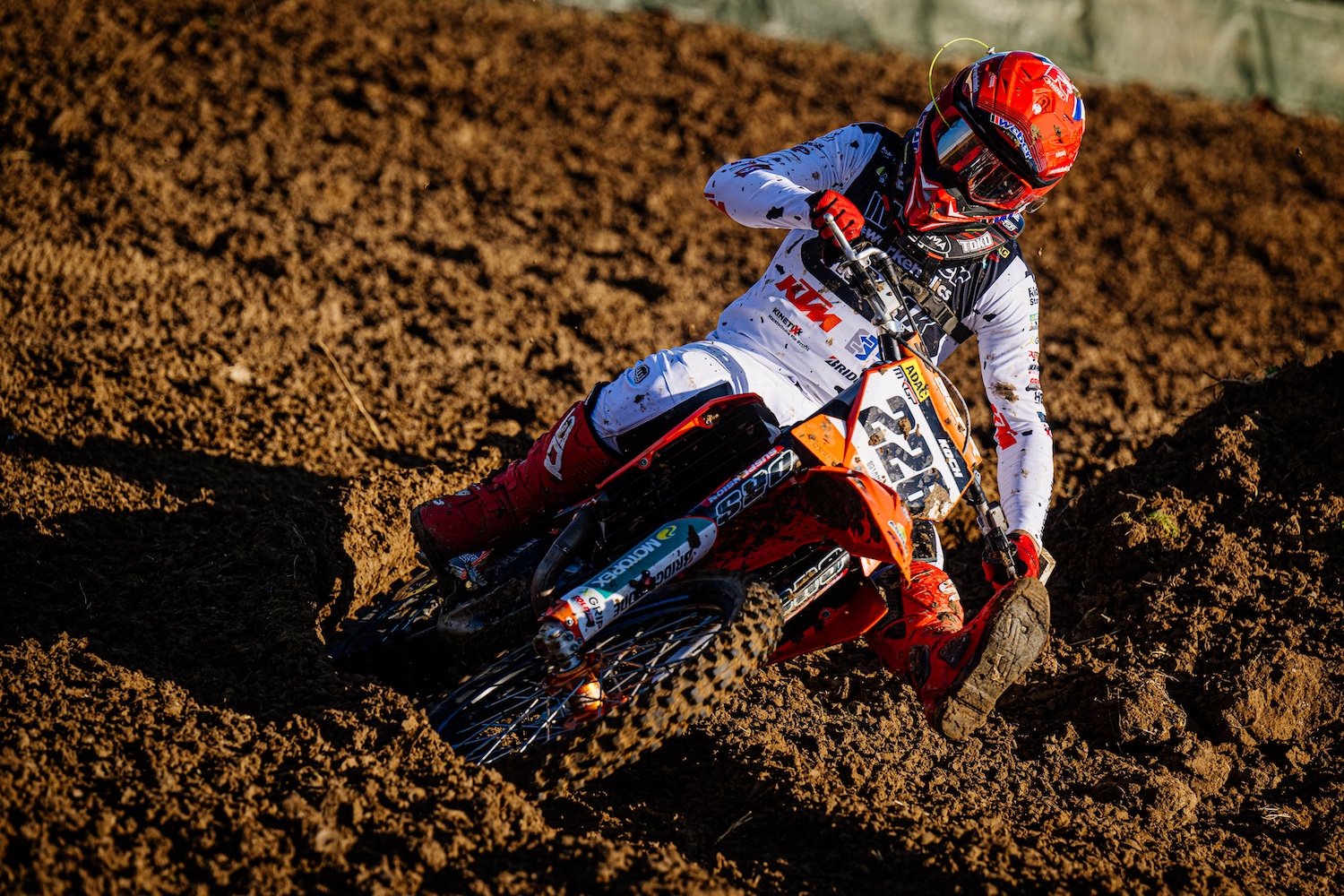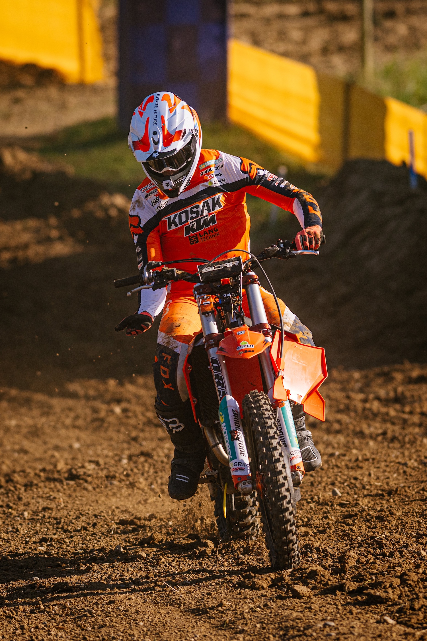 Bradley Meesters war als Tabellendritter nach Holzgerlingen angereist und wollte diesen Platz auf alle Fälle verteidigen oder wieder verbessern. In der Qualifikation musste er sich an die besonderen Bedingungen der Naturstrecke gewöhnen und platzierte sich als Neunter. Doch schon im ersten Rennen untermauerte er sein Vorhaben, als er nach gutem Start in der vierten Runde die Spitze übernahm und das Feld bis zwei Runden anführte. Dann wurde er von einen Angriff vom sicheren Meister überrascht, hielt sich aber dicht dahinter auf dem zweiten Platz, bis in der vorletzten Runde die Defekthexe zuschlug. In einer sehr tiefen Spurrille verbog es die Kettenführung und bei der Anfahrt zum Zielsprung blieb die Maschine stehen, weil die Kette abgesprungen war. Bradley reagierte blitzschnell, brachte die Kette wieder in Position und nahm die letzte Runde in Angriff. Durch den großen Vorsprung kostete die Aktion nur zwei Plätze. Als Vierter fuhr er wieder auf den Zielsprung zu, als ihm noch einmal das gleiche Schicksal ereilte. Diesmal versuchte er nicht die Kette wieder in die Führung zu bringen, sondern probierte das Motorrad auf den steilen Zielsprung zu schieben. Als er etwa die Hälfte oben war gab er auf, nicht wissend, dass er mit der Schiebeaktion den Transponder über die Zeitmessung gebracht hatte und als Fünfer gewertet wurde. Im zweiten Rennen kam Bradley erneut gut aus dem Startgatter. Mit schnellen Zeiten setzte er sich in der zweiten Runde an die Spitze und hielt die Position für mehrere Runden, bis er in einem Duell um die Führung ins straucheln kam und zu Boden musste. Als Sechster erreiche er das Ziel und war dem Vizetitel ein Stück näher gekommen. Der Start in das dritte Rennen war eher mittelmäßig. Mit einer starken Leistung fuhr er noch bis auf den vierten Platz nach vorne. In der Tageswertung wurde er Vierter und hat sich mit einer starken Leistung den Vizetitel gesichert.