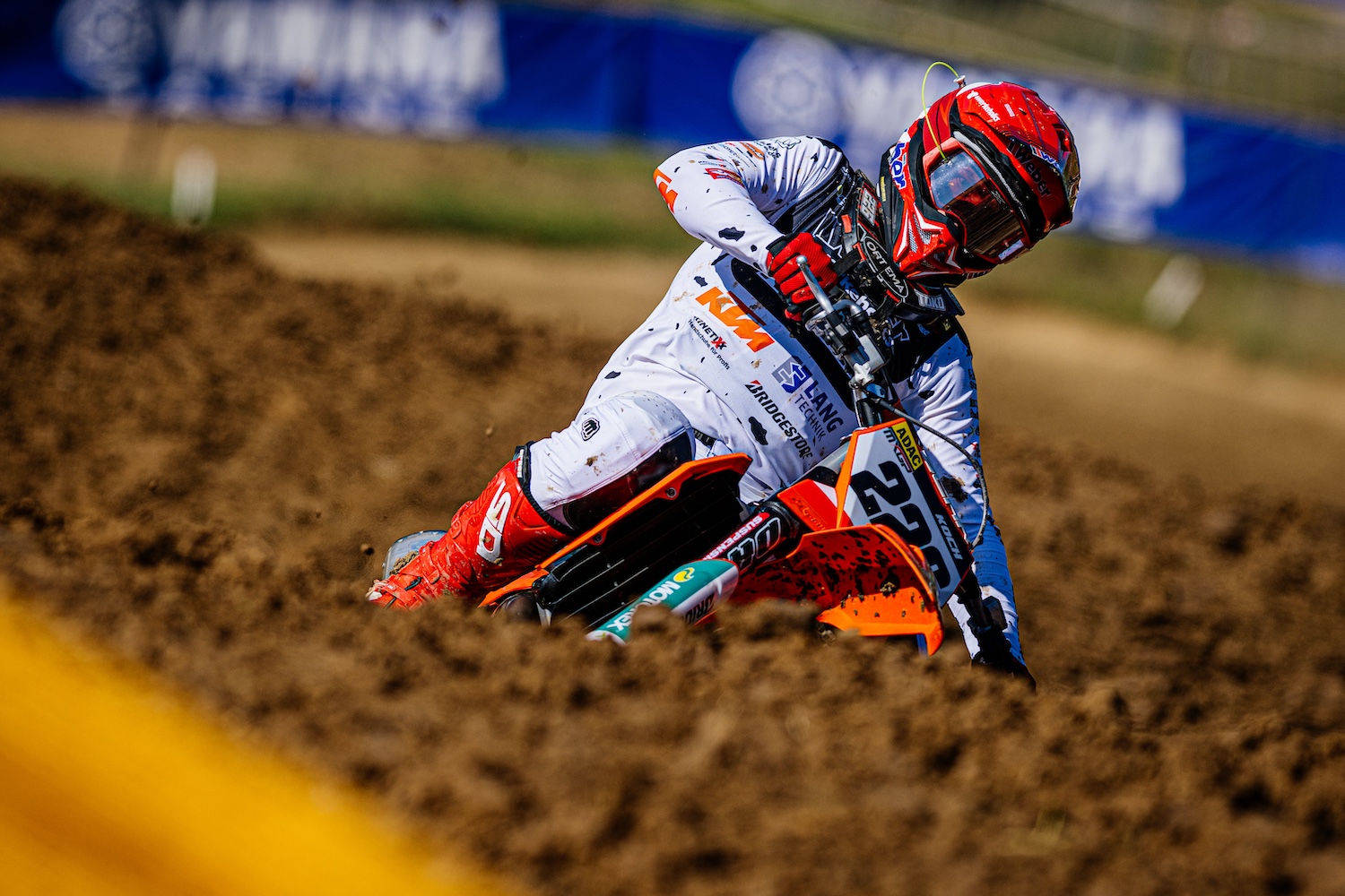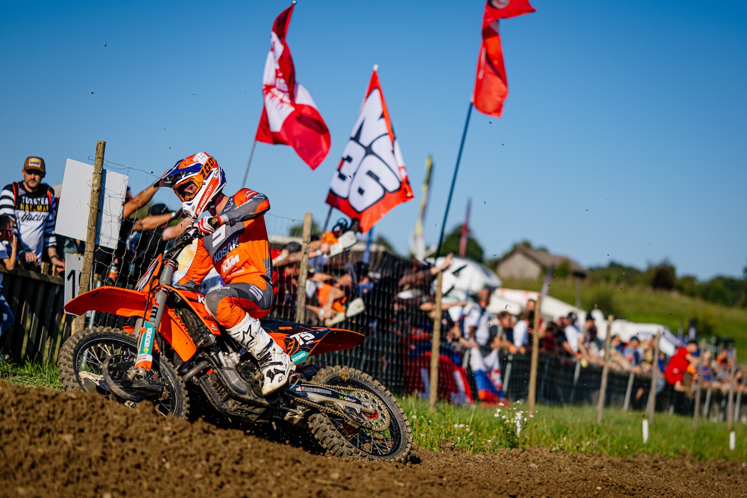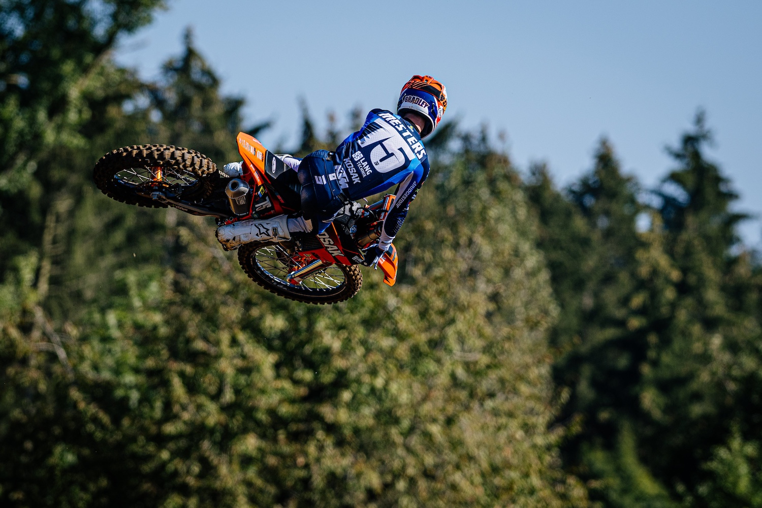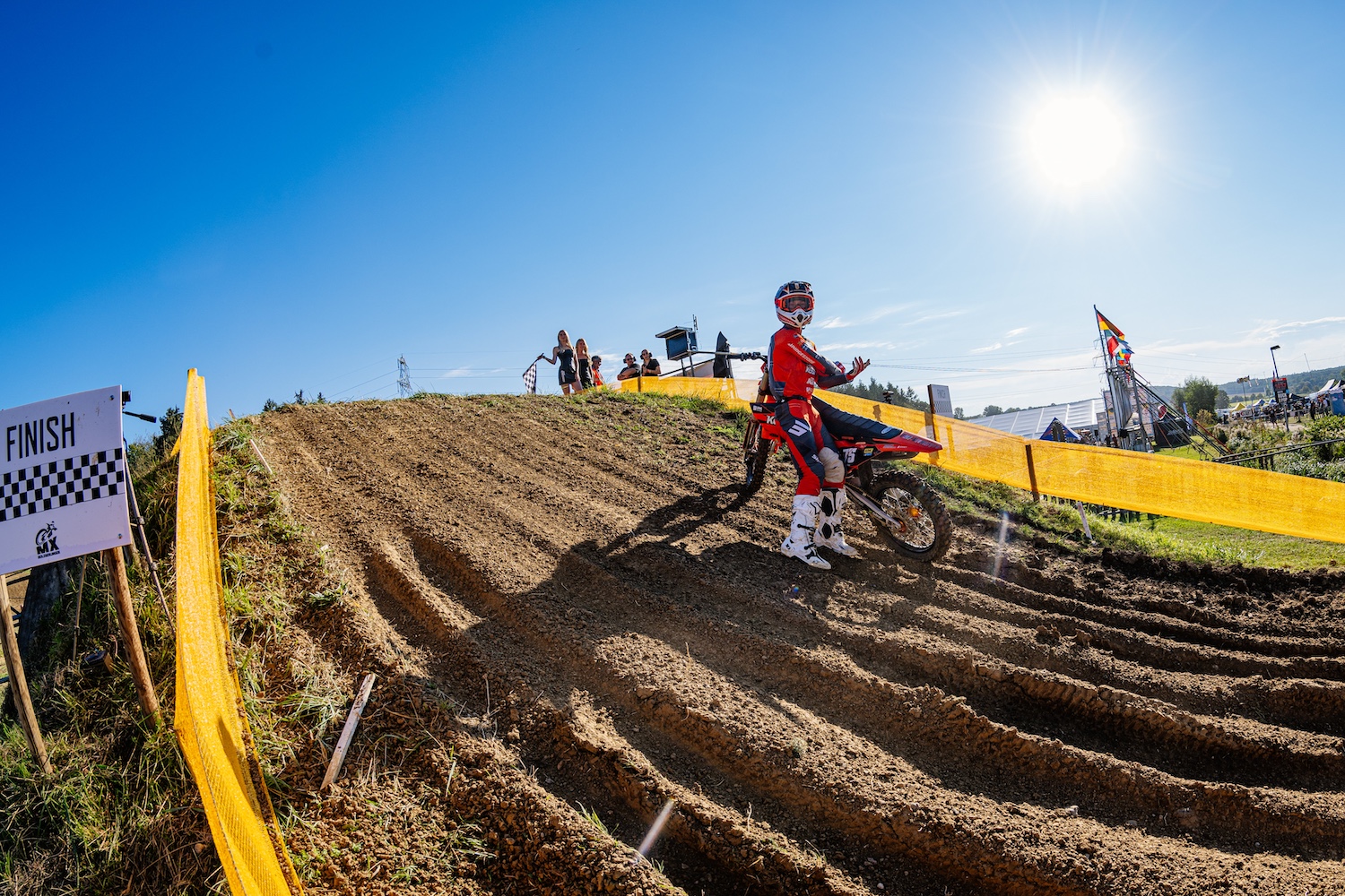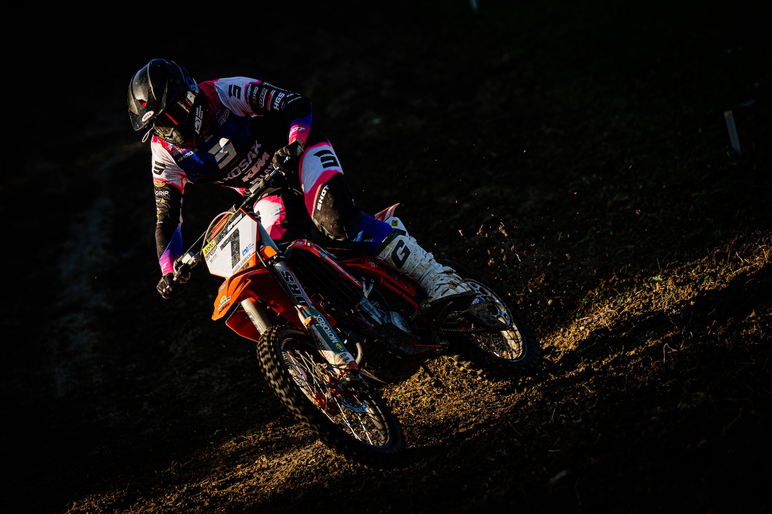 Bradley Meesters war als Tabellendritter nach Holzgerlingen angereist und wollte diesen Platz auf alle Fälle verteidigen oder wieder verbessern. In der Qualifikation musste er sich an die besonderen Bedingungen der Naturstrecke gewöhnen und platzierte sich als Neunter. Doch schon im ersten Rennen untermauerte er sein Vorhaben, als er nach gutem Start in der vierten Runde die Spitze übernahm und das Feld bis zwei Runden anführte. Dann wurde er von einen Angriff vom sicheren Meister überrascht, hielt sich aber dicht dahinter auf dem zweiten Platz, bis in der vorletzten Runde die Defekthexe zuschlug. In einer sehr tiefen Spurrille verbog es die Kettenführung und bei der Anfahrt zum Zielsprung blieb die Maschine stehen, weil die Kette abgesprungen war. Bradley reagierte blitzschnell, brachte die Kette wieder in Position und nahm die letzte Runde in Angriff. Durch den großen Vorsprung kostete die Aktion nur zwei Plätze. Als Vierter fuhr er wieder auf den Zielsprung zu, als ihm noch einmal das gleiche Schicksal ereilte. Diesmal versuchte er nicht die Kette wieder in die Führung zu bringen, sondern probierte das Motorrad auf den steilen Zielsprung zu schieben. Als er etwa die Hälfte oben war gab er auf, nicht wissend, dass er mit der Schiebeaktion den Transponder über die Zeitmessung gebracht hatte und als Fünfer gewertet wurde. Im zweiten Rennen kam Bradley erneut gut aus dem Startgatter. Mit schnellen Zeiten setzte er sich in der zweiten Runde an die Spitze und hielt die Position für mehrere Runden, bis er in einem Duell um die Führung ins straucheln kam und zu Boden musste. Als Sechster erreiche er das Ziel und war dem Vizetitel ein Stück näher gekommen. Der Start in das dritte Rennen war eher mittelmäßig. Mit einer starken Leistung fuhr er noch bis auf den vierten Platz nach vorne. In der Tageswertung wurde er Vierter und hat sich mit einer starken Leistung den Vizetitel gesichert.