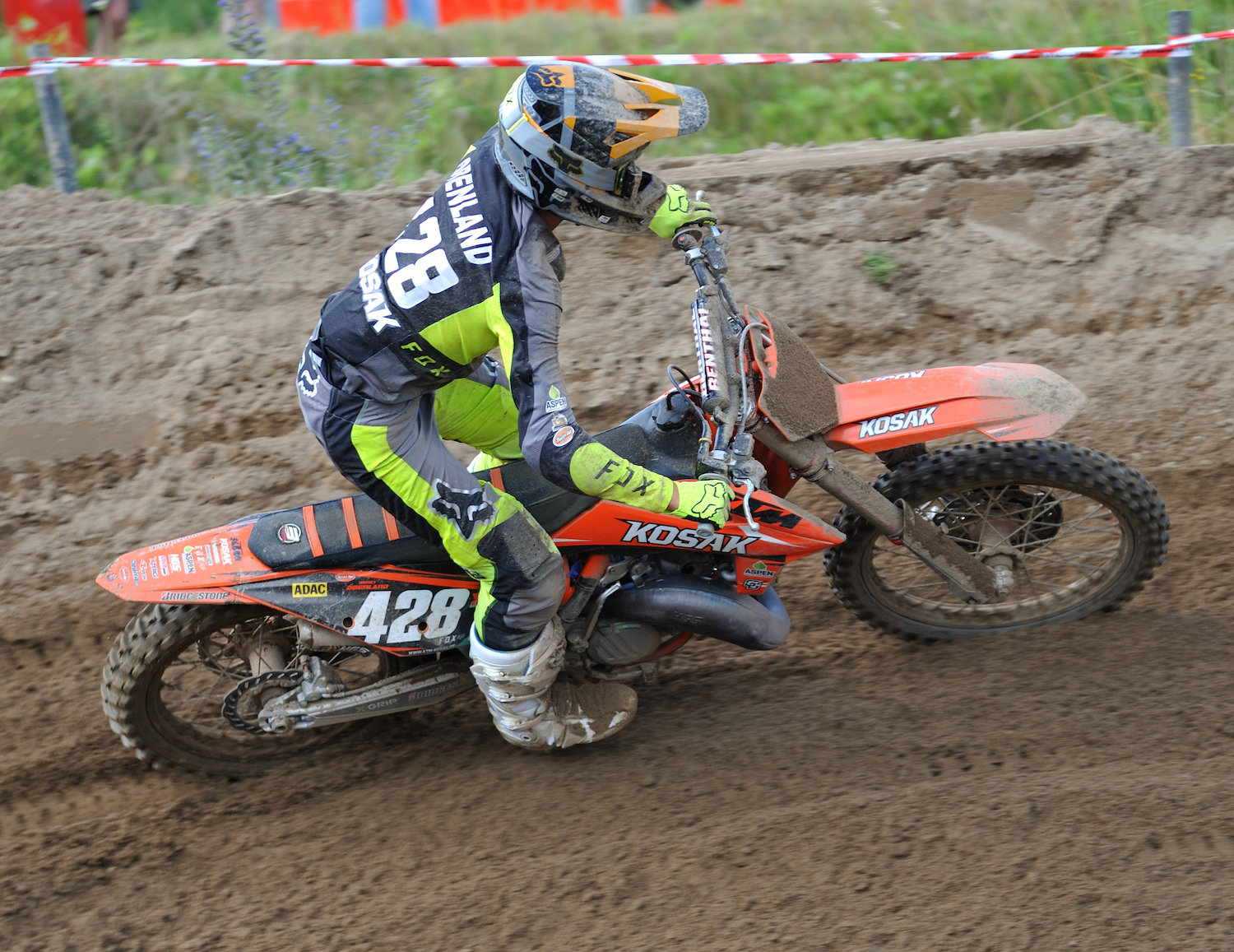 Für Valentin Kees war das Rennwochenende schon nach wenigen Runden im Zeittraining beendet. Nachdem er im vorausgegangen freien Training mit sehr guten Zeiten aufwarten konnte, stürzte er unglücklich und verletzte sich an der Hand. Da der Rennarzt einen Bruch im Unterarm nicht ausschließen konnte, empfahl er eine Röntgenuntersuchung im Krankenhaus. Kurz entschlossen fuhr er noch am Samstag mit seinem Vater nach Hause um die Untersuchung dort durchführen zu lassen. Wie sich nun herausgestellt hat, ist zum Glück nichts gebrochen und nur eine kurze Pause notwendig. Constantin Piller, der nun das Abitur in der Tasche hat und sich wieder mehr auf das Trainieren konzentrieren kann, kam im Zeittraining auf Rang drei und zeigte dass er auch im Sand schnell fahren kann. In den Rennen war aber der Start nie optimal oder er wurde durch einen Crash in der Startkurve aufgehalten und konnte erst als Letzter losfahren. Daher spiegeln die zwei Punkte aus dem ersten Lauf sein wahres Leistungsvermögen nicht wieder. Ohne Druck und allzu große Erwartungen war Paul Bloy in den Tensfelder Sandkasten gereist. Im Zeittraining gewöhnte er sich an die Bedingungen und fand als Siebzehnter seinen Platz in der Startaufstellung. Im ersten Rennen fuhr er gleich in der vorderen Hälfte des Feldes mit und arbeitete sich bis auf Platz sechzehn nach vorne. Im zweiten Durchgang, am Sonntagvormittag, war der Start nicht ganz so gut. Paul fuhr konstant vorwärts und kam nun als Fünfzehnter ins Ziel. Der Start in das dritte Rennen, lies die Boxenmannschaft in Jubel ausbrechen. Paul Bloy hatte einen perfekten Start, konnte dem kleinen Unfall nach der Startkurve ausweichen und in den ersten Runden den dritten Platz behaupten. Im Verlaufe des Rennens musste er nur noch den Sandspezialisten den Vortritt lassen und sich für den siebten Platz satte vierzehn Punkte gutschreiben lassen. Das war sein bisher bestes Ergebnis in der international besetzten Youngster Klasse. Mit insgesamt 25 eingefahrenen Punkten wurde er Elfter in der Tageswertung und liegt nun in der Meisterschaft zur Halbzeit auf Rang zwölf.