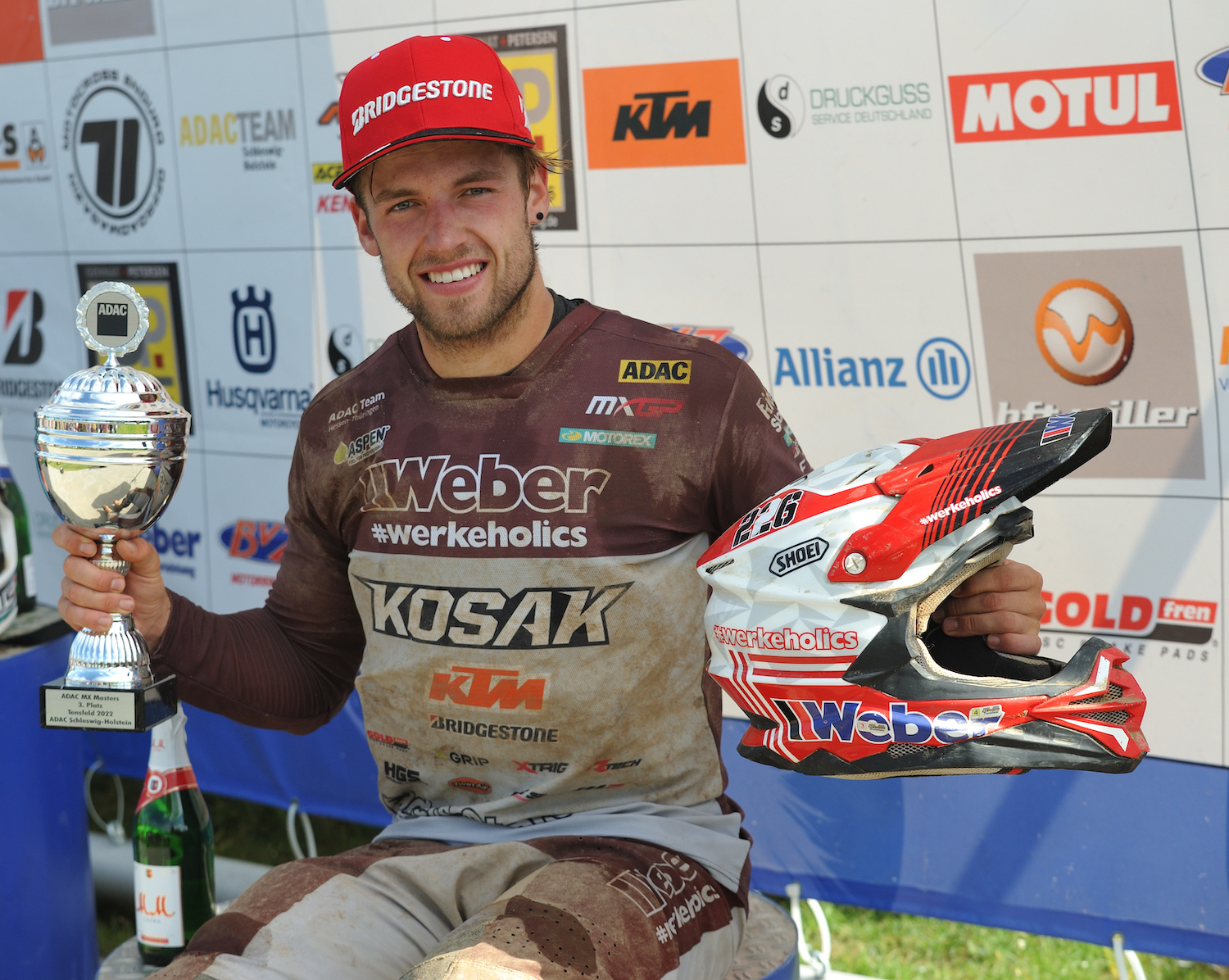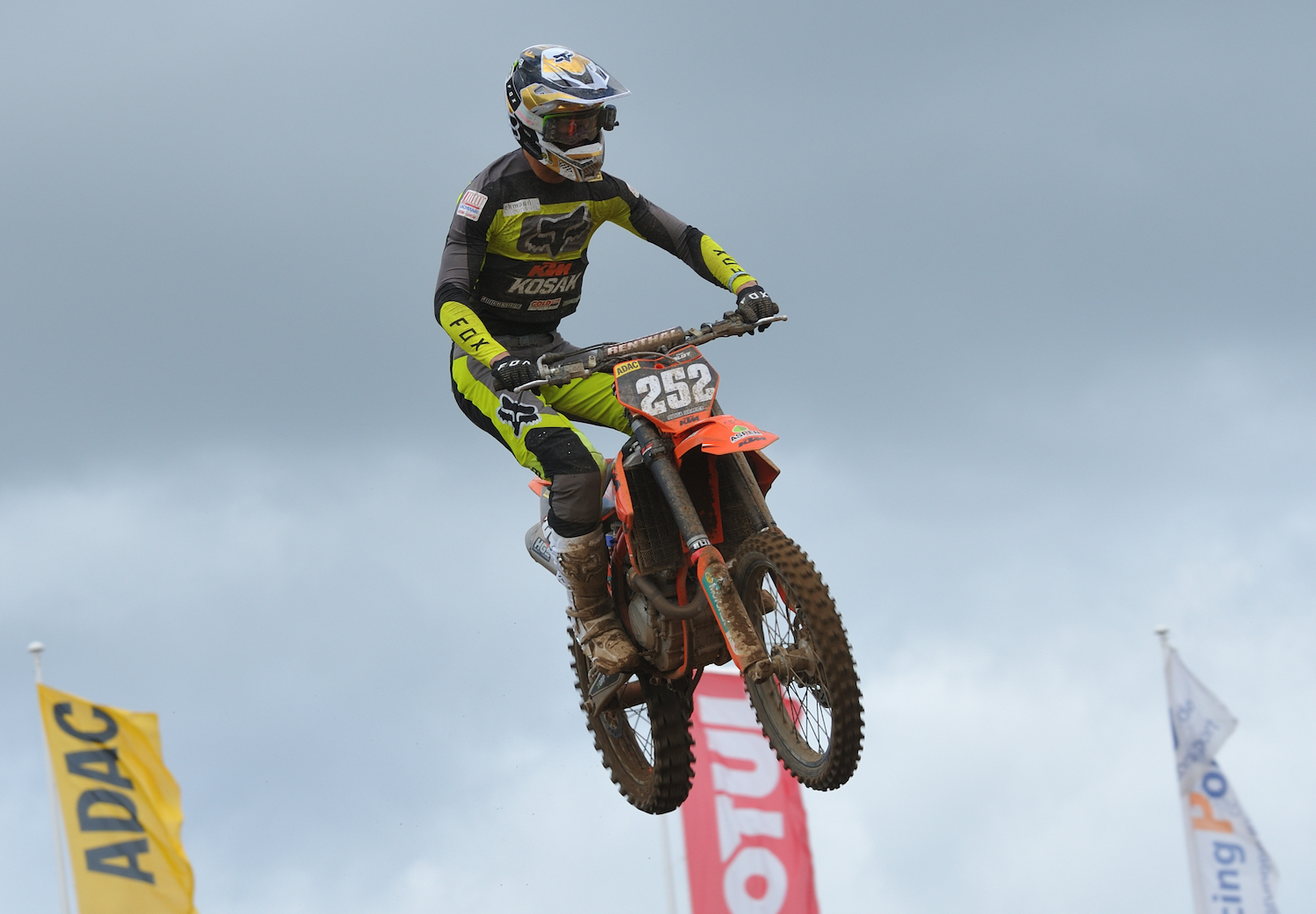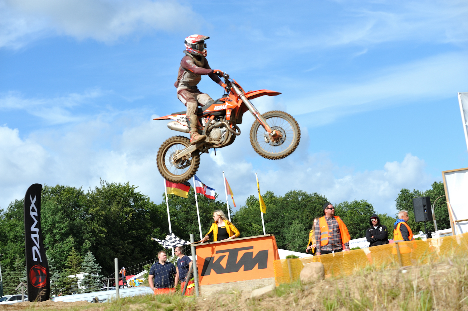 Für den Teamfahrer Tom Koch war die Strecke in Tensfeld durch vorangegangene Veranstaltungen bekannt. Sein erklärtes Ziel war es, seinen dritten Platz zu verbessern, aber mindestens zu halten. Dass er dazu in der Lage ist, zeigte er im Zeittraining mit der zweitschnellsten Zeit aller beiden Trainingsgruppen. Bei idealem Wetter, sonnig, aber nicht zu heiß, wurde am Samstagnachmittag das erste Rennen gestartet. Tom Koch war sofort in der Spitzengruppe dabei und fuhr ab der dritten Runde auf Platz drei, den er bis zum Ziel nicht mehr abgab. Dazu Tom Koch: „Der Start war gut. Ich habe aber zu lange gebraucht bis ich überholen konnte. Irgendwie hat mir dann auch ein bisschen der Rhythmus gefehlt um an die Führenden ran zu kommen“. In der Nacht zu Sonntag hatte es leicht geregnet und dadurch den Kurs staubfrei, aber rutschiger gemacht. Tom Koch kam wieder gut aus dem Startgatter, lag schnell auf der vierten Position, die er aber bis zum Rennende nicht verbessern konnte. Auch in das dritte Rennen klappte der Start für Tom gut. Schnell hatte er sich den dritten Platz gesichert und brachte ihn mit 15 Sekunden Vorsprung ins Ziel. „Ich denke das war meine beste Fahrt an diesem Wochenende. Ich muss bei den nächsten Rennen versuchen, nicht zu viel Zeit beim Überholen zu verlieren, damit ich an den Führenden dran bleiben und gar noch attackieren kann. Mit dem dritten Platz in der Gesamtwertung bin ich aber zufrieden“, fasste Tom seine Rennen in Tensfeld zusammen. Tom Koch bleibt in der ADAC MX Masters Wertung weiterhin auf dem dritten Rang, den er bis zum Saisonende noch verbessern möchte. An Sommerpause ist für den Thüringer nicht zu denken. Am kommenden Wochenende steht er im nordböhmischen Loket bei einem WM Rennen hinter dem Startgatter.