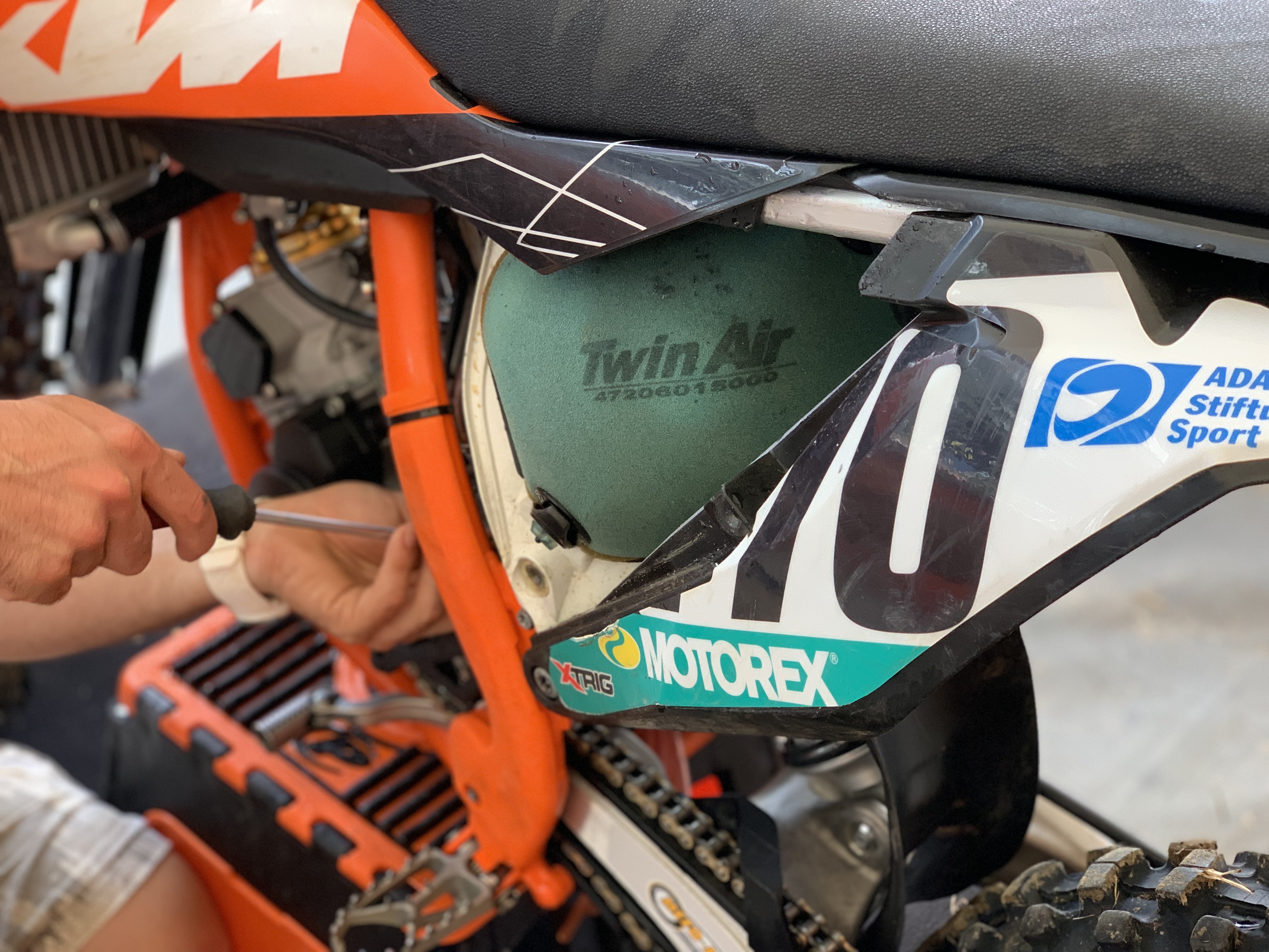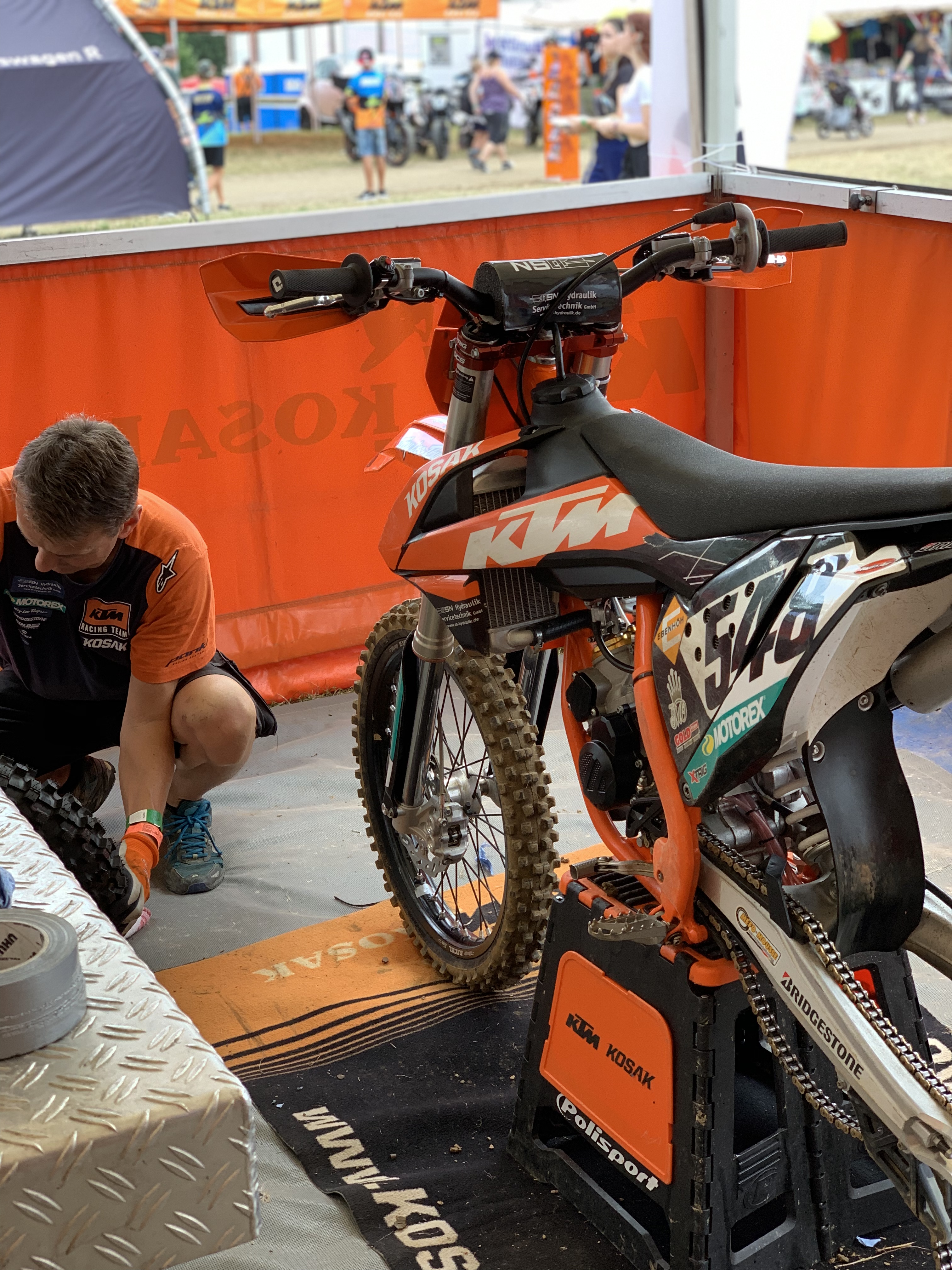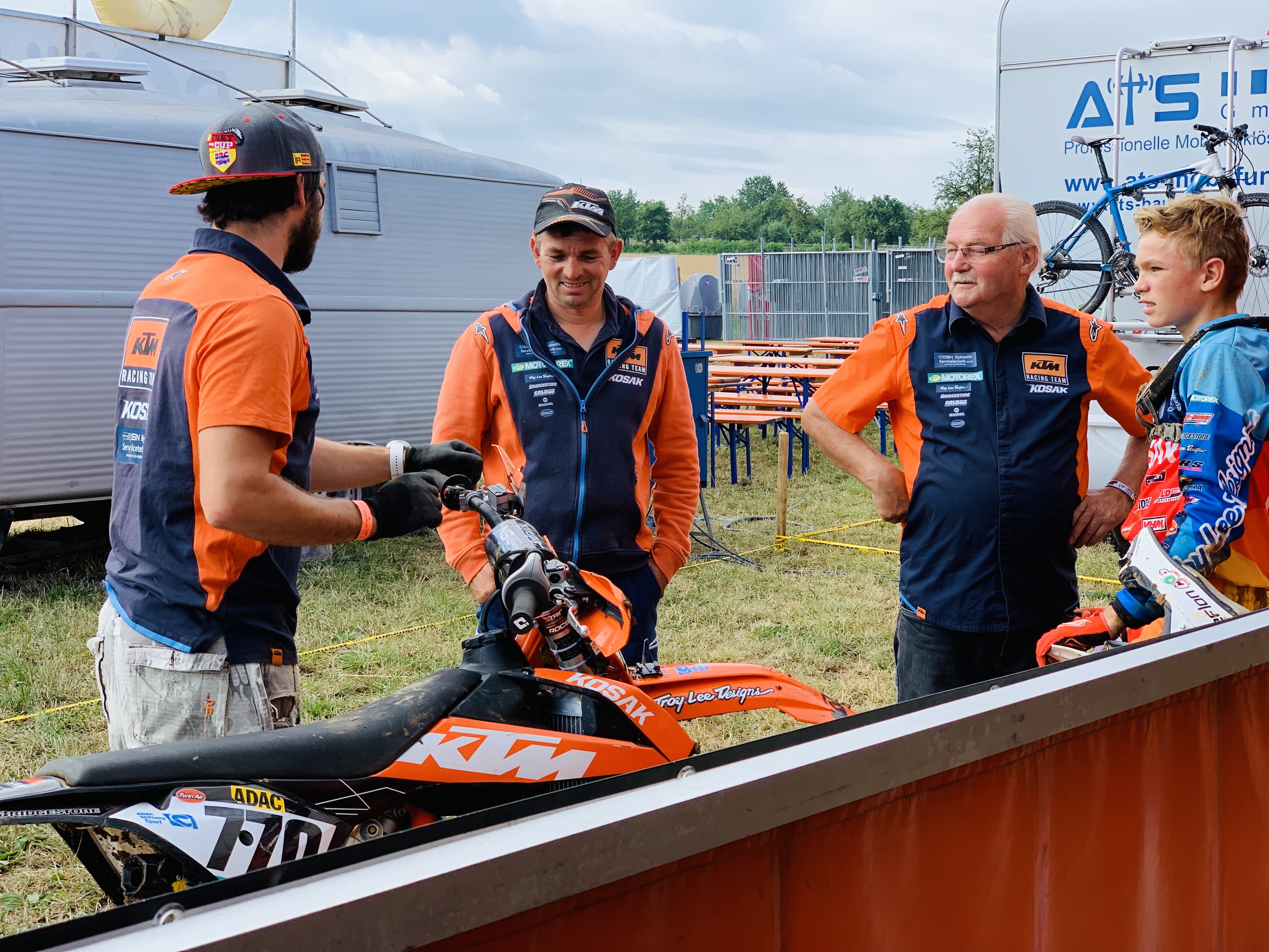 Mit unterschiedlichen Ergebnissen waren die Fahrer vom KTM Kosak Racing Team am vergangenen Wochenende im Norden und Süden der Republik unterwegs. Auf der Tiefsandstrecke in Tensfeld versuchte Mike Stender sein zweites Heimspiel nach Mölln erfolgreich zu gestalten. Mit dem zehnten Platz in der Qualifikation schaffte er den direkten Einzug in die Hauptrennen. Als Dritter kam der Eutiner im ersten Lauf aus der Startrunde zurück. Aber irgendwie kam er nicht so richtig in Fahrt und wurde nach seiner langen Verletzungspause im dem wieder sehr stark besetzten Fahrerfeld Neunter. „ Damit kann ich leben. Für das wenige Training im Sand und meine Verletzungen, die ich in diesem Jahr schon hatte, ist der neunte Platz ok, “ sagte Mike am Ende des Tages. Für den zweiten Durchgang hatte er sich mehr vorgenommen. Doch das Rennen war für Mike schon nach wenigen Metern zu Ende. Durch andere Fahrer, die zu Fall kamen, blieb er auch hängen. Mit einem verbogenen Kühler und einem abgerissenen Kühlerschlauch konnte er frustriert das Rennen nicht fortsetzten. Nun hat er am zweiten August Wochenende in Gaildorf die Chance seine gute Form in Punkte umzusetzen.