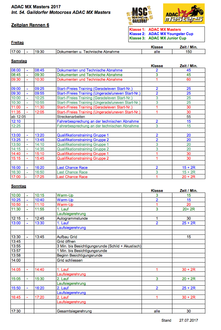 Das Finale der diesjährigen Baden-Württembergische ADAC/ DMV Jugend-Motocross-Meisterschaft (BW-Cup) 2017 findet beim MSC Gaildorf statt. Mit dabei sind zahlreiche Fahrer in fünf Klassen. Mehr Informationen zur Veranstaltung gibt es auf der Website vom MSC GAILDORF