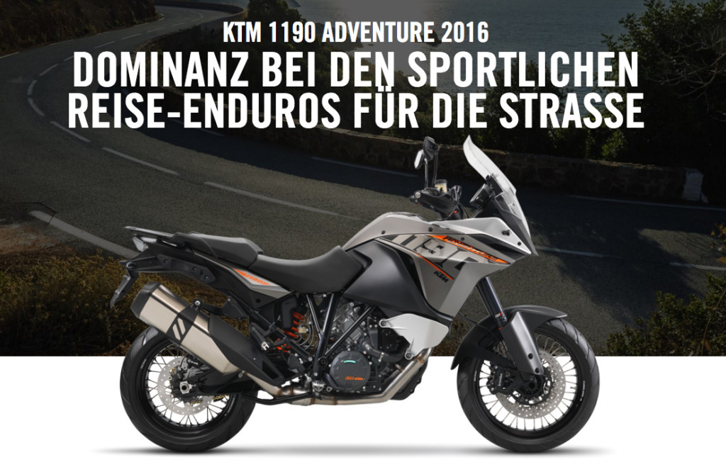Bereits in dem ersten Modelljahr setzte KTM mit der neuen 1190 Adventure Maßstäbe im Reise-Enduro-Segment. Bereits 2014 wurde die 1190 Adventure gemeinsam mit ihrer Schwester „R“ zum derzeit sichersten Motorrad der Welt gemacht – bei ungetrübtem Fahrspaß. Sie war das erste Motorrad mit der neuen Motorrad-Stabilitätskontrolle MSC (Motorcycle-Stability-Control) von Bosch. MSC ergänzt das bisherige Paket aus schräglagenabhängiger Traktionskontrolle und einem ABS mit Kombinationsbremsfunktion um eine Weltneuheit: das erste schräglagenabhängig regelnde Kurven-ABS. Wie bisher setzt sie Maßstäbe im Reise-Enduro-Segment: 150 PS Leistung bei nur 230 kg Gewicht im vollgetankten Zustand gipfeln in einem für diese Klasse unerreicht niedrigen Leistungsgewicht und damit in unerreichter Fahrdynamik. Dabei ermöglicht der starke, sparsame und kultivierte Motor entweder besonders entspanntes und souveränes Fahren oder bei Bedarf supersportlichen Vortrieb – inklusive aller denkbaren Zwischenstufen. Das Fahrwerk stellt der Leichtigkeit hervorragende Geometrie und eine fantastische Federung zur Seite, was gemeinsam mit den für die Klasse der Reise-Enduros völlig neuen Reifen ungeahntes Fahrvergnügen unter allen Bedingungen und gewünschten Geschwindigkeiten von ganz entspannt bis ganz, ganz schnell ermöglicht.