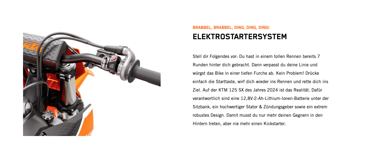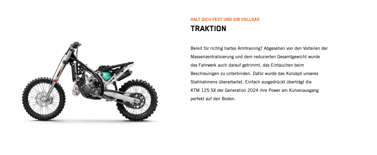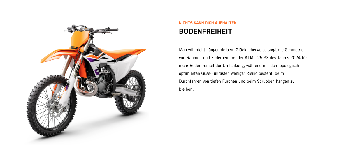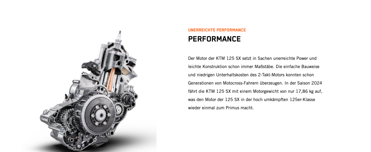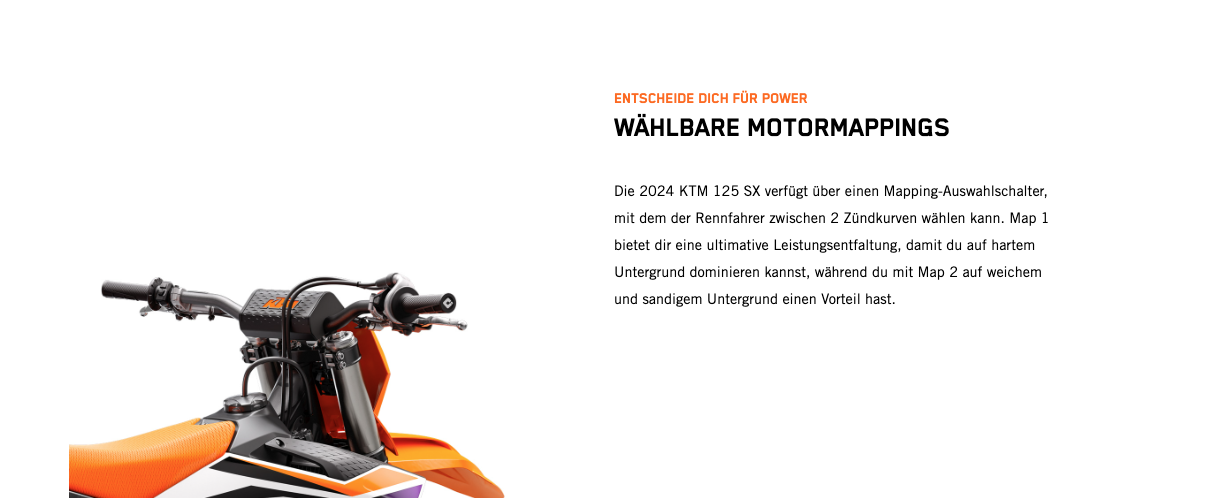 Eine aggressiv genommene Böschung reicht, um zu wissen, dass die KTM 125 SX der Generation 2024 in der 125er-Klasse einer der Hauptanwärter auf den Thron ist. Ihr typischer 2-Takt-Klang wurde nicht nur mit einer elektronischen Kraftstoffeinspritzung verfeinert – auch alle anderen Komponenten dieses Motorrads profitieren von in dieser Klasse ungeschlagenen Weiterentwicklungen. Die KTM 125 SX darf sich mit Fug und Recht als Vorreiterin der 2-Takt-Motocross-Innovation bezeichnen. Und die 2024er-Ausgabe wird auch weiterhin in der 125er-Klasse aufräumen. Du musst nur die Starttaste drücken, Gas geben und Spaß haben