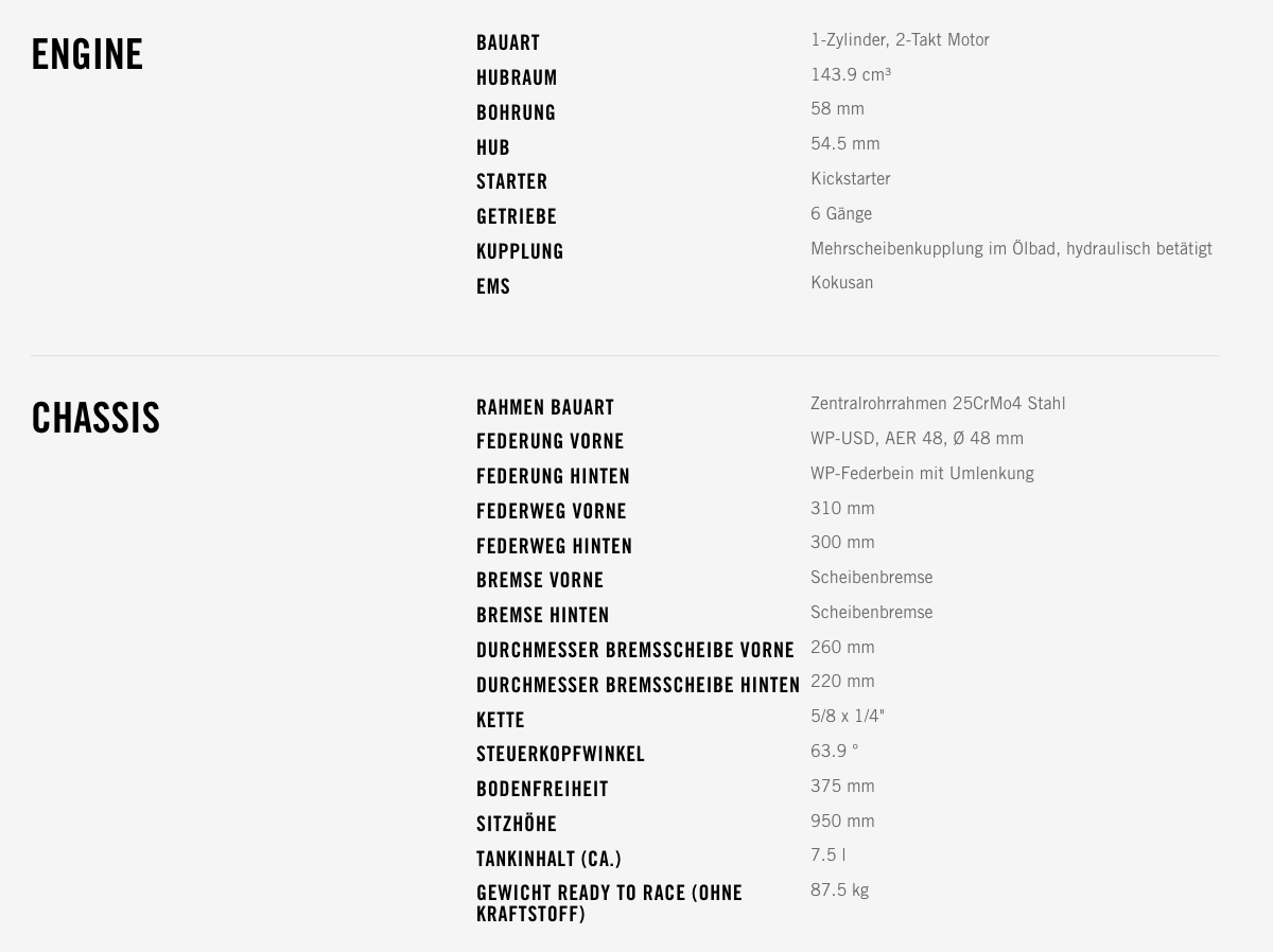 Der pure Nervenkitzel dieses Motors war Grund genug, um ihn weiterzuentwickeln und seine Produktion zu verlängern. Da er sich viele wichtige Komponenten mit dem klassenbesten 125er-Motor teilt, können der Zylinder, der Zylinderkopf und der Kolben in einen 125-cm³-Basismotor eingebaut werden, um ihn in einen KTM 150 SX-Motor zu verwandeln, ohne auch die Kurbelwelle tauschen zu müssen. Dieser innovative 2-Takt-Motor ist ein kompaktes, bärenstarkes und leichtes Kraftpaket, das perfekten Sinn ergibt.