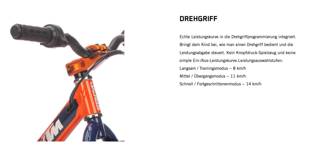 Das KTM REPLICA 16eDRIVE ist die perfekte Wahl für Kleinkinder, die etwas Erfahrung mit Laufrädern haben und etwas größer gewachsen sind und / oder Erfahrung mit den STACYC Stability Cycles haben und nun ein größeres Bike benötigen. Als optimale Größe sollte dein Kind eine Schrittlänge von 45 cm oder mehr haben, um bei leichter Kniebeugung einfach den Boden zu erreichen. Dein Kind sollte lernen, das Bike mit den Füßen anzuschieben, zu balancieren und ohne Unterstützung durch den Antrieb dahinzurollen.