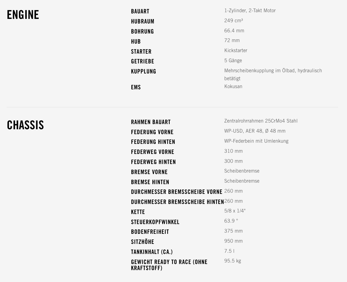 Von Leistungsgewicht bis hin zu Power und Kontrolle: Die KTM 250 SX bietet für alle Bedingungen die perfekte Kombination. Mit der neuesten Hochleistungs-2-Takt-Power und einem hochmodernen Fahrwerk lässt dieses Kraftwerk alle anderen 250er mit 2-Takt-Motor weit hinter sich. Dieses bewährte Renngerät ist die perfekte Wahl für all jene, die am melodiösen 2-Takt-Klang Gefallen finden und gleichzeitig eine schnelle Runde nach der anderen abliefern wollen.