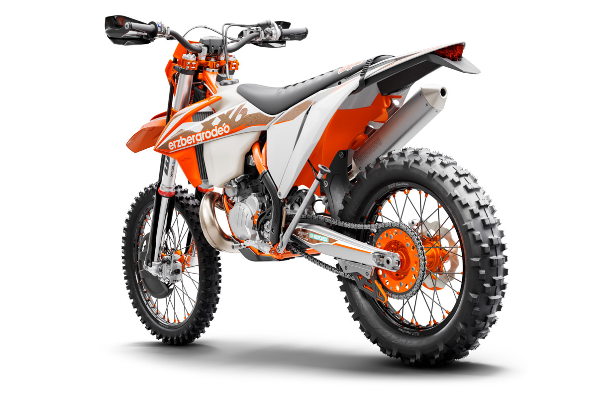 Die KTM 300 EXC war bei der extrem schnellen Weiterentwicklung im Extreme-Enduro-Sport schon immer federführend. Dieser wieselflinke, leichte Meister des technischen Terrains stellt sich jeder Herausforderung und ist das ultimative Arbeitsgerät, um den berühmten Eisernen Giganten zu bezwingen. Alle Exemplare der limitierten ERZBERGRODEO-Edition sind mit KTM PowerParts vollgestopft und kommen mit einem einzigartigen Grafikkit daher, welcher dieses legendäre Rennen hochleben lässt. Dieses Bike ist mit allem ausgerüstet, was du brauchst, um das extremste Enduro-Rennen der Welt zu bestehen, und wird dich auf deiner Reise zu neuen Enduro-Extremen treu begleiten.