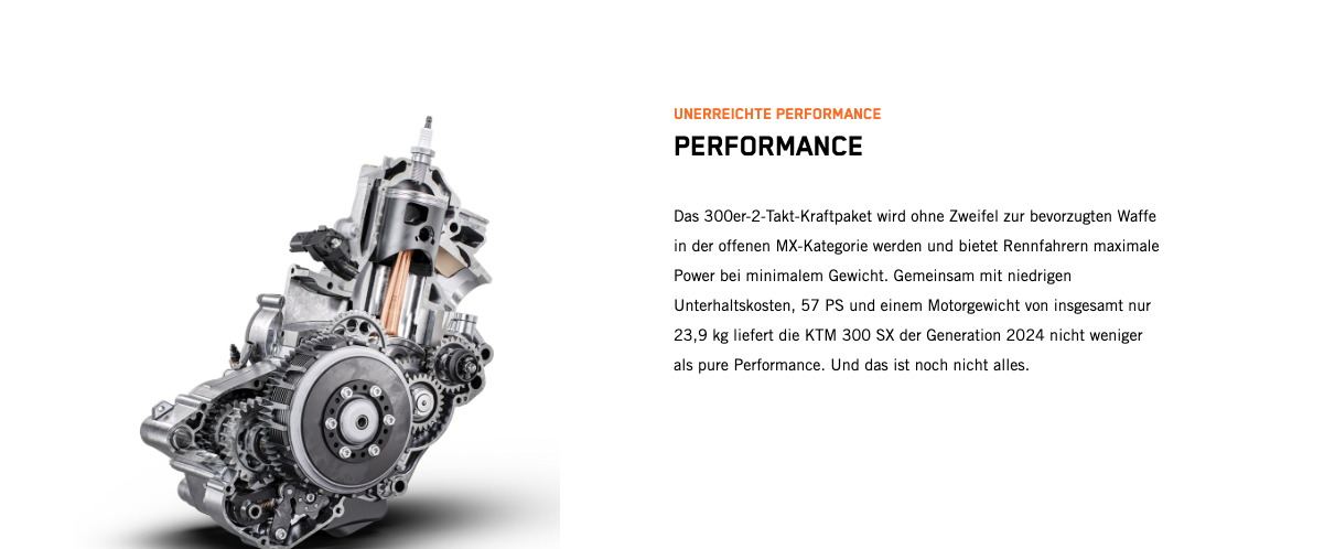 Maximale Power bei minimalem Gewicht, dazu geringe Unterhaltskosten und eine geschmeidige, lineare Leistungsentfaltung: Die KTM 300 SX der Generation 2024 wird der Konkurrenz in der offenen MX-Kategorie eine Lektion erteilen. Durch den Motor mit mehr als 57 PS und einem Gewicht von nur 23,9 kg setzt die KTM 300 SX des Modelljahres 2023 in Sachen Leistungsgewicht neue Maßstäbe. Krönt sich die KTM 300 SX des Jahres 2024 zum neuen Vorstand der offenen Klasse?