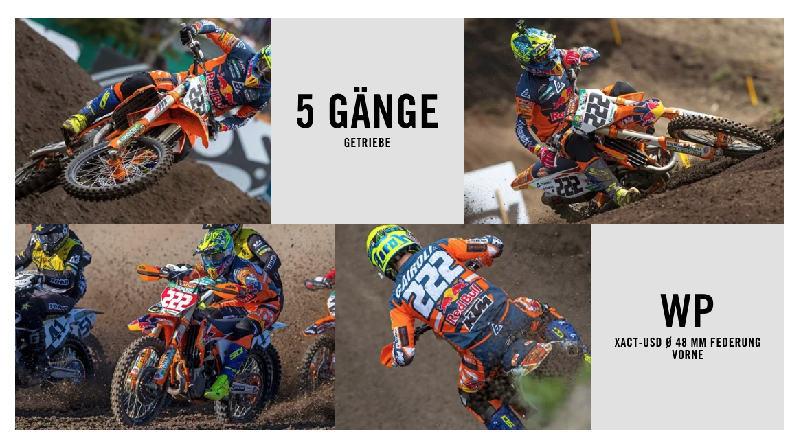 Die neue KTM 350 SX-F überzeugt auch weiterhin mit einer überragenden Mischung aus Leistung und Wendigkeit. Sie ist so leistungs- und drehmomentstark, dass sie 450ern Konkurrenz macht, ohne die Wendigkeit einer 250er zu verlieren. Wenn du dir mehr als nur einen Vorteil sichern willst, bietet dieses starke und leichte Renngerät ein dominantes Paket, das alles beinhaltet, was du brauchst, und unterstreicht dies mit zahlreichen Meisterschaftssiegen.