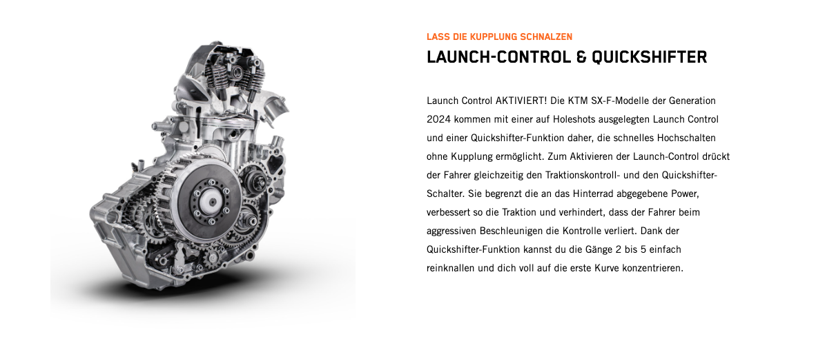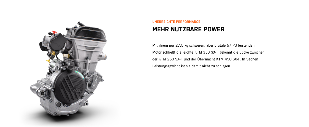 Im Laufe eines Jahrzehnts in den höchsten Klassen des Motocross-Rennsports (inklusive vieler Siege) hat die KTM 350 SX-F den Ruf des Underdogs längst abgelegt und sich zu einem würdigen Gegner entwickelt. Die KTM 350 SX-F der Generation 2024 stellt über das gesamte Drehzahlband eine gut nutzbare Power zur Verfügung, ist bei allen Geschwindigkeiten unglaublich spurstabil und hat mit ihrem READY TO RACE-Erbe das Zeug, Meisterschaften zu gewinnen.