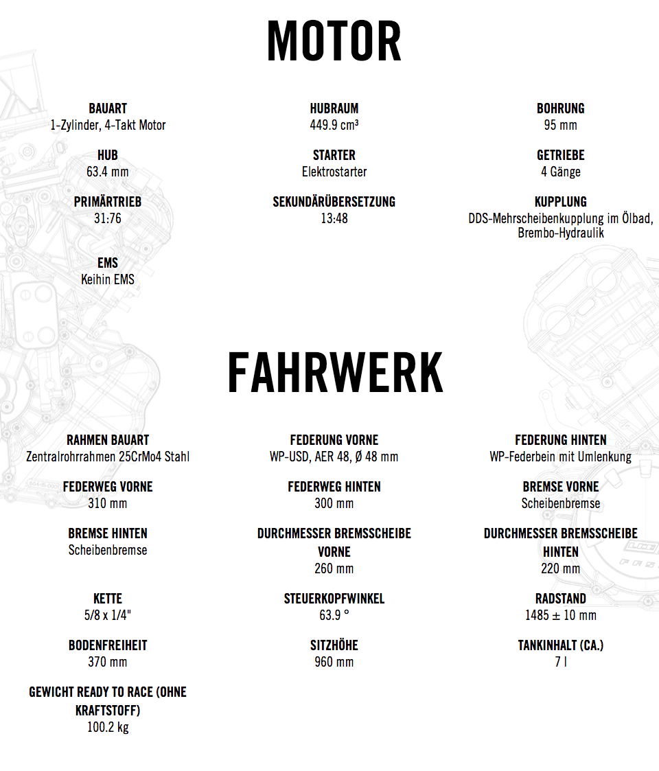 Das hochmoderne Keihin-Motormanagement mit elektronischer Kraftstoffeinspritzung verfügt über eine 44-mm-Drosselklappe. Dank der revolutionären Position des Einspritzventils spricht der Motor blitzschnell an. Und um dir das Leben noch weiter zu versüßen, stehen dir eigene Systeme für Kaltstarts und Leerlaufeinstellung zur Verfügung. Das leichte Steuergerдt verfügt über ein einzigartiges System für Traktionskontrolle und Launch-Control für blitzschnelle Reaktionen, wenn das Startgatter fällt, und bietet dank verschiedener Zündkurven, die auf den jeweils eingelegten Gang abgestimmt sind, maximalen Grip. Als speziellen Bonus kann der Fahrer eine noch stärkere Zündkurve mit Hilfe des am Lenker montierten Zündkurvenschalters entfesseln.