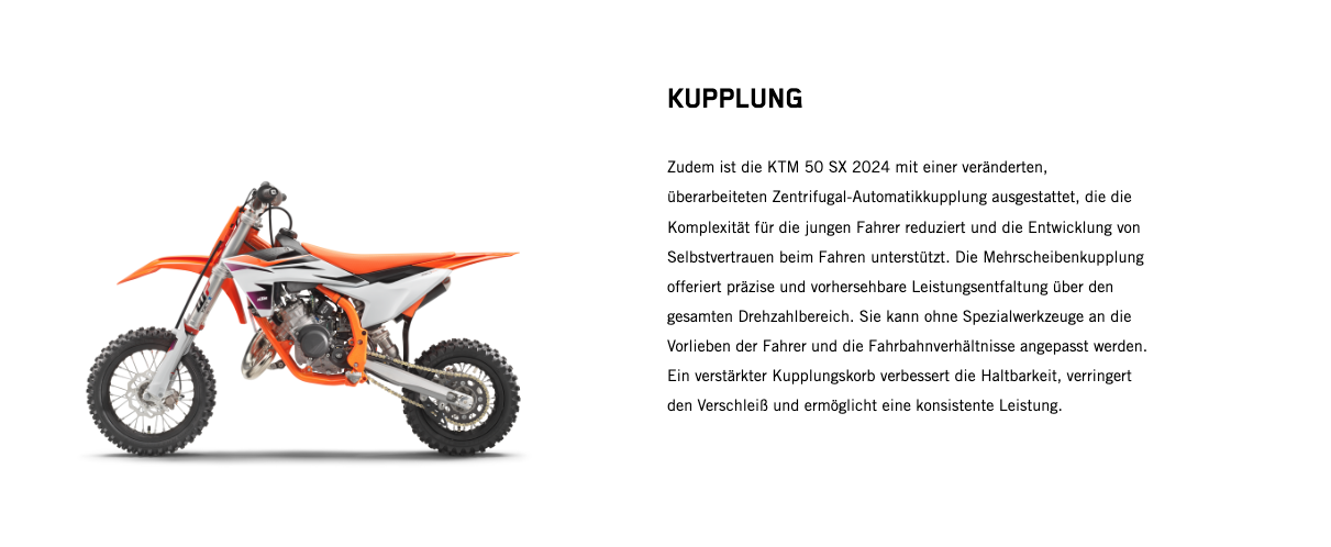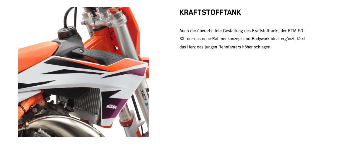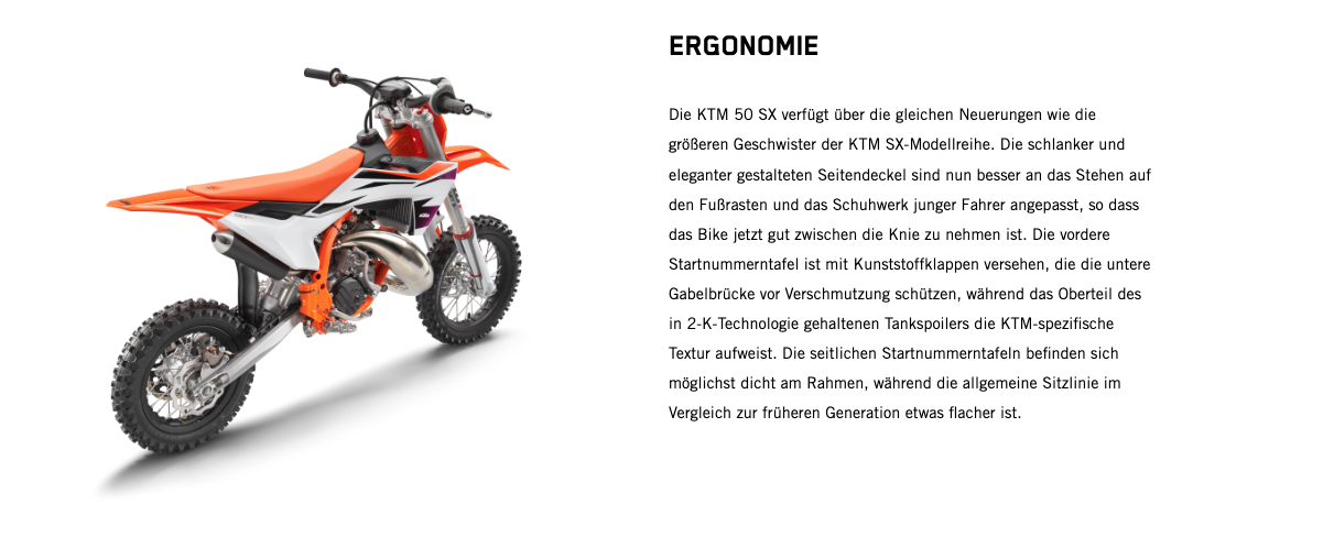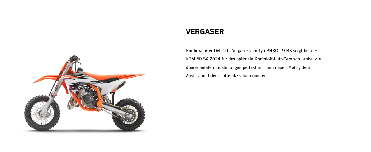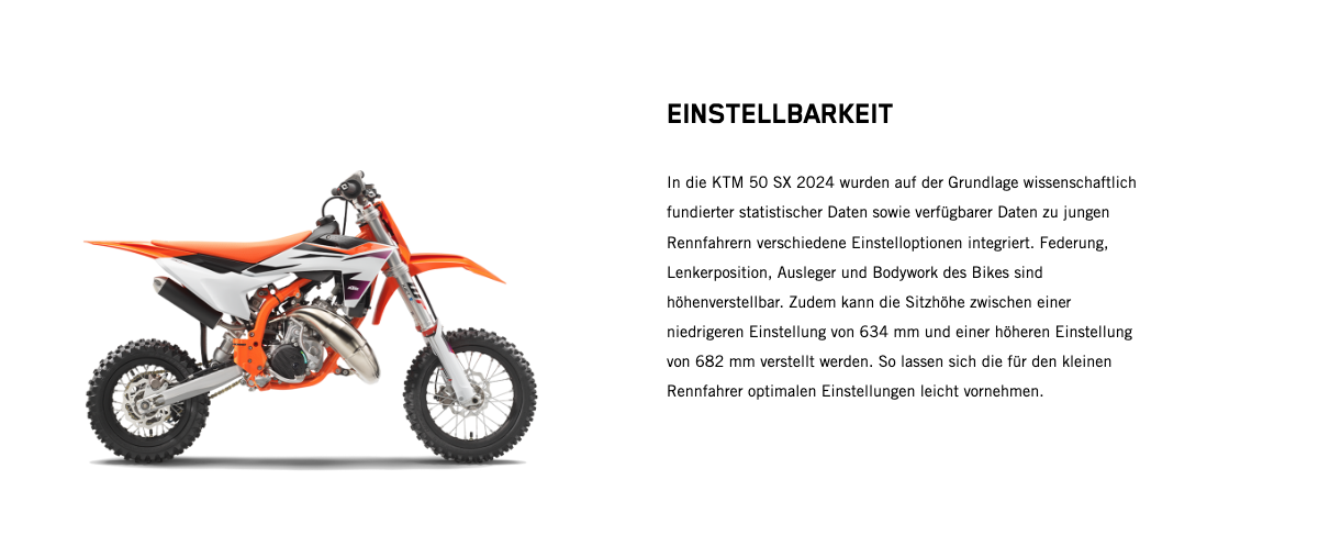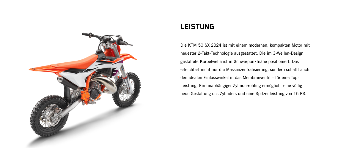 Wenn der nächste Schritt jener in die 50-cm³-Klasse ist, gibt es keine bessere Option als den Umstieg auf das leistungsstärkste 50-cm³-Bike. Zu den Highlights der KTM 50 SX 2024 gehören der robuste Stahlrahmen, ein leistungsstarker Motor, eine 35-mm WP XACT AER-Gabel, ein WP XACT-Federbein und ein modernes Formula Hydraulikbremssystem. Kurz: Dieses Bike ist der modernste READY TO RACE Mini-Crosser mit 50 cm³ Hubraum, der für deinen kleinen Rennfahrer erhältlich ist.