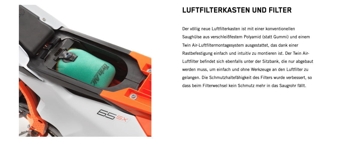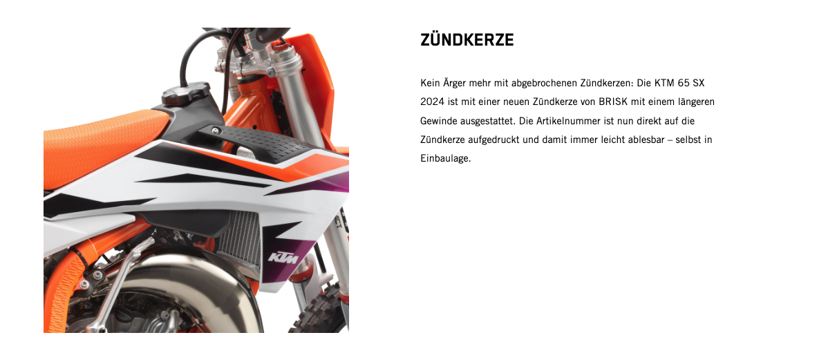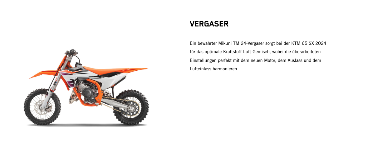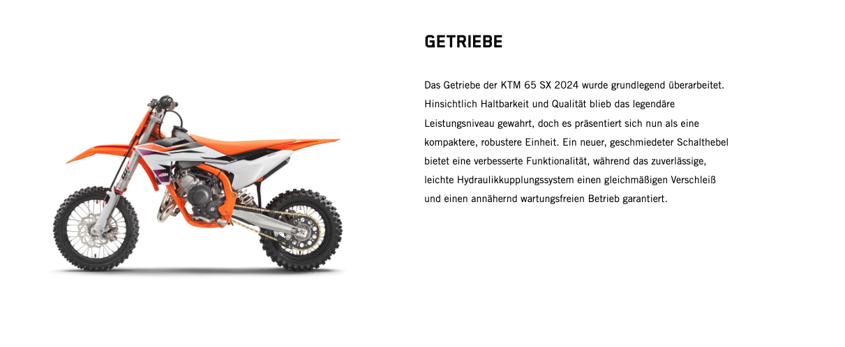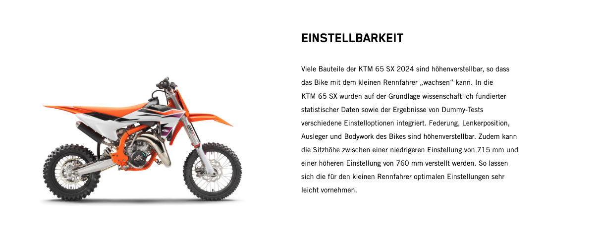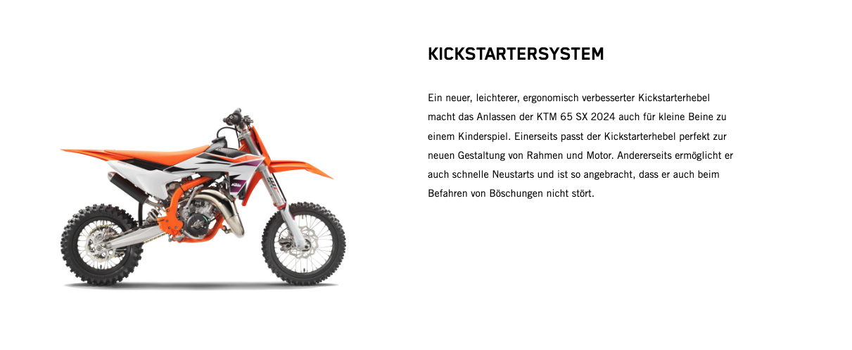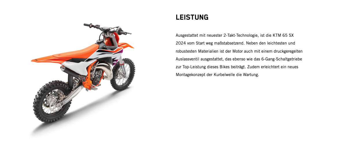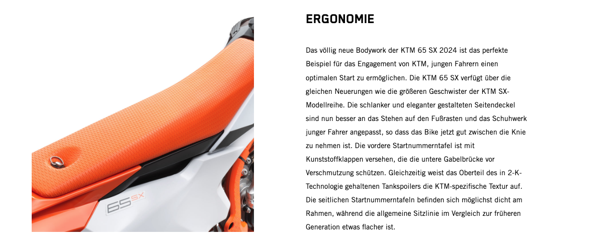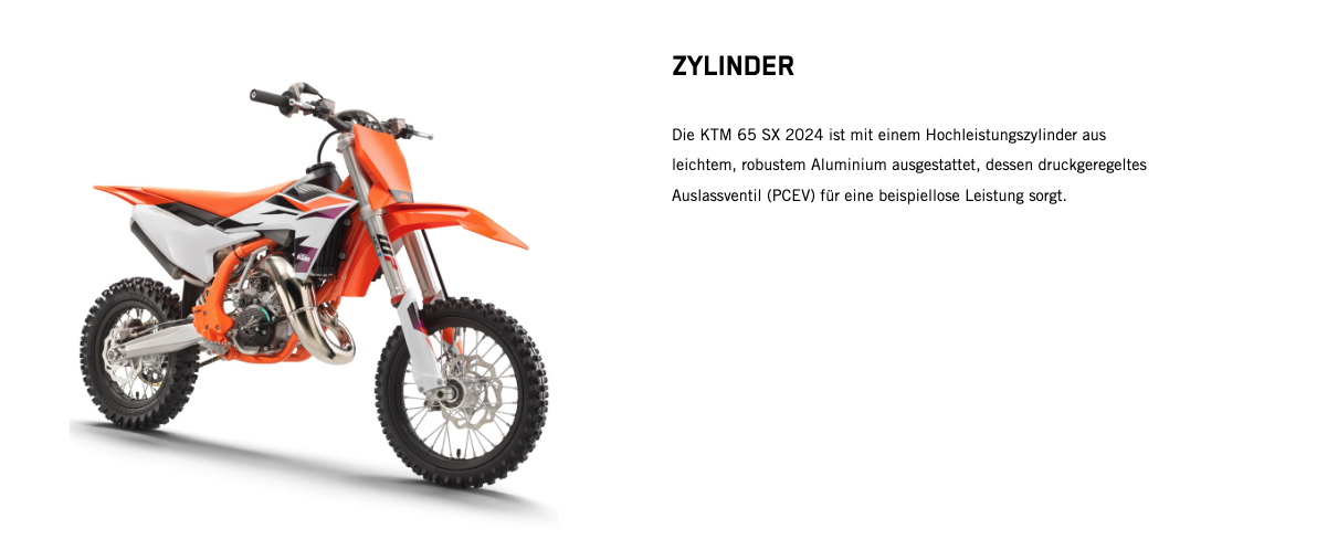 Wenn dein kleiner Rennfahrer READY TO RACE und bereit ist, den nächsten Schritt zu gehen, ist die vollausgestattete KTM 65 SX 2024 die einzige sinnvolle Option. Die neue KTM 65 SX ist schneller, leichter zu fahren und das ideale Sprungbrett in die nächste Rennklasse. Sie bietet die Qualität eines Full-Size-Motocross-Bikes, Highend-Bauteilen und ein einfach schaltbares Getriebe mit Hydraulikkupplung – ganz zu schweigen von dem 2-Takt-Premium-Kraftpaket mit seinem renntypischen Stallgeruch. Fazit? Dieser kleine Rennfahrer muss erst einmal geschlagen werden.
