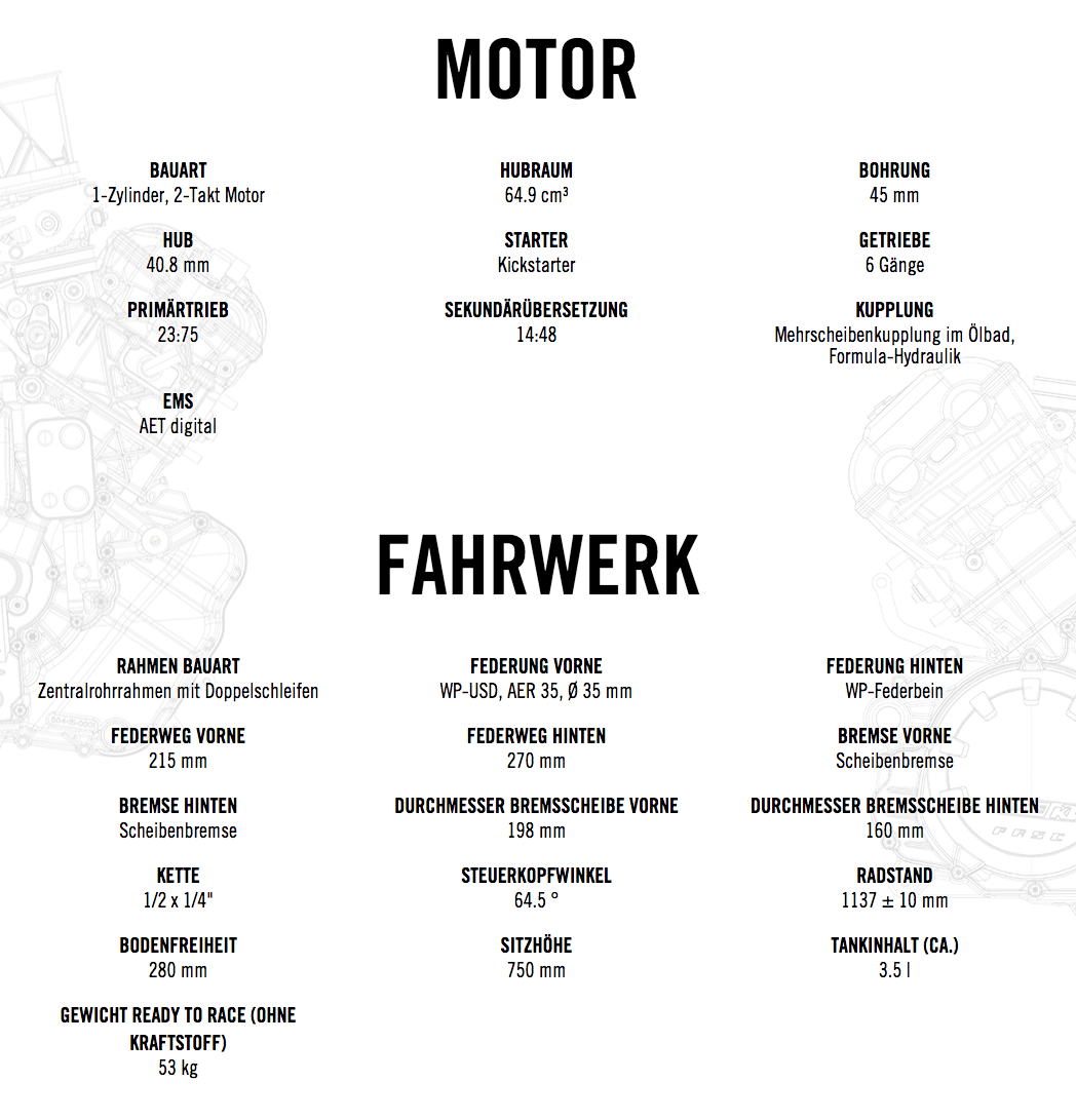 Die KTM 65 SX ist ein vollwertiges Sportgerät für junge Piloten zwischen 8 und 12 Jahren mit einer Körpergröße von bis zu 1,6 m. Der Musterschüler dieses Jahrgangs verfügt über eine revolutionäre Gabel vom Typ WP AER 35, coole Grafiken und zahlreiche Detailverbesserungen, welche neue Standards in Sachen Power, Fahrdynamik, Ausstattung und Verarbeitungsqualität bieten. Wie ihre größeren Schwestern ist auch die KTM 65 SX für ihre jungen Fahrer READY TO RACE.