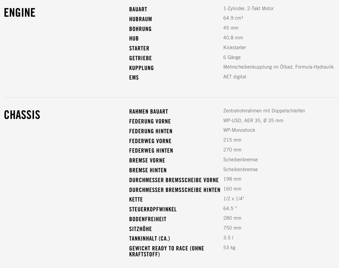 Die 65 SX zeichnet sich durch modernste 2-Takt-Technologie und ein einfach schaltbares 6-Gang-Getriebe mit Hydraulikkupplung aus. Der Zylinder mit seinem druckgeregelten Auslassventil bietet klassenbeste Power und jede Menge Drehmoment.