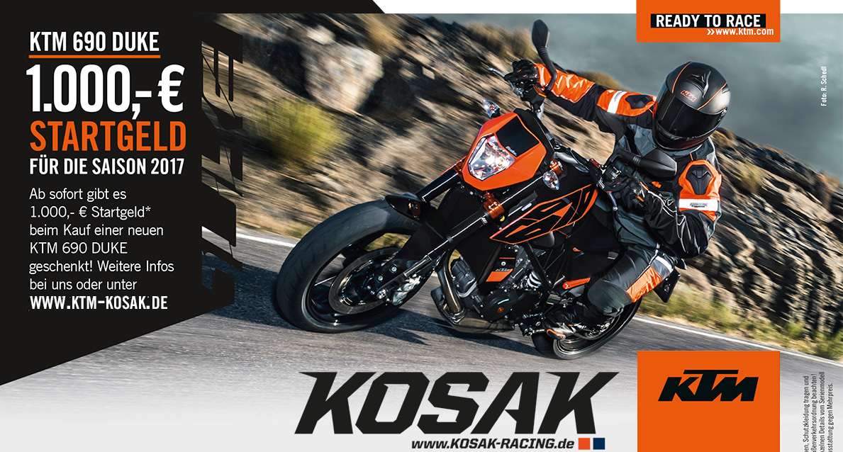 * bei Neufahrzeugkauf einer KTM 690 DUKE bis zum 01.07.2017 wird das Startgeld in Höhe von € 1.000,- (inkl. MwSt) mit dem Listenpreis verrechnet. Gültig ausschließlich für KTM 690 DUKE. Listenpreis KTM 690 DUKE, Modell 2017: 8.495,- € inkl. MwSt. zzgl. Nebenkosten.