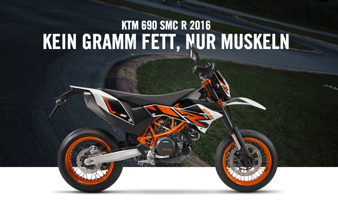 Was nicht dran ist, das wiegt auch nichts – nach dieser Devise ist die 690 SMC R gestrickt. Mit Doppelzündung, Ride-by-Wire-System, neuem ABS und überarbeitetem Fahrwerk geht sie noch durchtrainierter an den Start. Kräftig, sportorientiert und gleichzeitig bequem – was braucht der Drifter mehr zum Glück? KTM 690 SMC R: die konkurrenzlose Supermoto für härteste Anforderungen, die alle anderen hinter sich lässt – renntauglich, alltagstauglich, starkes Design, State-of-the-Art.