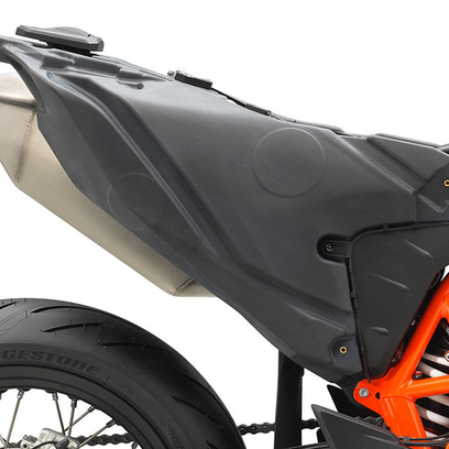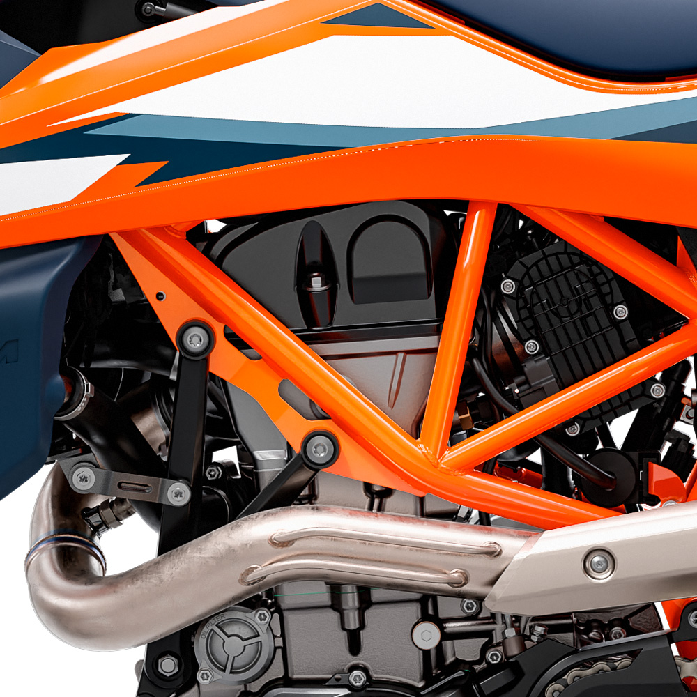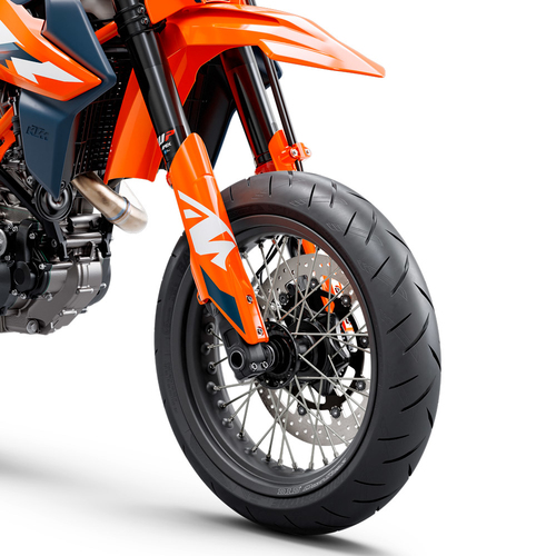 Die KTM 690 SMC R legt die Messlatte im Supermoto-Segment mit ihrem leichten Fahrwerk, dem legendären LC4-Motor mit 690 cm³ und ihrem ausgeklügelten Elektronikpaket noch einmal höher. Egal, ob du auf Bergstraßen oder deiner Lieblingsstrecke dicke schwarze Striche auf den Boden zauberst – du wirst mit einem fetten Grinsen und Adrenalin in deinen Adern in die Zukunft driften. Ihr Handling wird von der neuesten, voll einstellbaren WP APEX-Federung verbessert, damit du dich nur mehr auf die Straße vor dir konzentrieren und den Gasgriff voll herumdrehen musst.