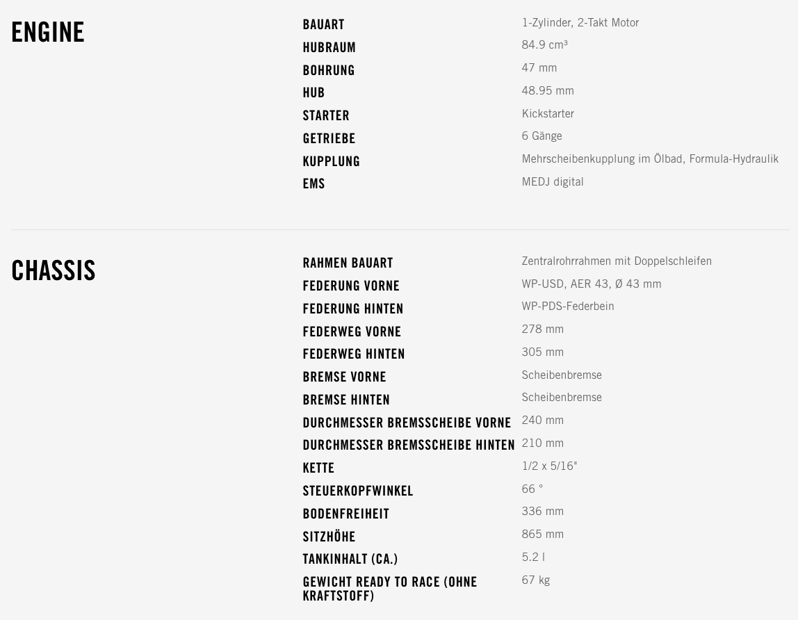 Für seine 85-cm³-Waffe hat KTM mit Erfolg ein Fahrwerk gebaut, welches nicht nur die Brutalität eines 15-Jährigen am Gasgriff wegsteckt, sondern auch leichtgewichtigen Newcomern der Klasse entgegenkommt. Und das schafft sie mit ihrem leichten, hochentwickelten Stahlrahmen. Dieser besitzt eine optimierte Biegecharakteristik, welche dem Fahrer ein großartiges Feedback gibt und hilft, harte Schläge zu absorbieren, während es gleichzeitig hervorragende Wendigkeit und Stabilität bei hoher Geschwindigkeit garantiert. Jedes Element wurde entwickelt, um perfekt mit dem Rest des Bikes zusammenzuarbeiten und ein unerreicht intuitives Fahrverhalten zu liefern.