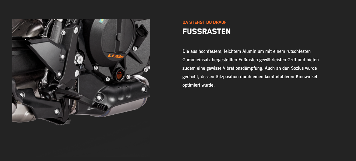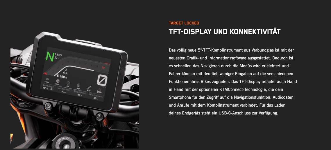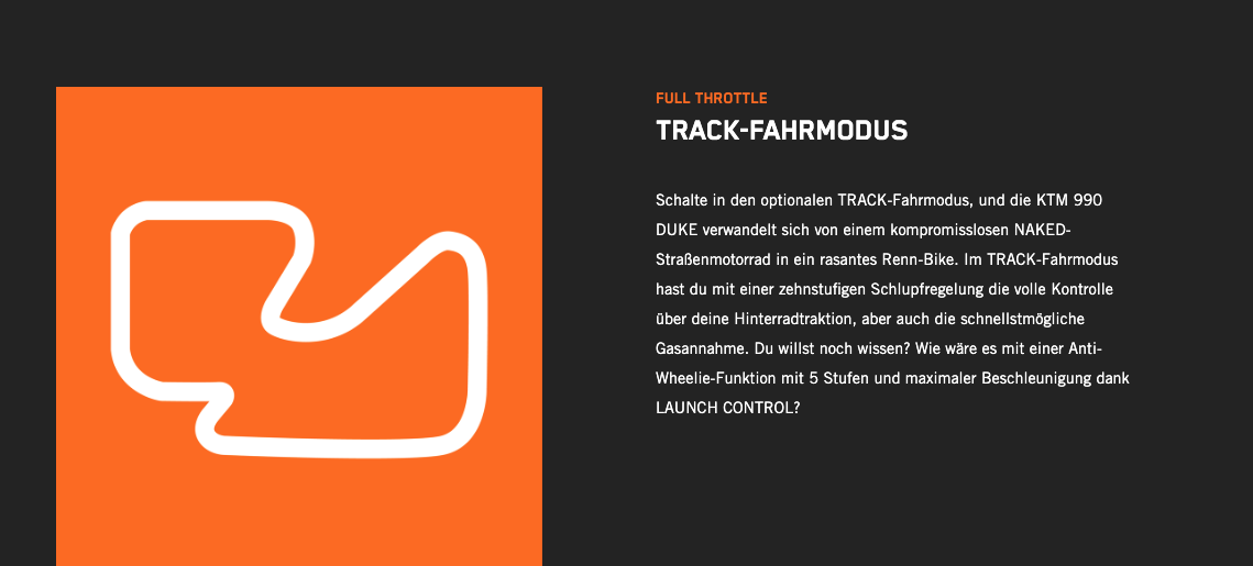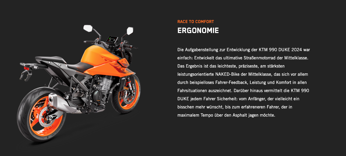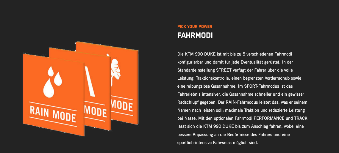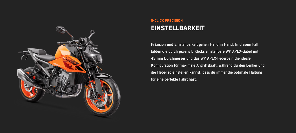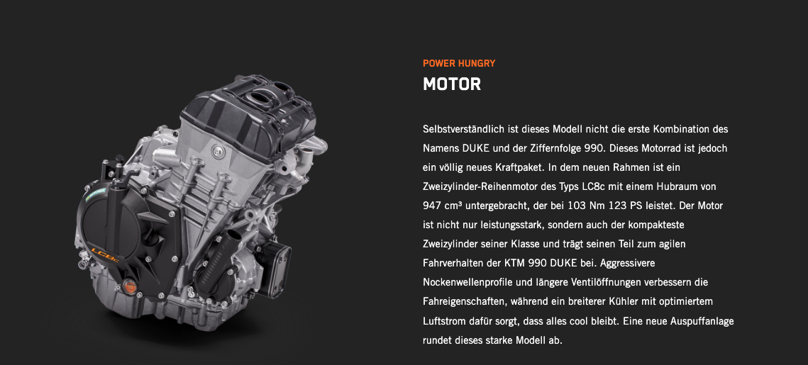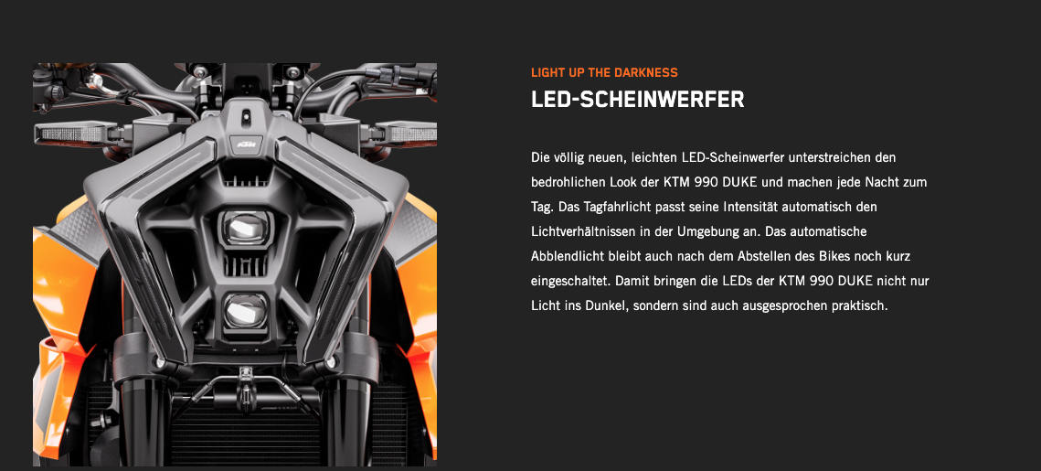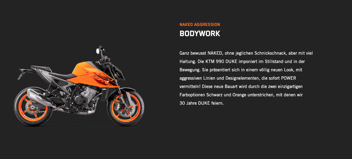 Die völlig neue KTM 990 DUKE trifft hochpräzise immer ins Schwarze. Mit 123 PS und 103 Nm in einem völlig neuen Rahmen, einer einstellbaren WP APEX-Federung und einer feinabgestimmten Elektronik ist sie das leichteste, schärfste und leistungsstärkste NAKED-Motorrad der Mittelklasse, das jemals den Namen DUKE getragen hat.