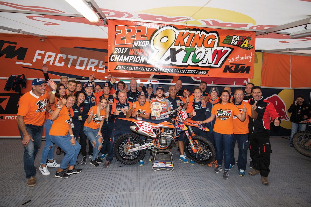 Pit Beirer (Motorsport-Direktor): „Wieder einmal hat die Cairoli-KTM-Kombination uns einen besonderen Moment in unserer langen Motocross-Historie beschert. Dieser Titel ist das Ergebnis der harten Arbeit, die viele Leute investieren. Tonys Saison war fantastisch anzuschauen mit vielen Highlights und er hat bewiesen, dass er immer noch die Referenz in dieser Klasse ist und ein Vorbild für alle Kinder, die eines Tages die Spitze in diesem Sport erreichen wollen. Auch Jeffrey hat starke Leistungen gezeigt und insgesamt hätte die Saison 2017 für uns kaum besser laufen können. Schon bald werden wir uns Gedanken über die Saison 2018 machen, aber das gesamte Team verdient es, diesen Titel zu genießen.“