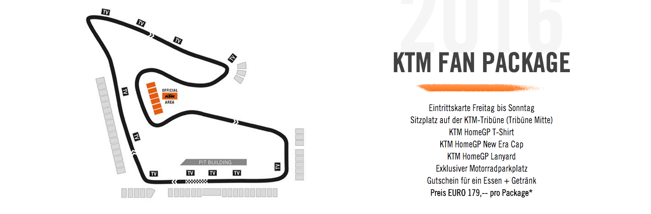 Vom 12. bis 14. August 2016 gastiert die Motorrad-Weltmeisterschaft wieder in Österreich. Erlebe mit dem KTM FAN PACKAGE am Red Bull Ring in Spielberg die Königsklasse des Motorradrennsports hautnah. Neben unseren Moto3-Werksfahrern wird auch das MotoGP-Bike von KTM den ersten öffentlichen Auftritt erfahren.