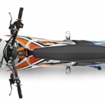 Ein permanentmagneterregter Synchronmotor in Scheibenläuferbauweise treibt die KTM FREERIDE E-SM an. Dieses verschleißarme, kompakte und schmale Kraftwerk erzeugt vom ersten Dreh am Griff 42 Nm Drehmoment und sorgt für eine gleichmäßige Kraftentfaltung. Der auf 16 kW (22 PS) Spitzenleistung ausgelegte Elektromotor darf 11 kW (15 PS) kontinuierlich abgeben. Auch bei hohen Außentemperaturen sorgt die Flüssigkeitskühlung des Motorgehäuses mit elektrischer Wasserpumpe für eine fehlerfreie Funktionsweise ohne Leistungseinbußen. Twist and Go. Keine Kupplung. Kein Schalten: Einfach am Griff drehen, losfahren und Spaß haben!