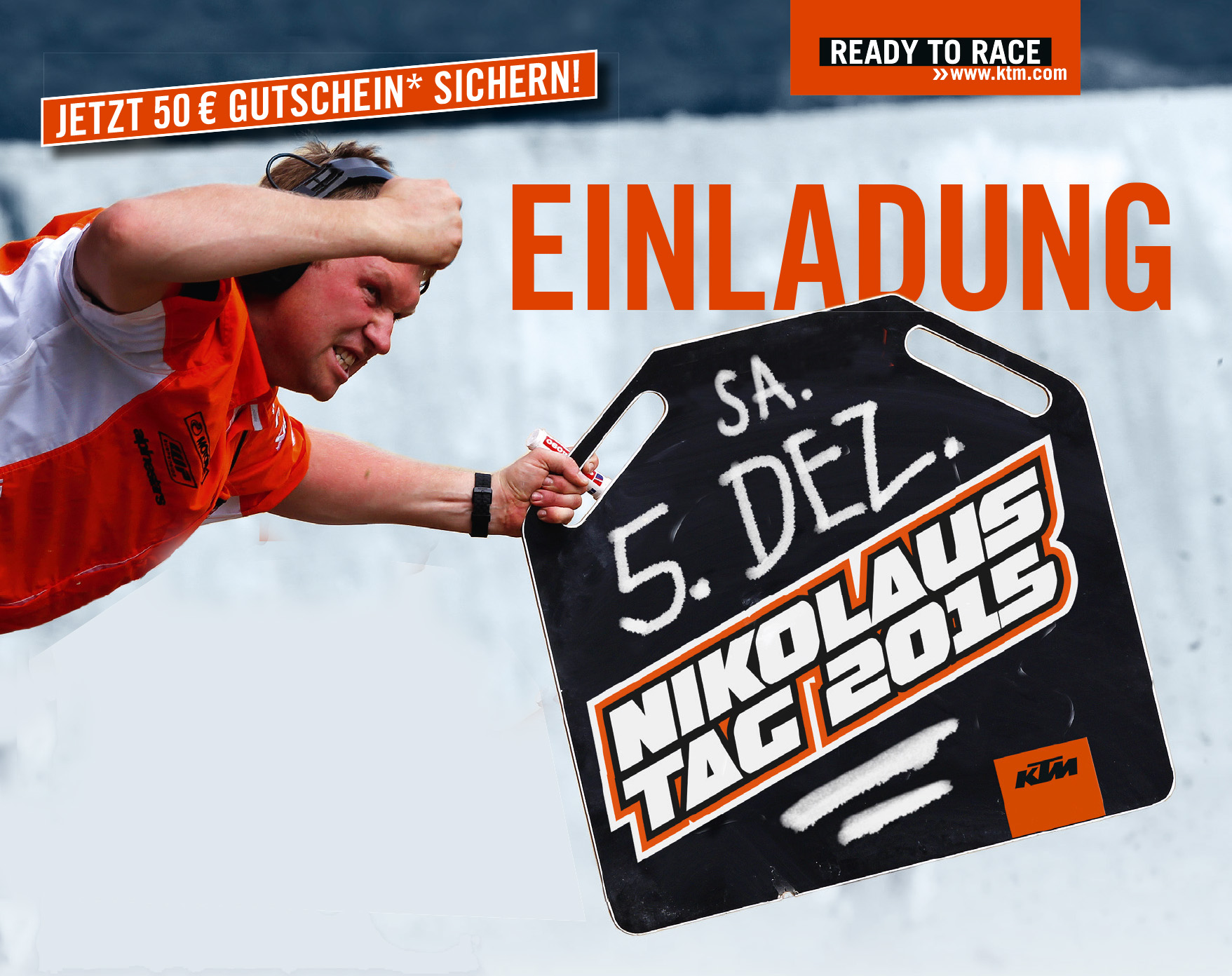 Raus aus der Winterstarre und besuchen Sie uns am 5. Dezember zum traditionellen KTM Nikolaustag! Um den Winter zu verkürzen, gibt es einen 50 € KTM Gutschein* für KTM Powerparts und KTM Powerwear. Bitte KTM Gutschein herunterladen und ausgedruckt mitbringen!