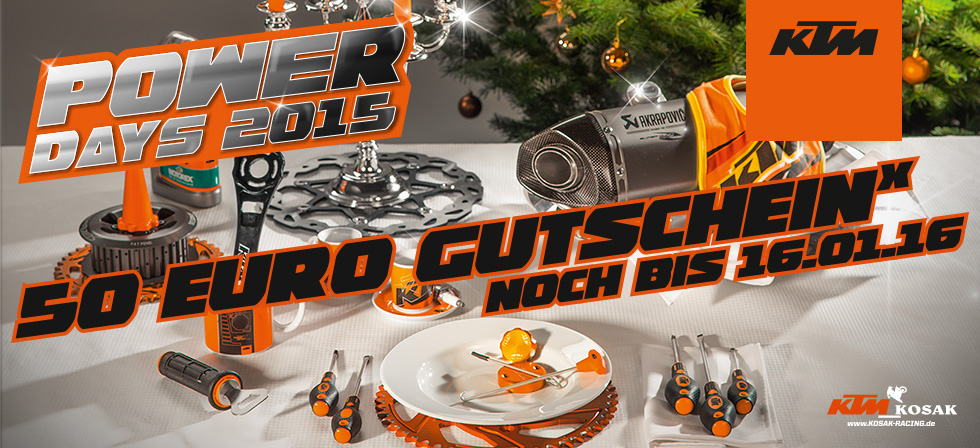 Hol dir jetzt noch deinen 50€ KTM Gutschein für KTM Powerwear und KTM Powerparts. Der Gutschein ist noch bis 14.01.17gültig! Bitte Gutschein herunterladen und ausgedruckt mitbringen!