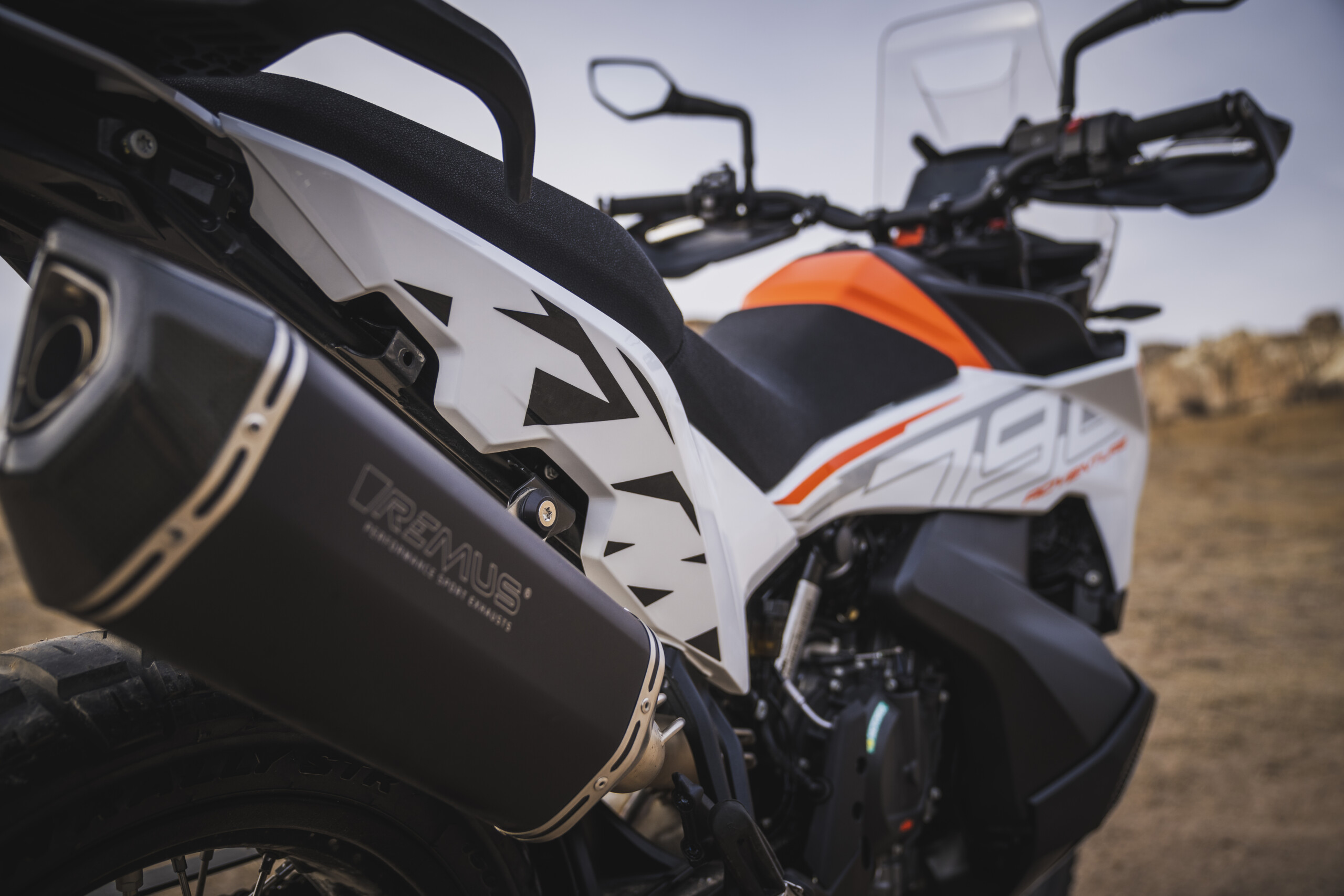 Die KTM 790 ADVENTURE 2023 ist nun bei konstanter Geschwindigkeit stabiler und liegt besser in Kurven, dank einer 20-prozentigen Steigerung der rotierenden Masse ohne Abstriche bei der ausgezeichneten Beweglichkeit des Motorrads. Die überarbeiteten Drosselklappenkörper sorgen dank der verbesserten Verbrennung für eine sauberere und effizientere Verbindung. Der Klopfsensor verbessert die Zündung und Verbrennung von niederoktanigem Kraftstoff – immens hilfreich, wenn auf Reisen die Kraftstoffqualität schwankt. Der überarbeitete, optionale Quickshifter+ ermöglicht schnellere Schaltvorgänge. Das Endergebnis lässt sich durch die allerneueste Auspuffanlage mit Katalysator und Vorschalldämpfer des Modelljahrs 2023 hören. Mit dieser größeren Änderung ist sichergestellt, dass diese lebhafte neue Generation der KTM 790 ADVENTURE die beste Wahl für Ausflüge innerhalb genauso wie außerhalb der Stadtgrenzen sein wird. Das Serviceintervall für das Bike beträgt 15.000 km.